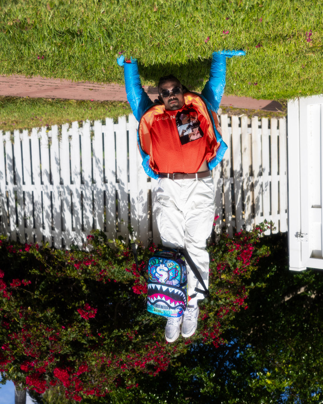 Dimensions: 18' x 6' x 11.5' • Front zipper pocket • Side pockets • Zippered Stash pocket • Separate velour sunglass compartment • Ergonomic mesh back padding • Adjustable Straps for custom sizing • Gold zippers with metal hardware • Metal 'Sprayground Authentic' badge • Slide through back sleeve connects to carry-on luggage to free your hands