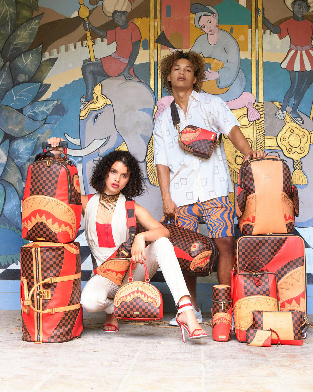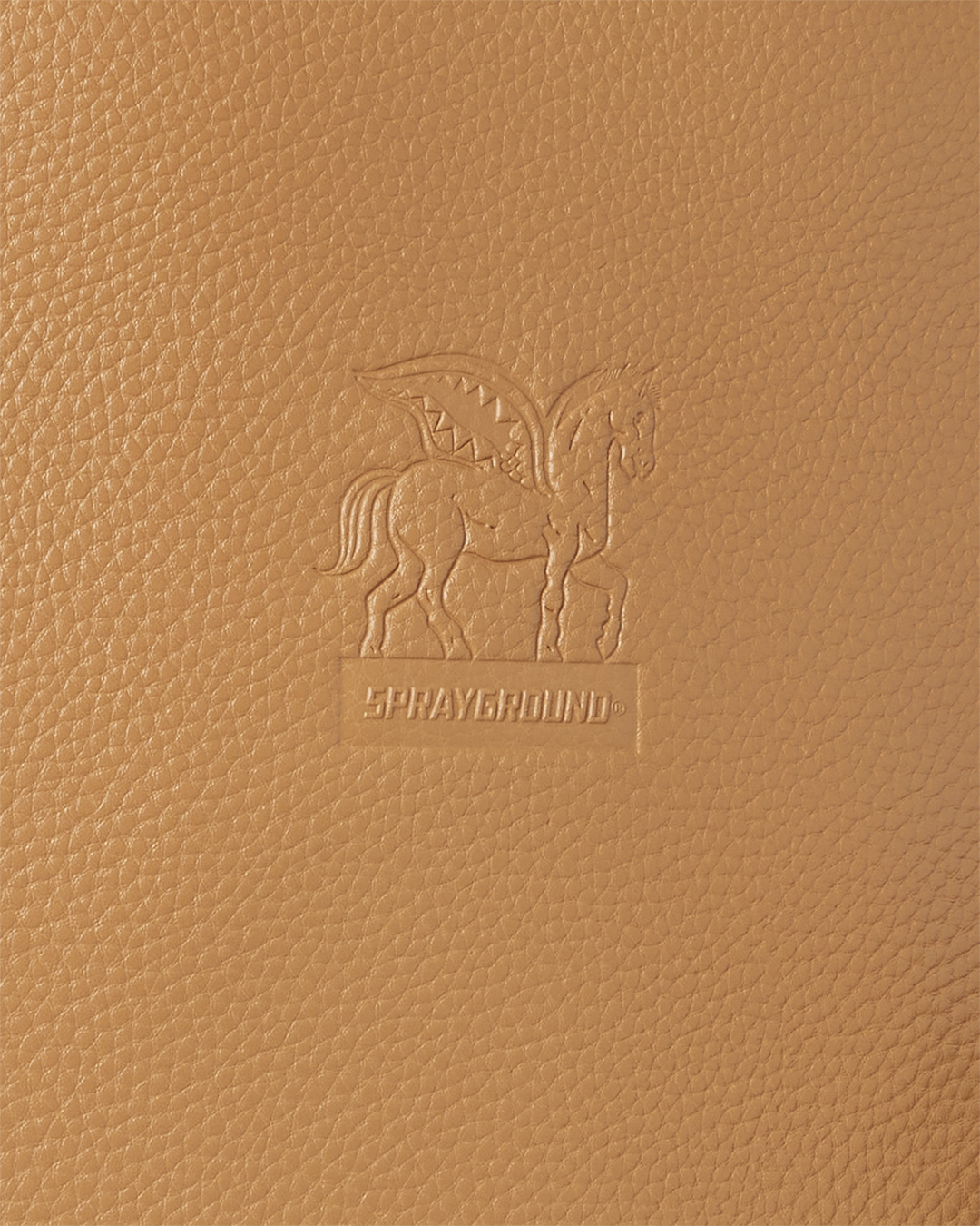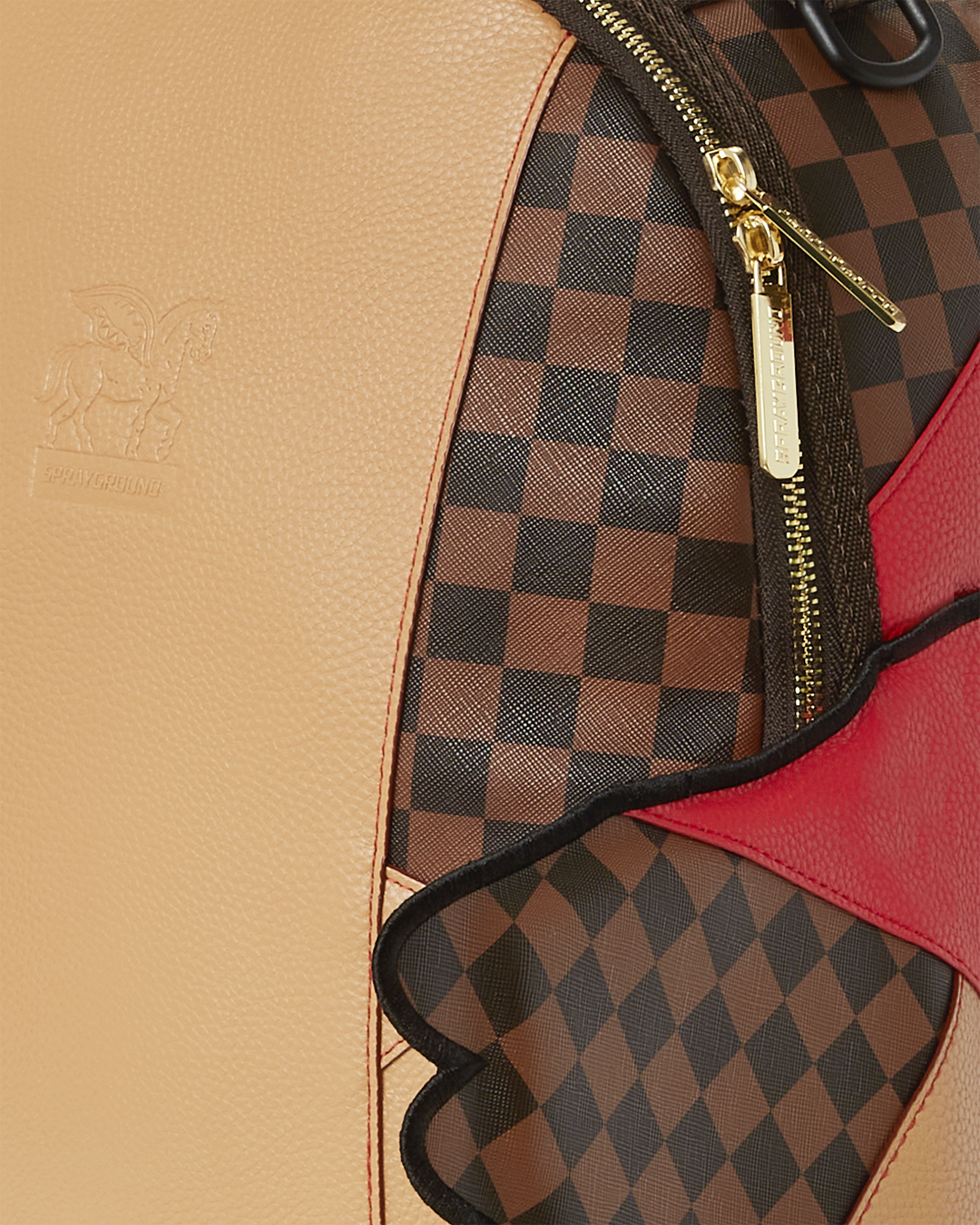 Dimensions: 18' x 6' x 11.5' • Front zipper pocket • Side pockets • Zippered Stash pocket • Separate velour sunglass compartment • Ergonomic mesh back padding • Adjustable Straps for custom sizing • Gold zippers with metal hardware • Metal 'Sprayground Authentic' badge • Slide through back sleeve connects to carry-on luggage to free your hands