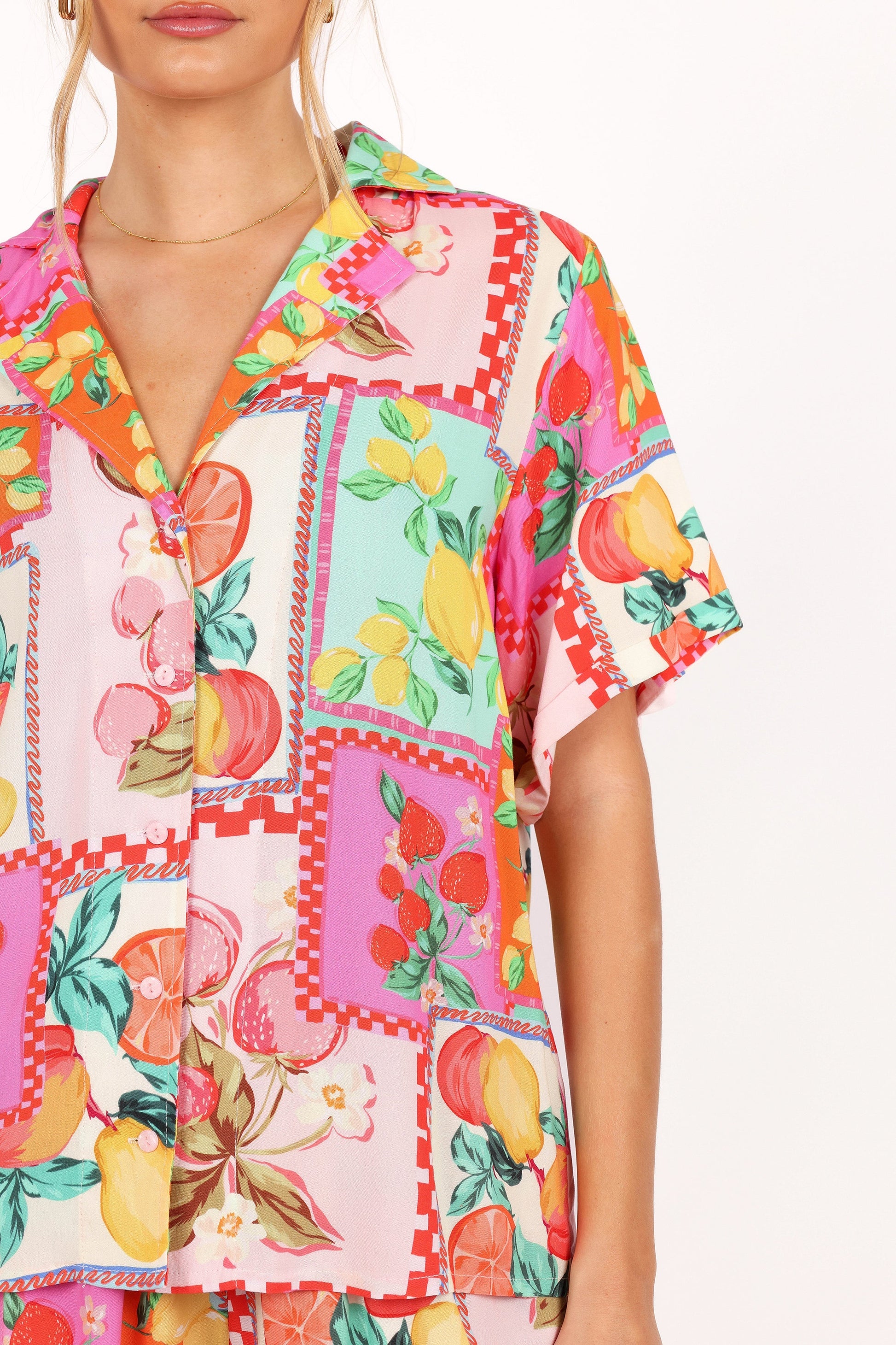 | DETAILS Heading on vacation? This top and shorts set is perfect for making a statement while relaxing in the sun! The top features a v neckline, spread collar, short sleeves, and functional button down front.