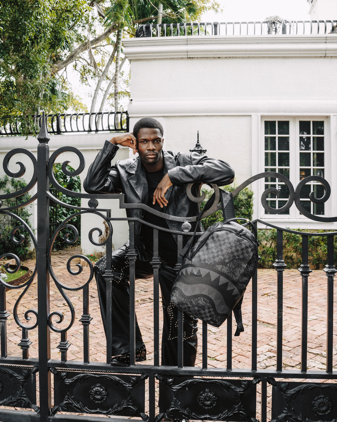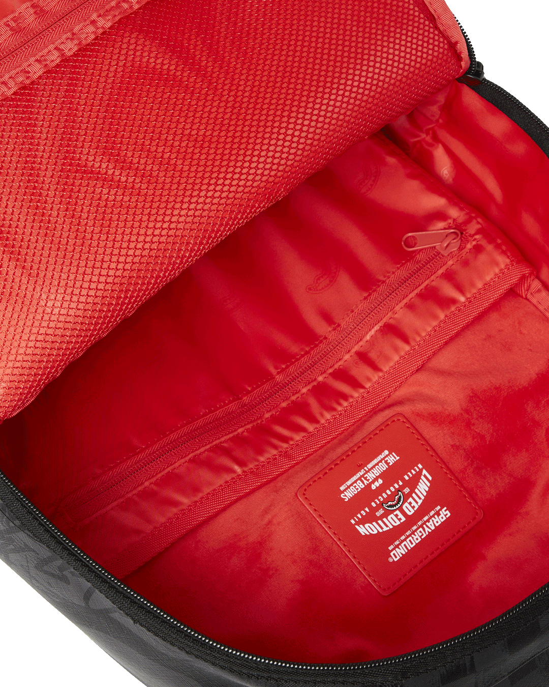 Dimensions: 18' x 6' x 11.5' • Front zipper pocket • Side pockets • Zippered Stash pocket • Separate velour sunglass compartment • Ergonomic mesh back padding • Adjustable Straps for custom sizing • Gold zippers with metal hardware • Metal 'Sprayground Authentic' badge • Slide through back sleeve connects to carry-on luggage to free your hands