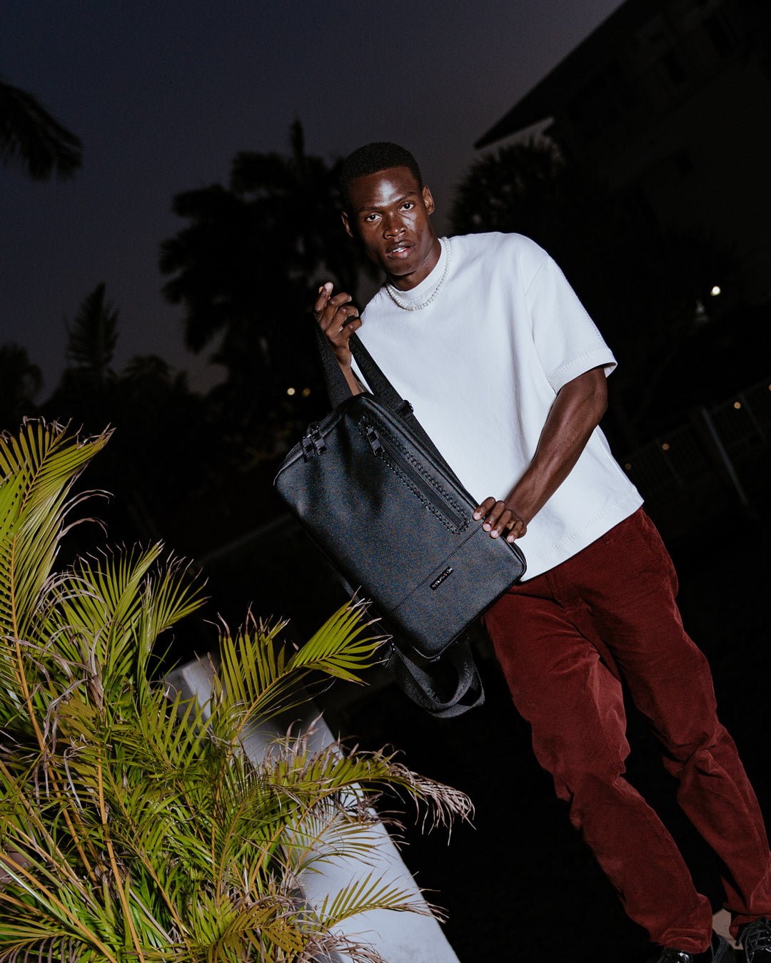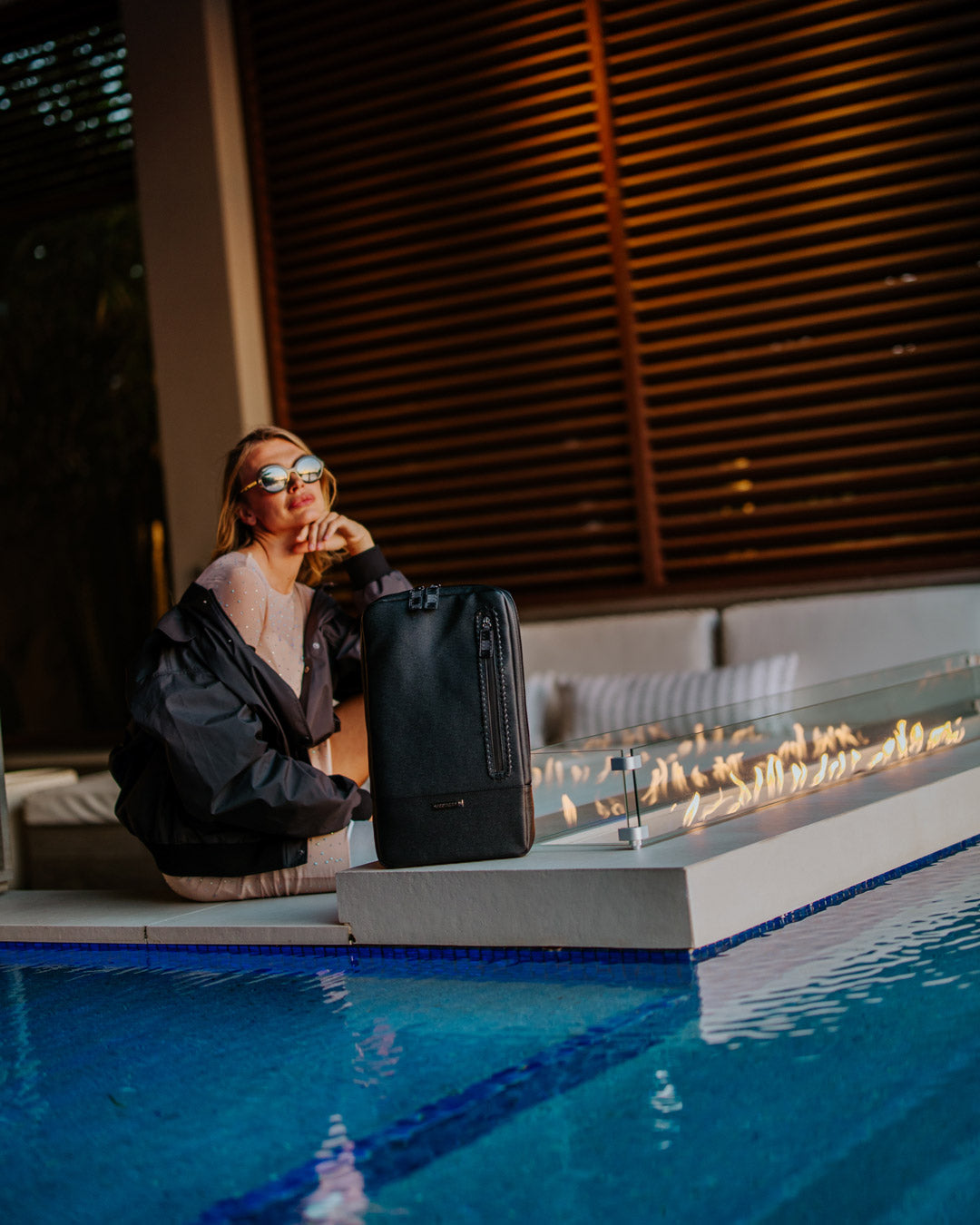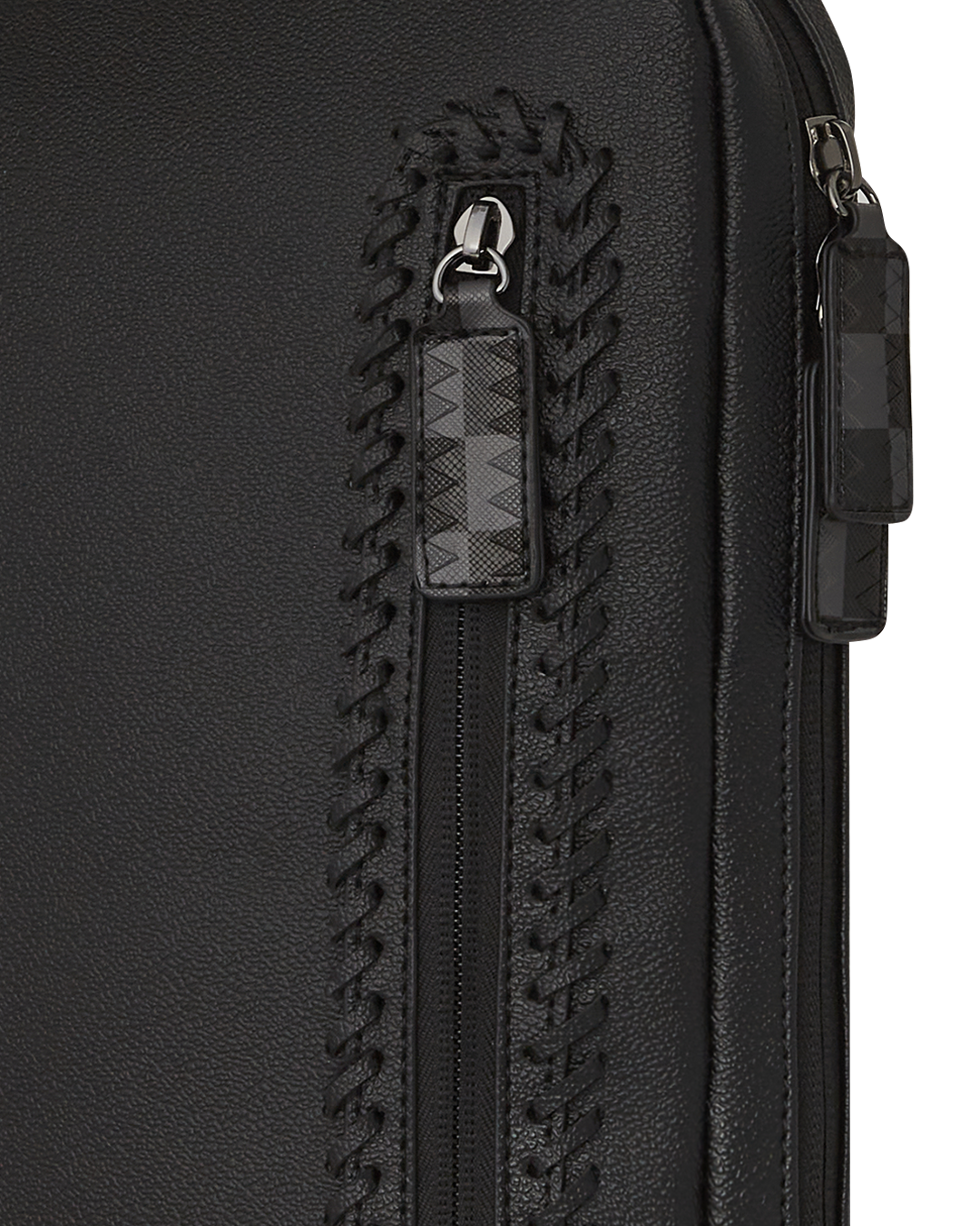 Ergonomic mesh back padding, Whip stitch detailing, adjustable straps, 2 exterior pockets, features a whip stitch luggage tag, embossed zipper pulls
