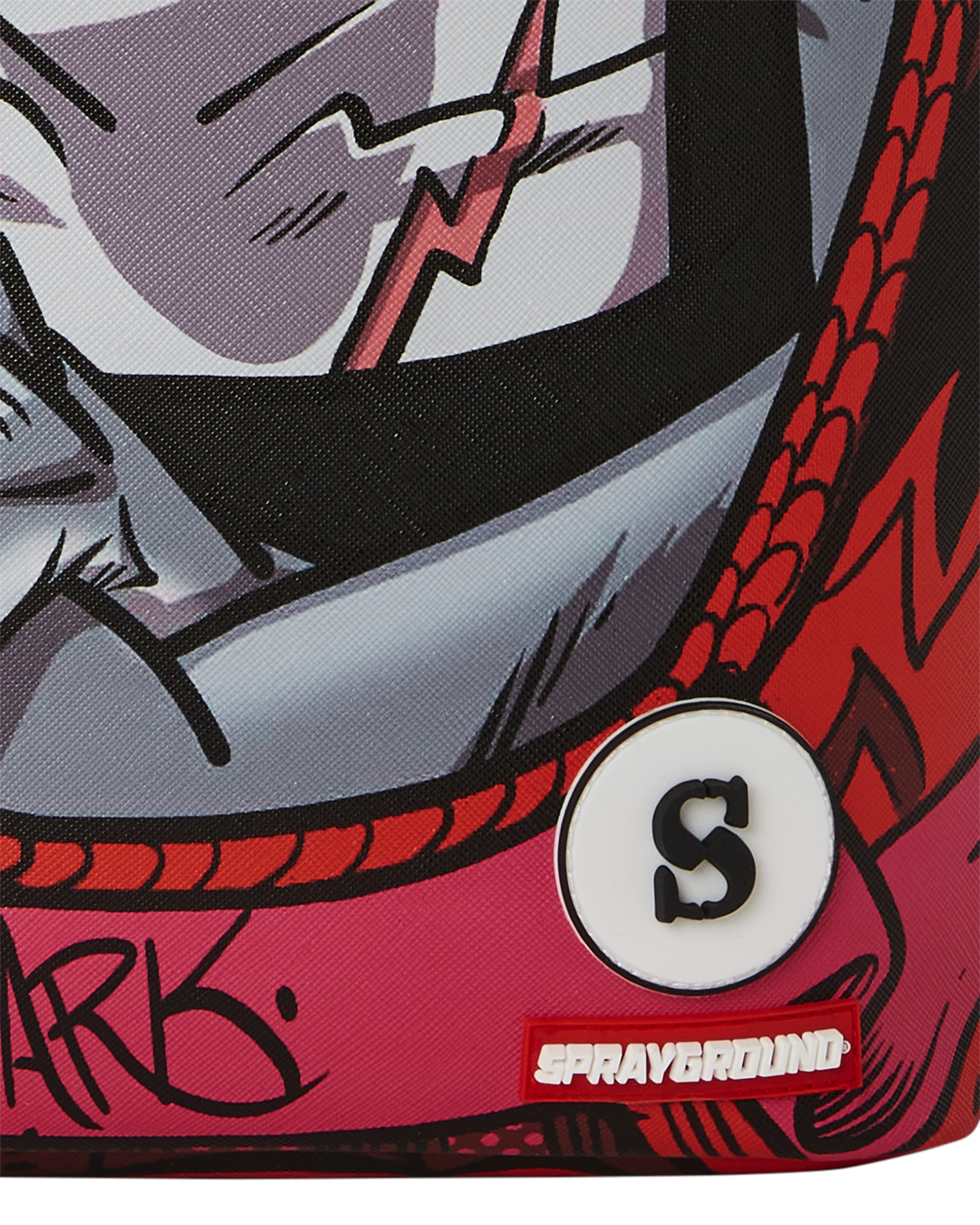 Dimensions: 18' x 6' x 11.5' • Front zipper pocket • Side pockets • Zippered Stash pocket • Separate velour sunglass compartment • Ergonomic mesh back padding • Adjustable Straps for custom sizing • Gold zippers with metal hardware • Metal 'Sprayground Authentic' badge • Slide through back sleeve connects to carry-on luggage to free your hands