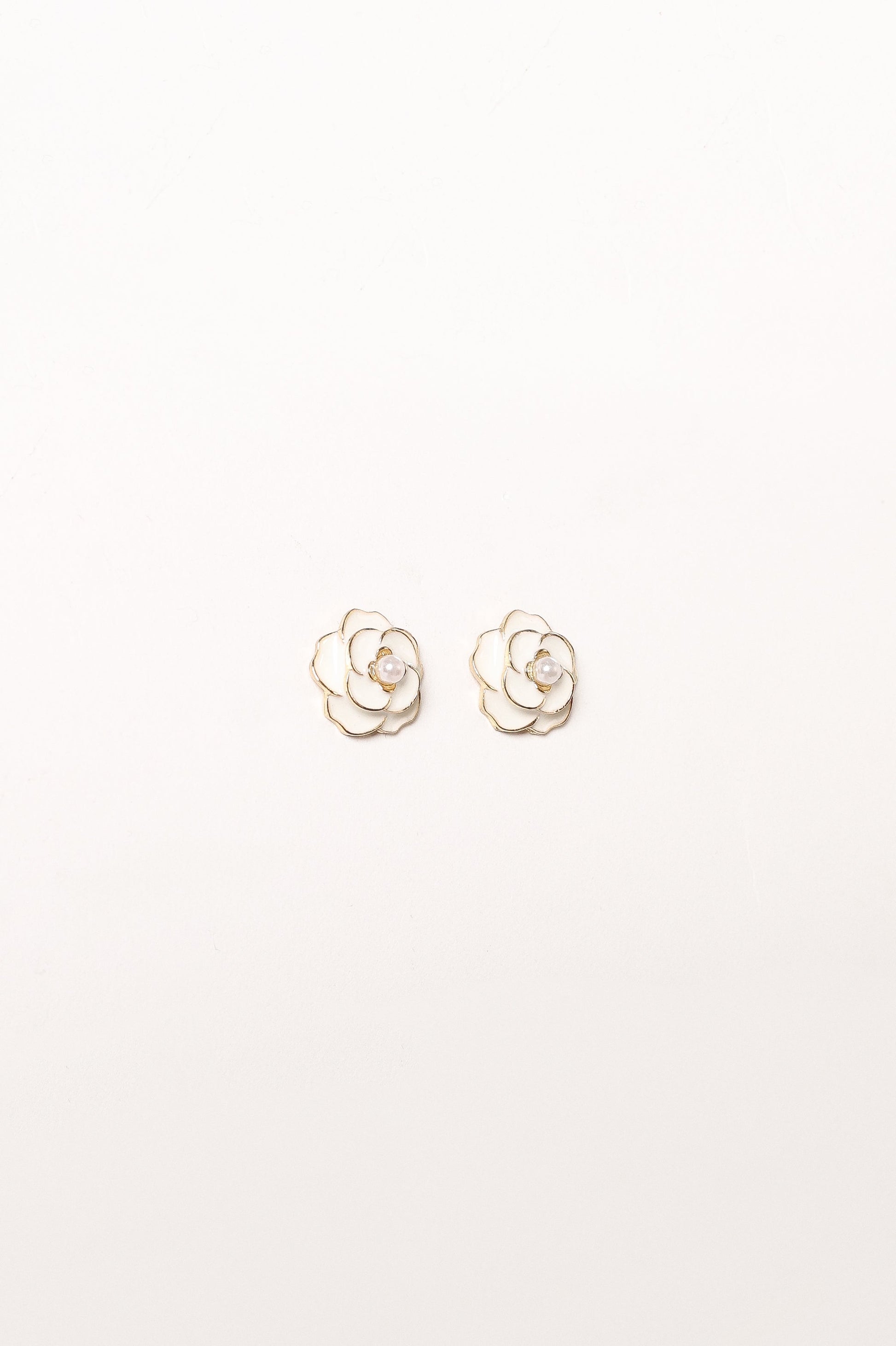 DETAILS These stud-style earrings are the epitome of sophistication, boasting a delicate enamel flower feature. Each blossom is carefully detailed with faux pearl and gold accents, creating a stunning contrast against the white enamel.