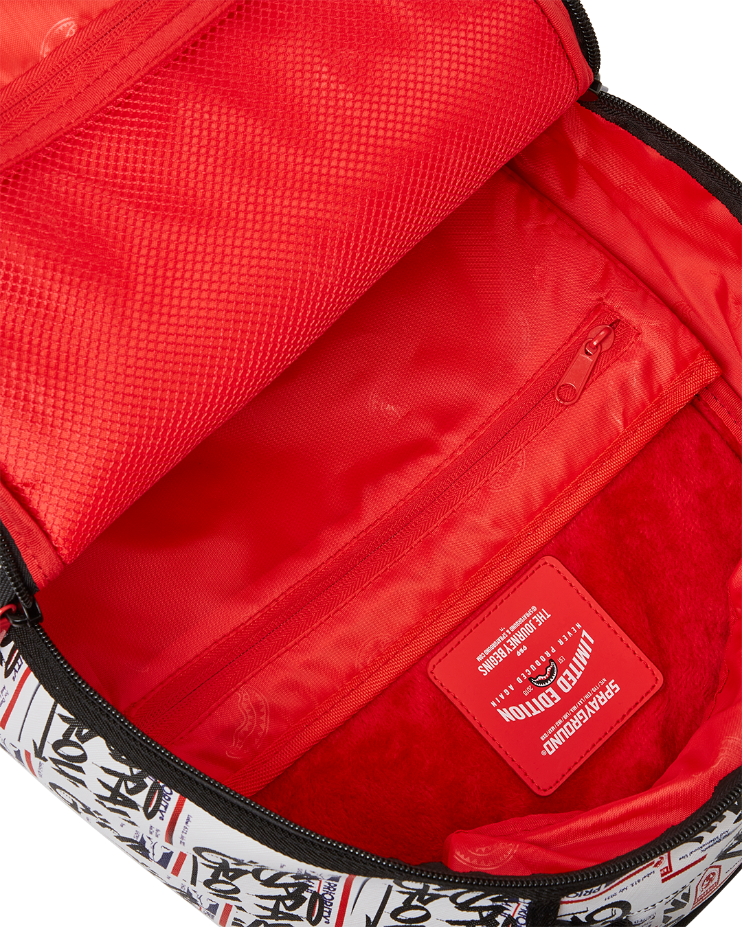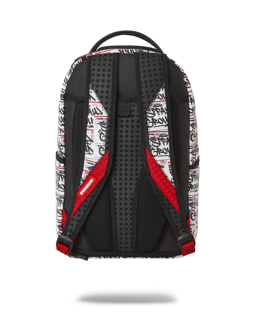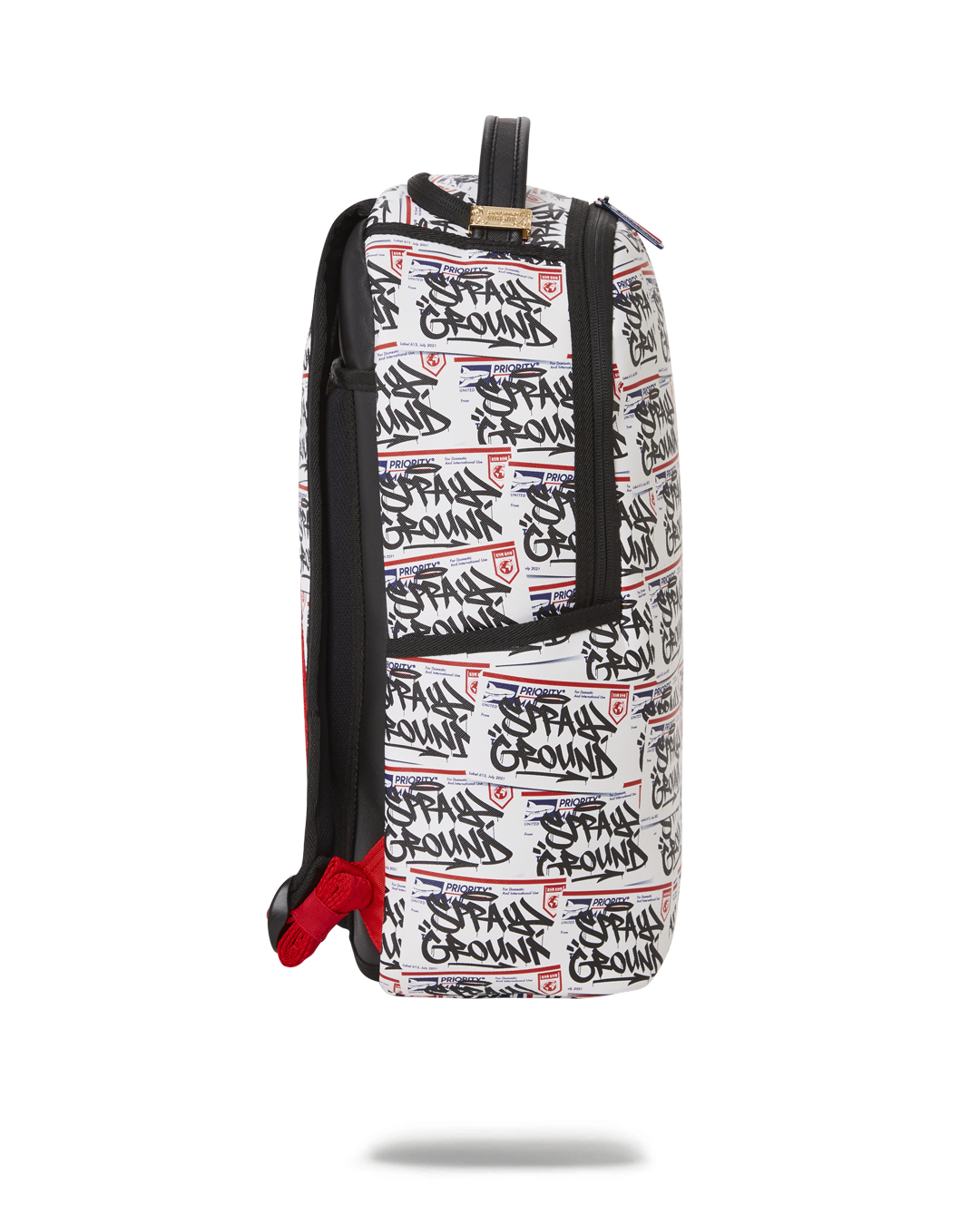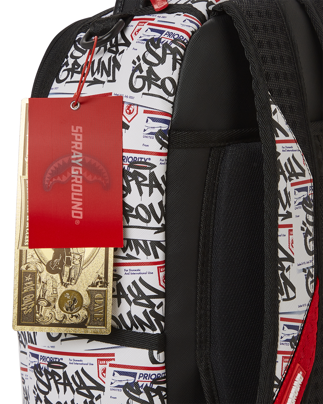 ExteriorDimensions: 18' x 6' x 11.5' • Front zipper pocket • Side pockets • Zippered Stash pocket • Separate velour sunglass compartment • Ergonomic mesh back padding • Adjustable Straps for custom sizing • Green zippers with metal hardware • Metal 'Sprayground Authentic' badge • Slide through back sleeve connects to carry on luggage to free your hands