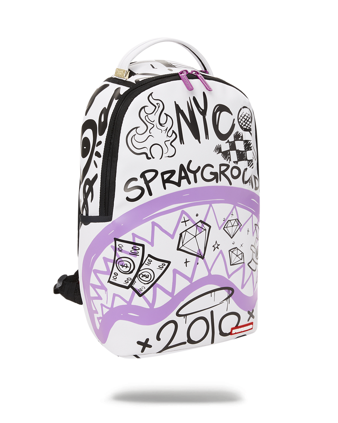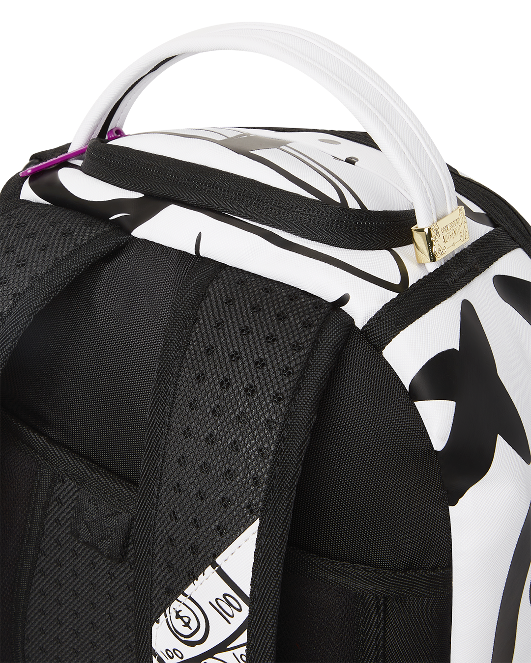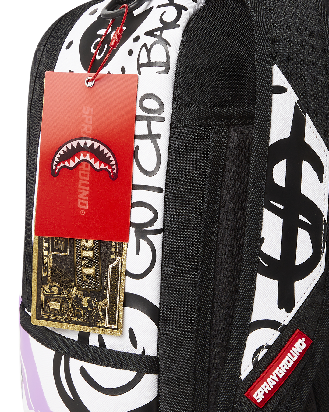 Dimensions: 18' x 6' x 11.5' • Front zipper pocket • Side pockets • Zippered Stash pocket • Separate velour sunglass compartment • Ergonomic mesh back padding • Adjustable Straps for custom sizing • Gold zippers with metal hardware • Metal 'Sprayground Authentic' badge • Slide through back sleeve connects to carry-on luggage to free your hands