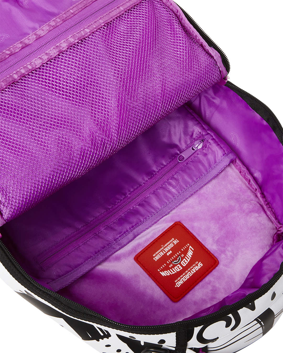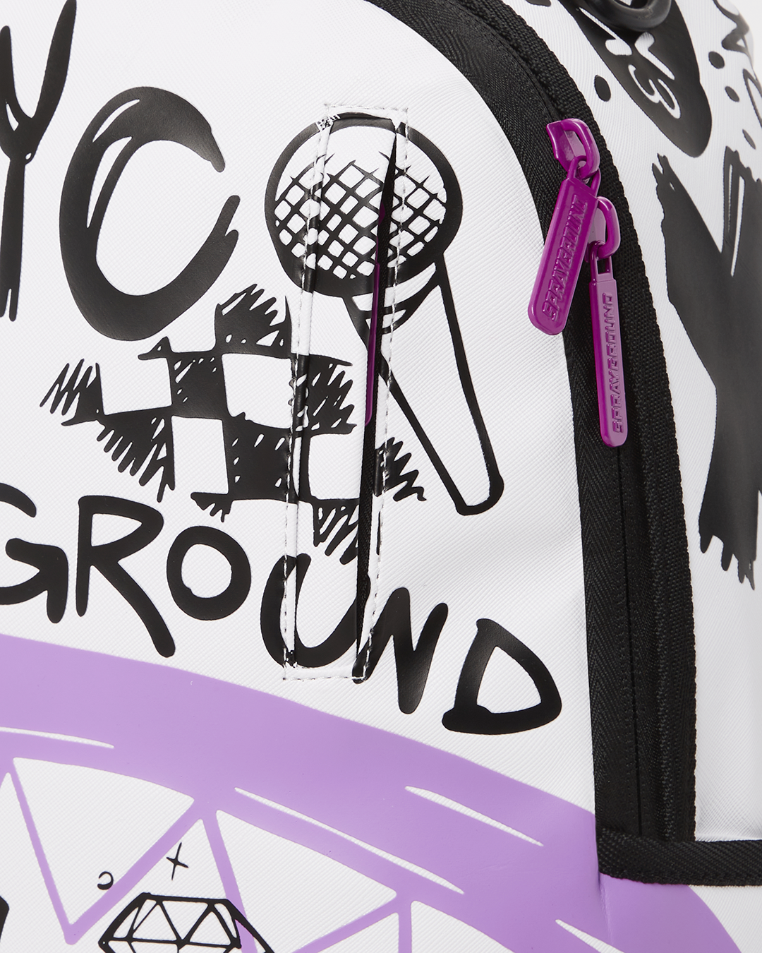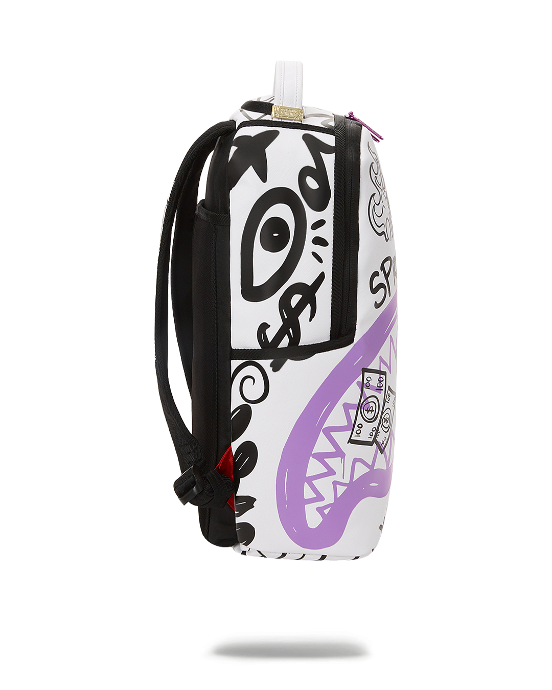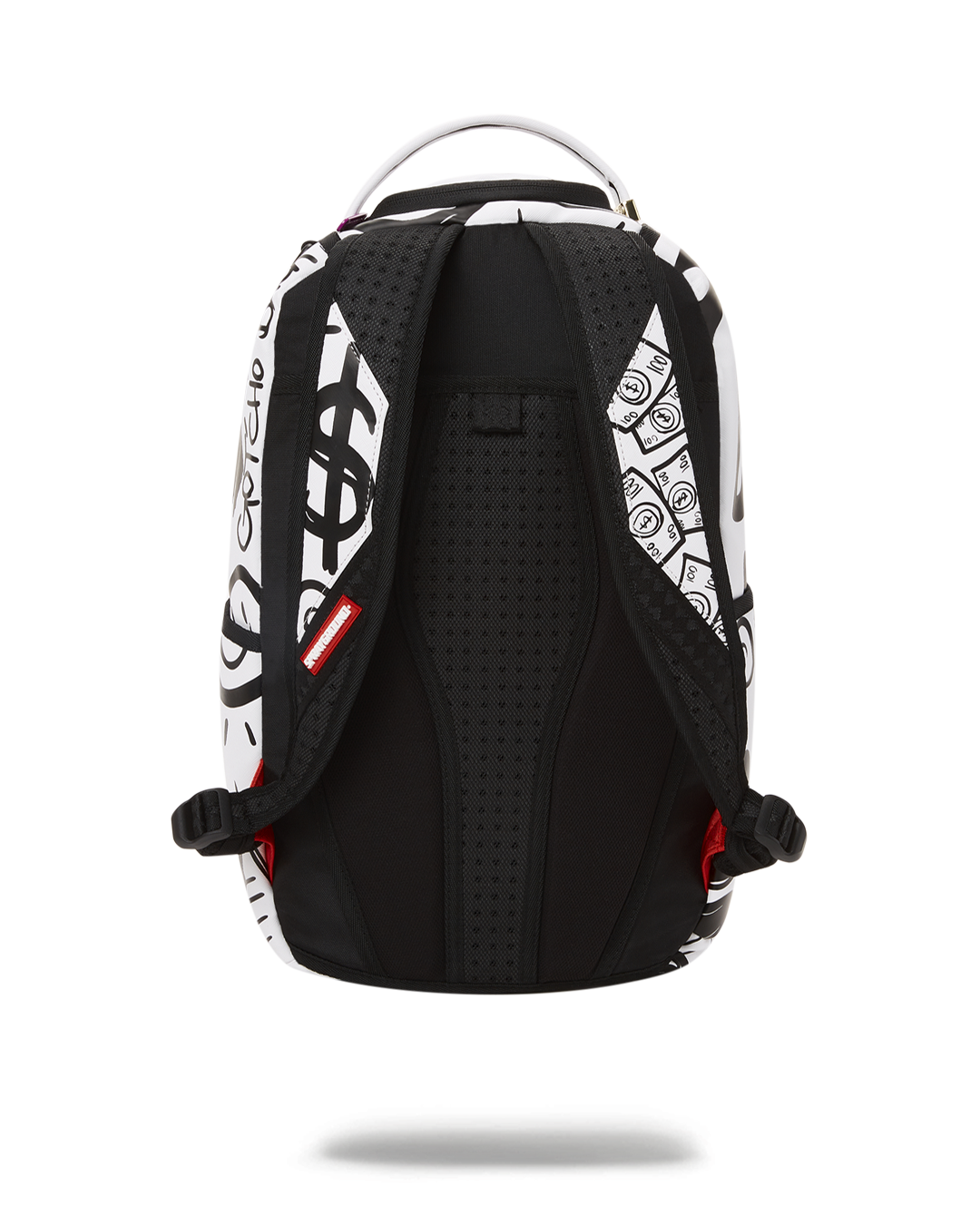 Dimensions: 18' x 6' x 11.5' • Front zipper pocket • Side pockets • Zippered Stash pocket • Separate velour sunglass compartment • Ergonomic mesh back padding • Adjustable Straps for custom sizing • Gold zippers with metal hardware • Metal 'Sprayground Authentic' badge • Slide through back sleeve connects to carry-on luggage to free your hands