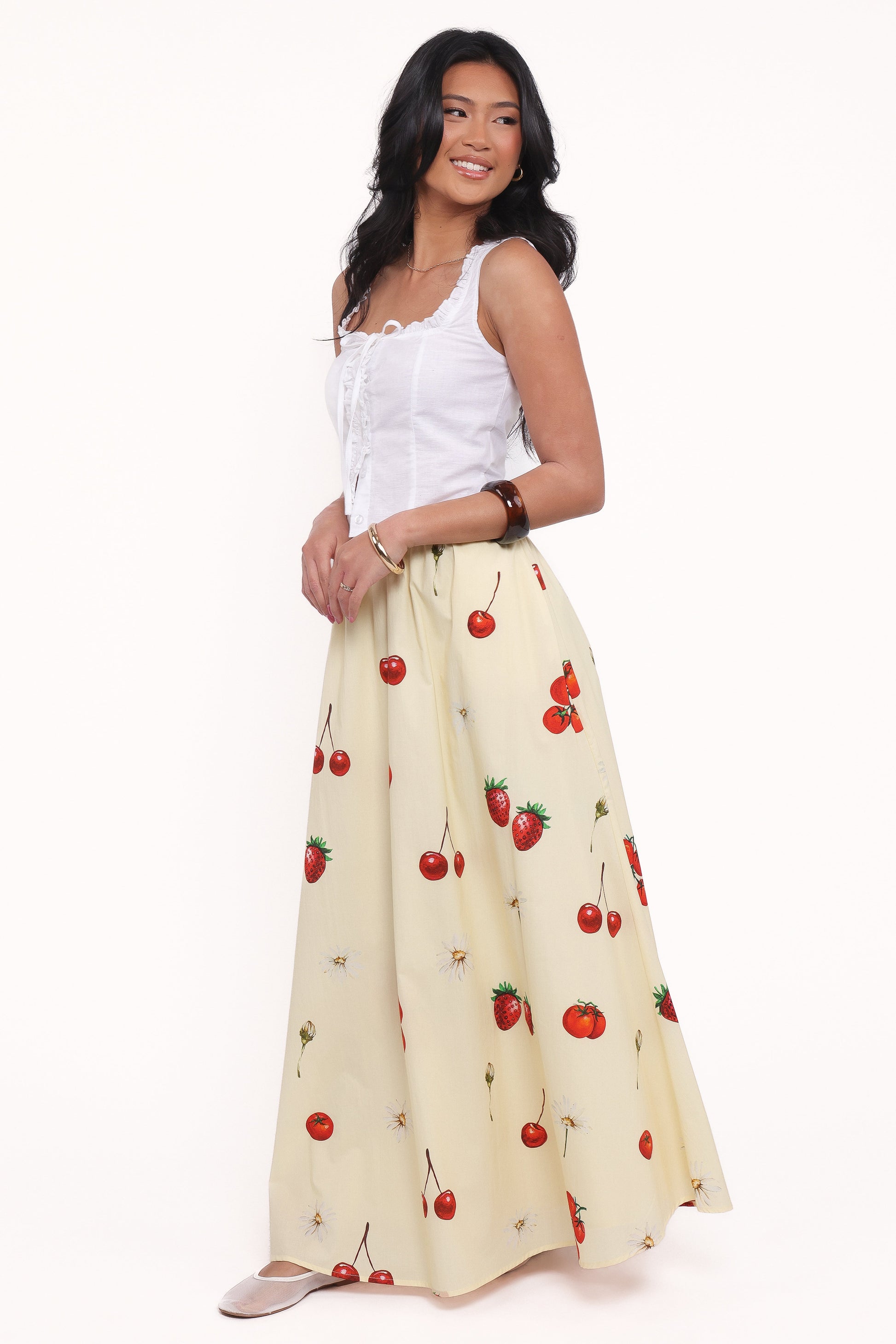 DETAILS Step into effortless style with the Remira Midi Skirt in Yellow Cherry. Featuring a flattering high-waisted cut and an easy-to-wear elasticised waistband, this skirt blends comfort with chic.