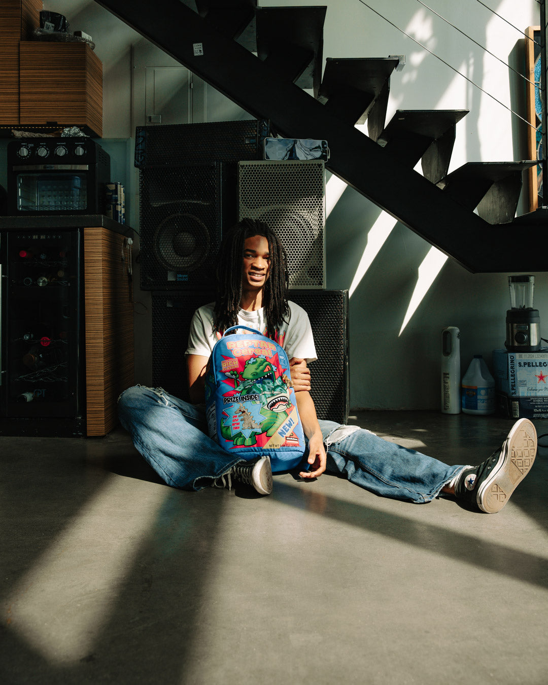 Dimensions: 18' x 6' x 11.5' • Front zipper pocket • Side pockets • Zippered Stash pocket • Separate velour sunglass compartment • Ergonomic mesh back padding • Adjustable Straps for custom sizing • Gold zippers with metal hardware • Metal 'Sprayground Authentic' badge • Slide through back sleeve connects to carry-on luggage to free your hands