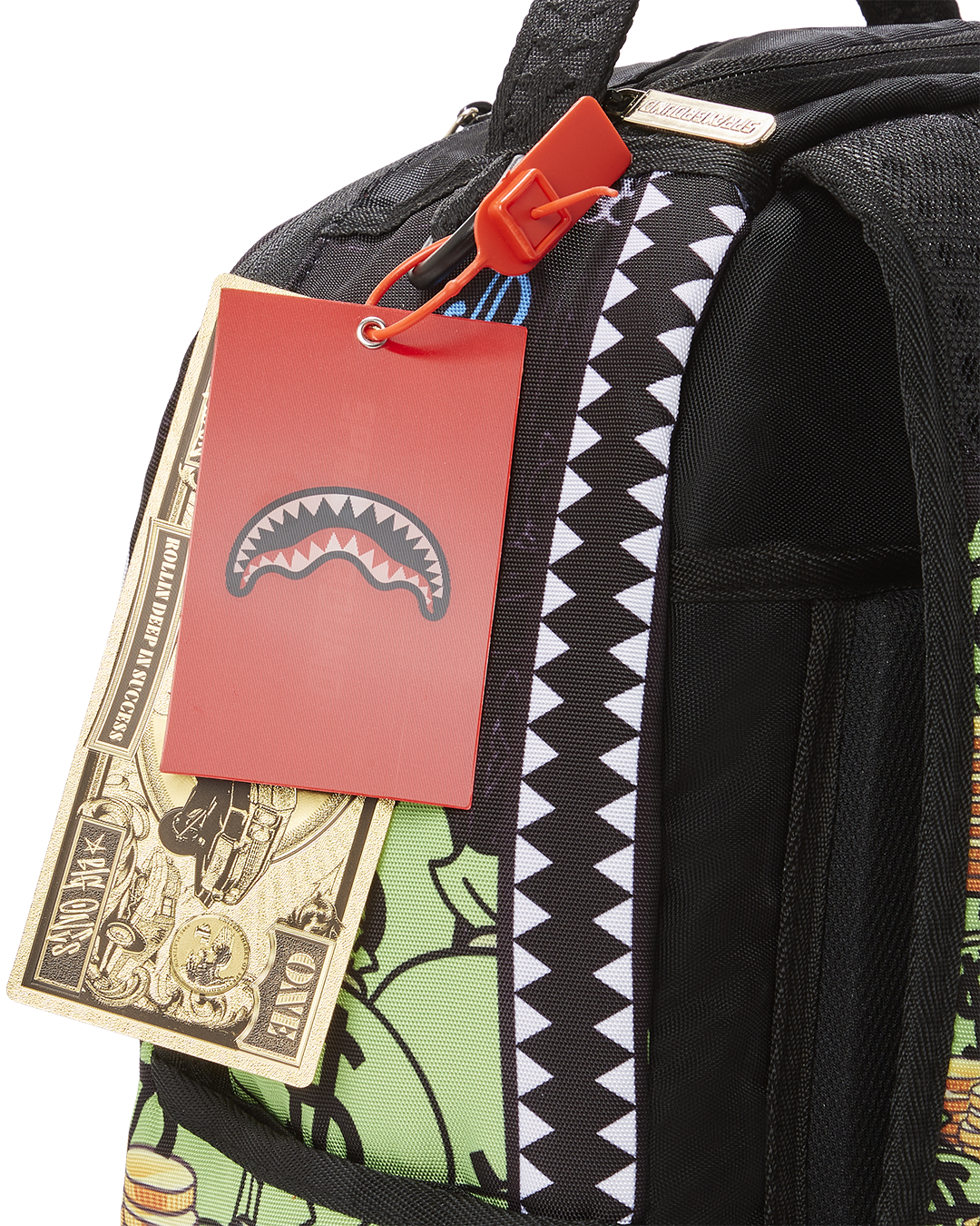 ExteriorDimensions: 18' x 6' x 11.5' • Front zipper pocket • Side pockets • Zippered Stash pocket • Separate velour sunglass compartment • Ergonomic mesh back padding • Adjustable Straps for custom sizing • Green zippers with metal hardware • Metal 'Sprayground Authentic' badge • Slide through back sleeve connects to carry on luggage to free your hands