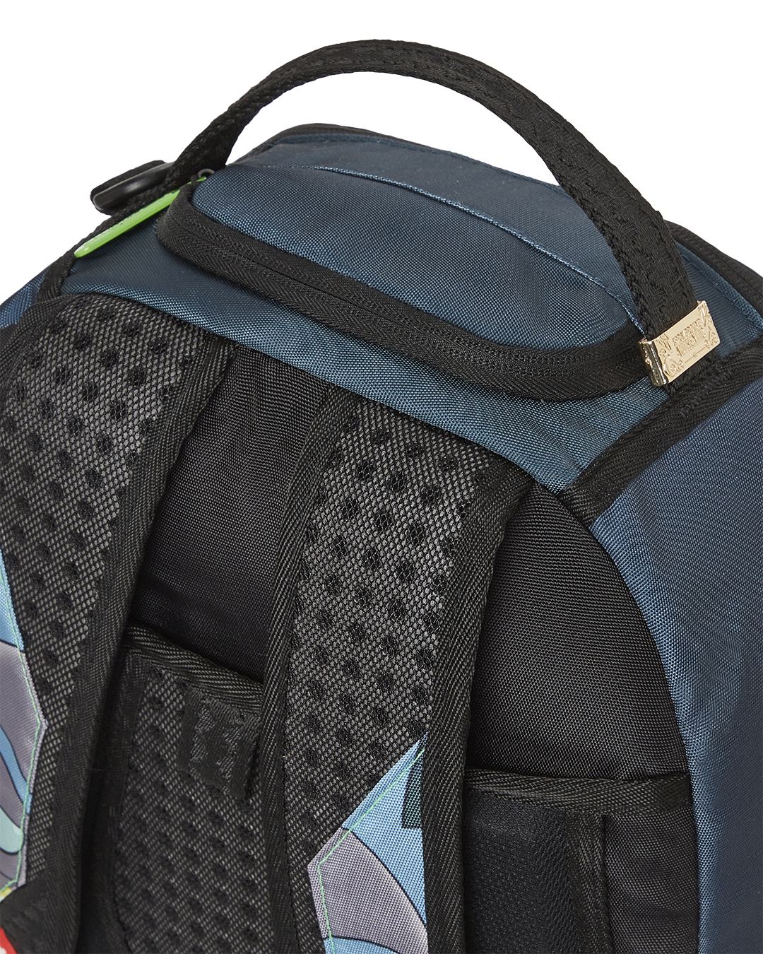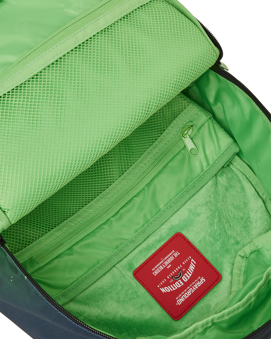 ExteriorDimensions: 18' x 6' x 11.5' • Front zipper pocket • Side pockets • Zippered Stash pocket • Separate velour sunglass compartment • Ergonomic mesh back padding • Adjustable Straps for custom sizing • Green zippers with metal hardware • Metal 'Sprayground Authentic' badge • Slide through back sleeve connects to carry on luggage to free your hands