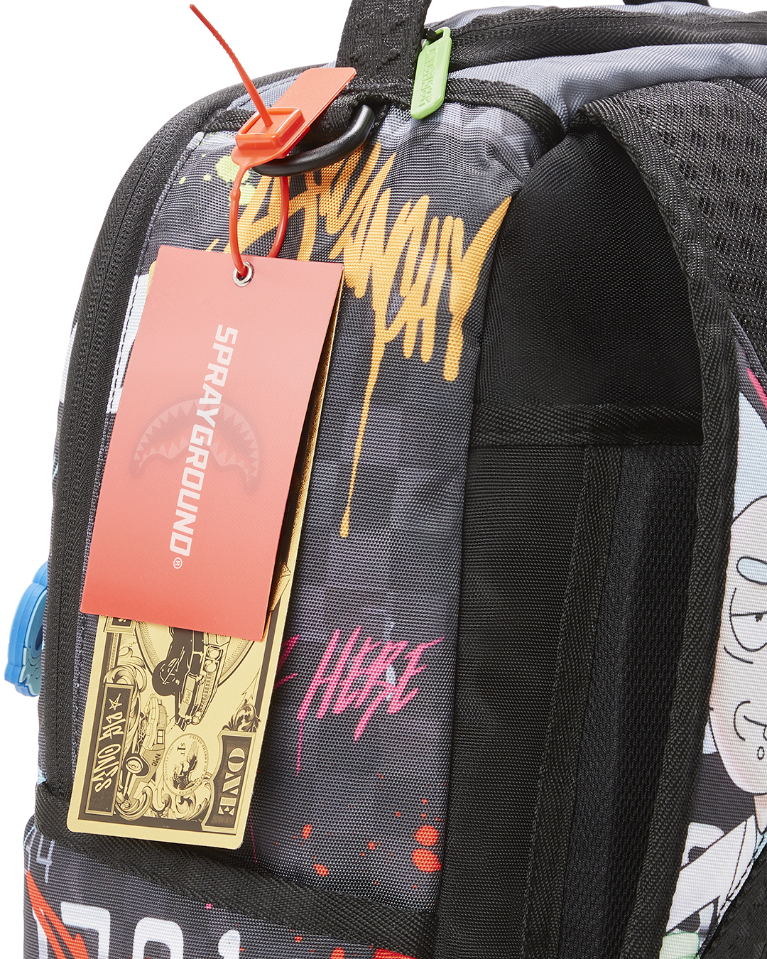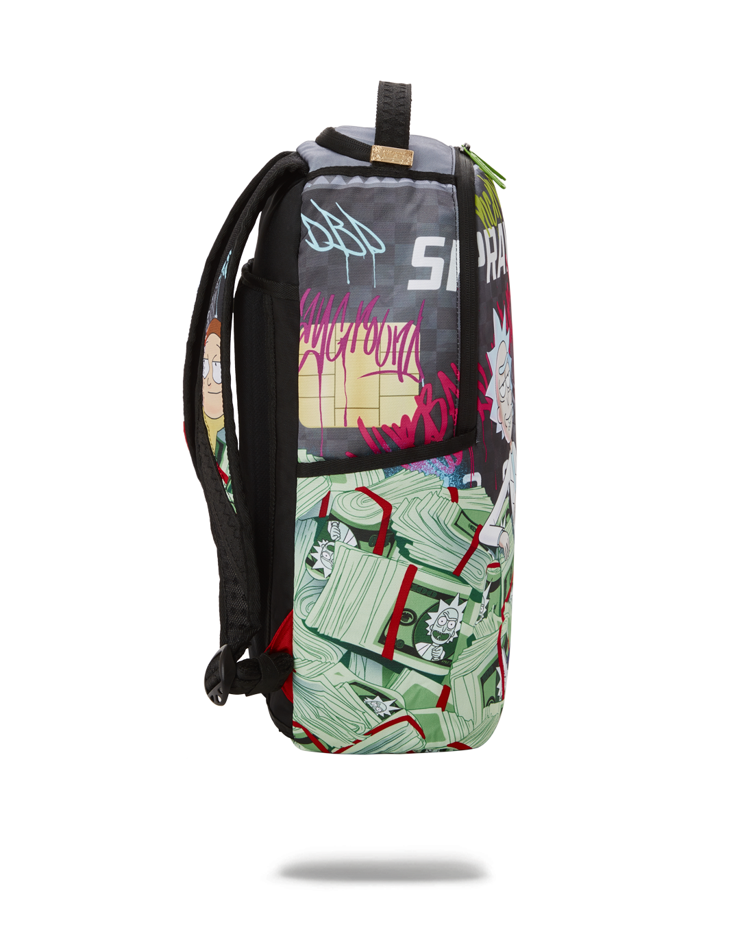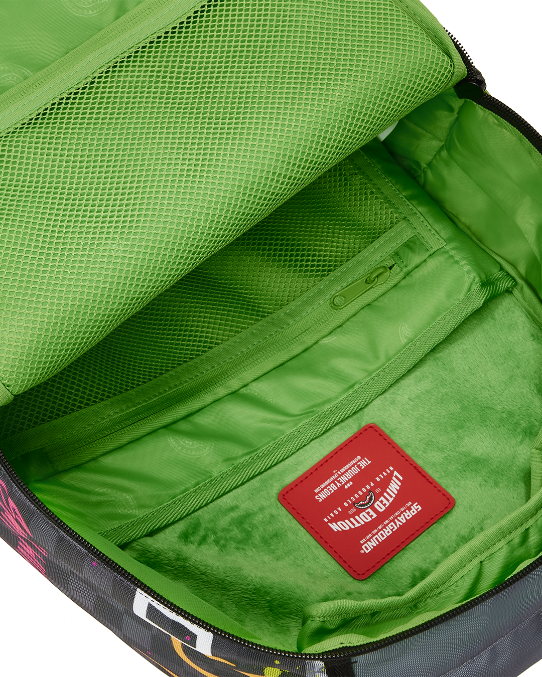 ExteriorDimensions: 18' x 6' x 11.5' • Front zipper pocket • Side pockets • Zippered Stash pocket • Separate velour sunglass compartment • Ergonomic mesh back padding • Adjustable Straps for custom sizing • Green zippers with metal hardware • Metal 'Sprayground Authentic' badge • Slide through back sleeve connects to carry on luggage to free your hands