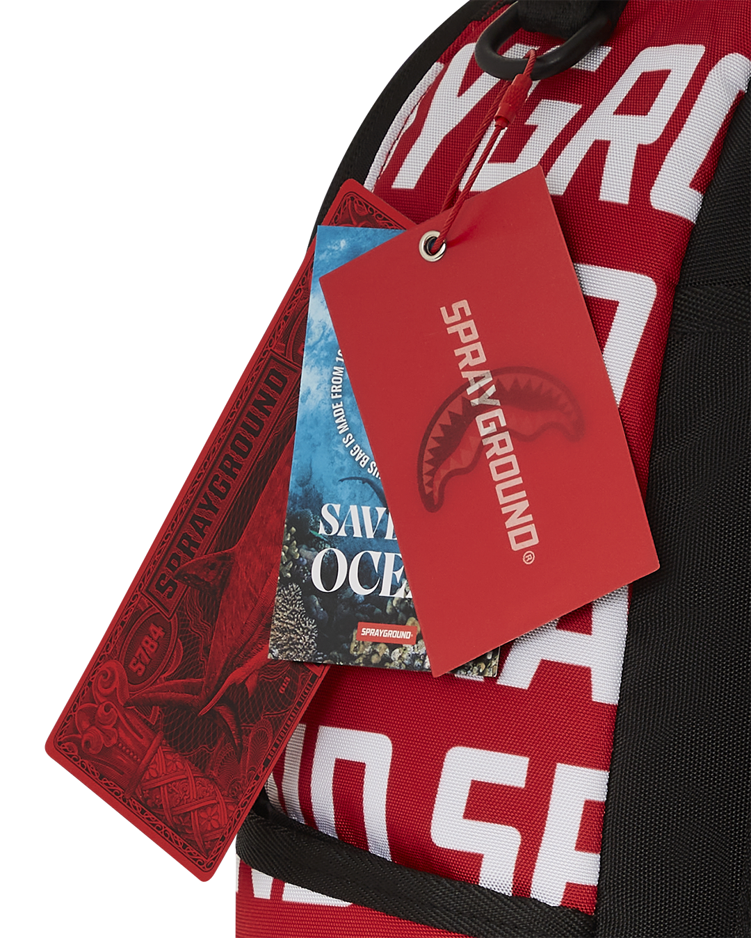 Dimensions: 18' x 6' x 11.5' • Front zipper pocket • Side pockets • Zippered Stash pocket • Separate velour sunglass compartment • Ergonomic mesh back padding • Adjustable Straps for custom sizing • Gold zippers with metal hardware • Metal 'Sprayground Authentic' badge • Slide through back sleeve connects to carry-on luggage to free your hands