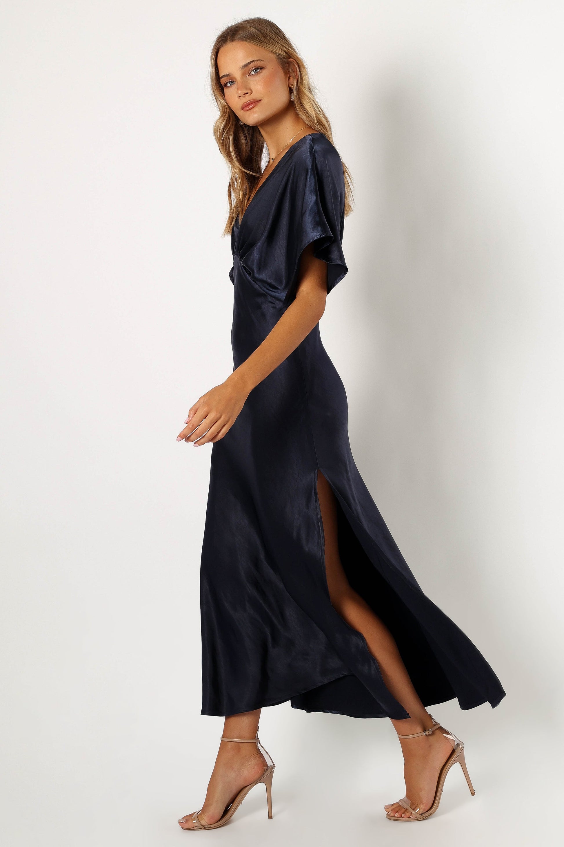 DETAILS This elegant maxi dress is the perfect choice for any special occasion. It features a v neckline with clasp close, short butterfly sleeve and a side invisible zip with hook and eye clasp for an easy fit. The satin fabric has a soft feel that will make you look and feel fabulous all night long. Make a statement at your next party in this stunning maxi dress!