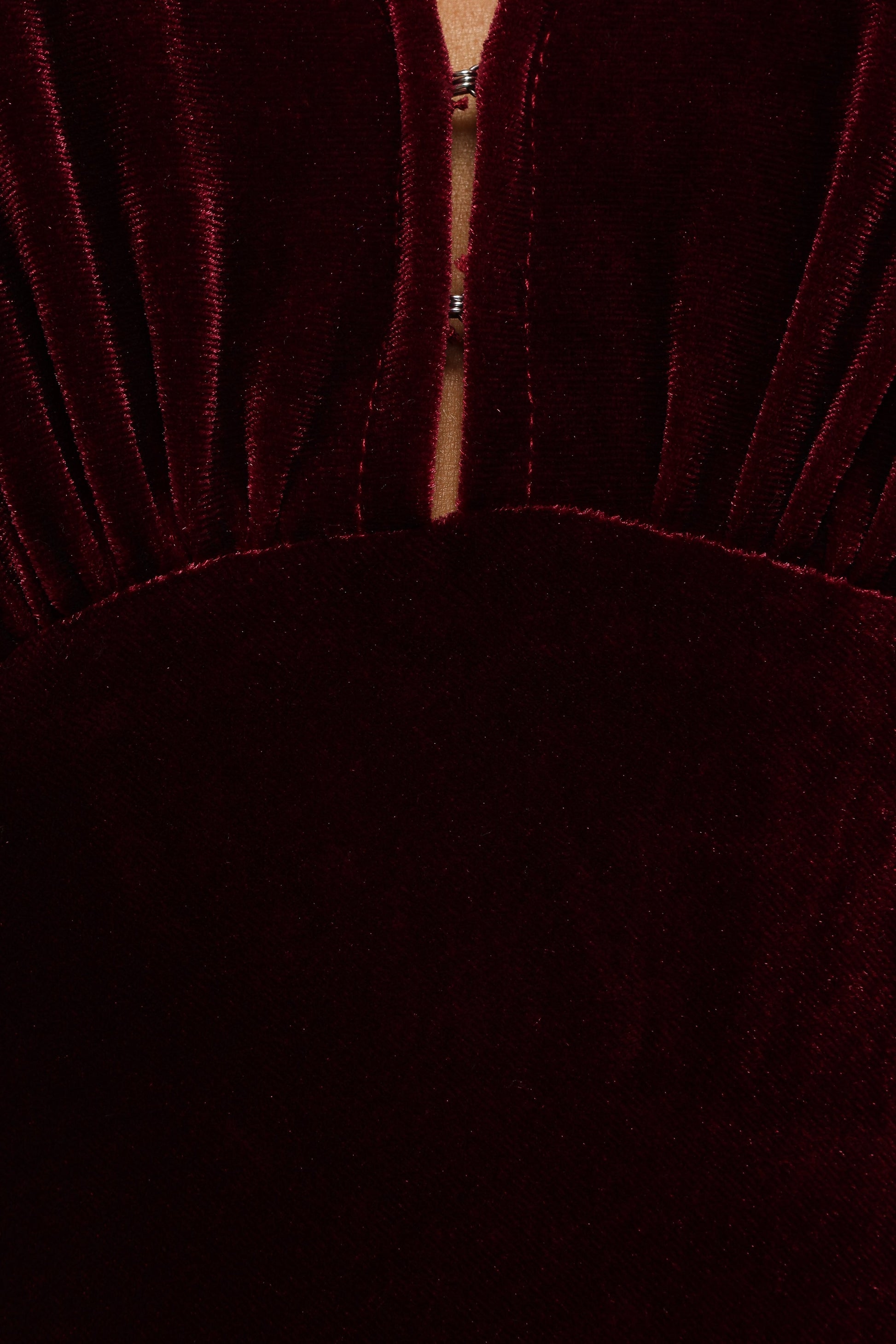 DETAILS This elegant velvet maxi dress is perfect for any special occasion. It features a v neckline and hook and eye closure. The short sleeves have gathered bust detail to create the perfect silhouette.