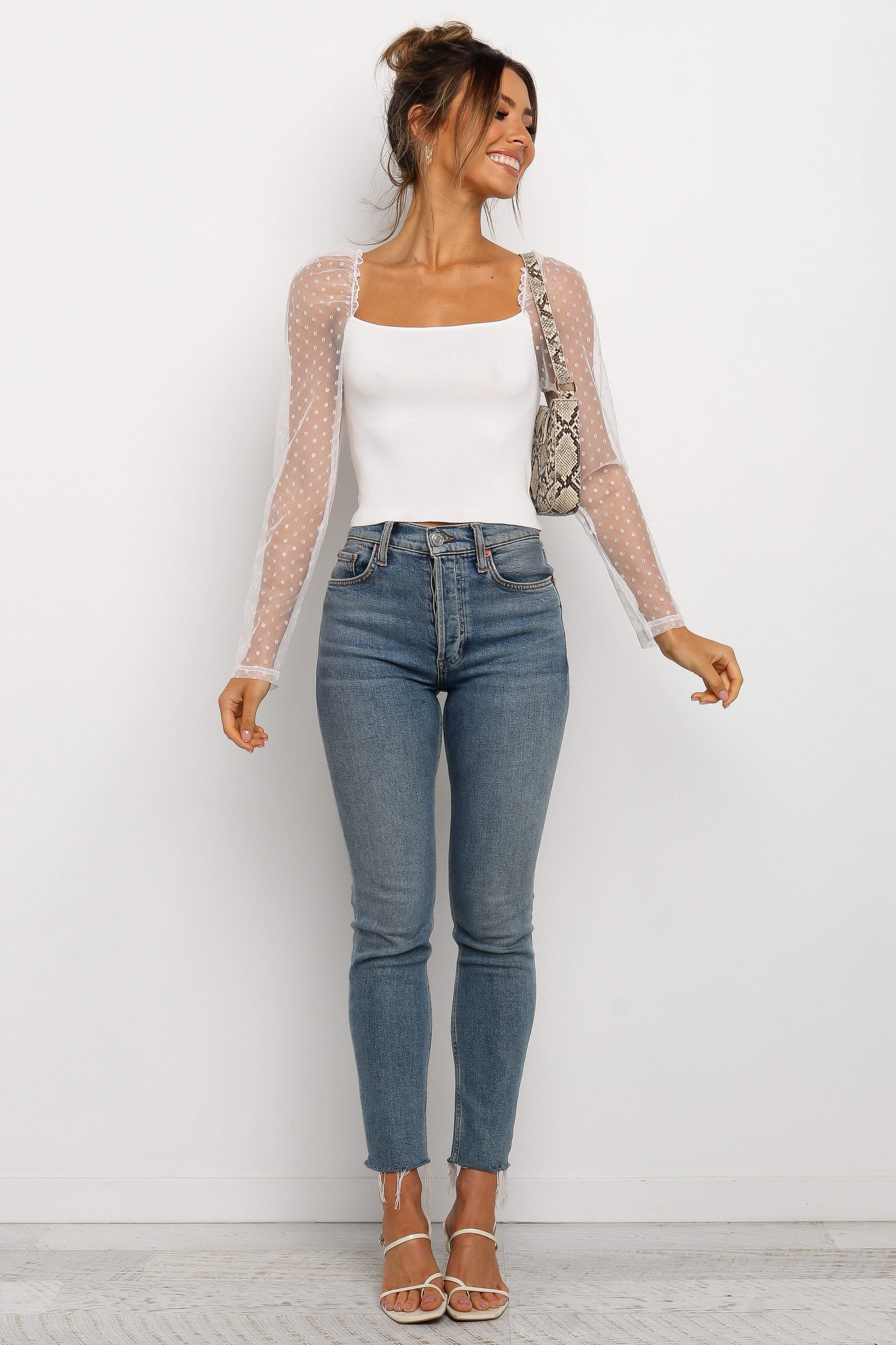 DETAILS This top is the perfect combination of fun, flirty and elegant! Its cropped length and square neckline allow you to show off your curves while its long sheer sleeves add a touch of sophistication.
