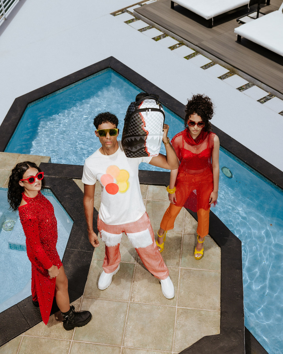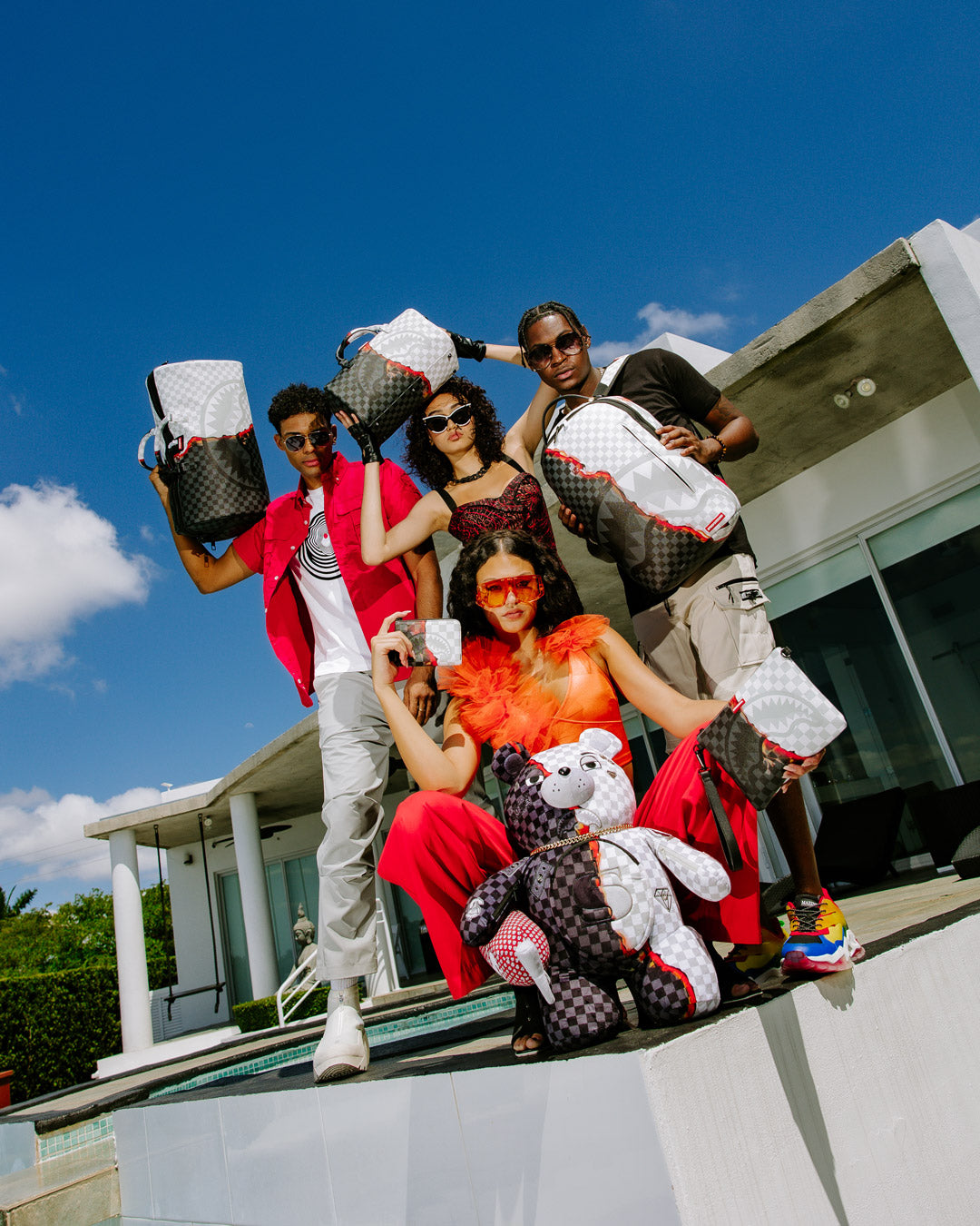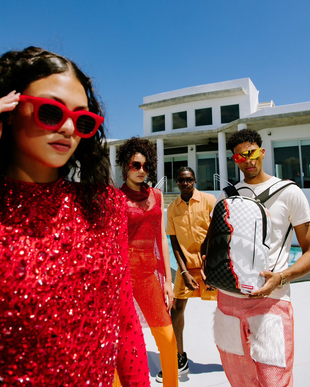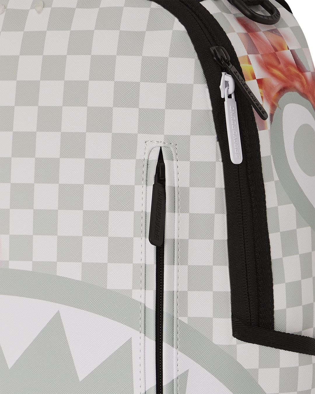 Dimensions: 18' x 6' x 11.5' • Front zipper pocket • Side pockets • Zippered Stash pocket • Separate velour sunglass compartment • Ergonomic mesh back padding • Adjustable Straps for custom sizing • Gold zippers with metal hardware • Metal 'Sprayground Authentic' badge • Slide through back sleeve connects to carry-on luggage to free your hands
