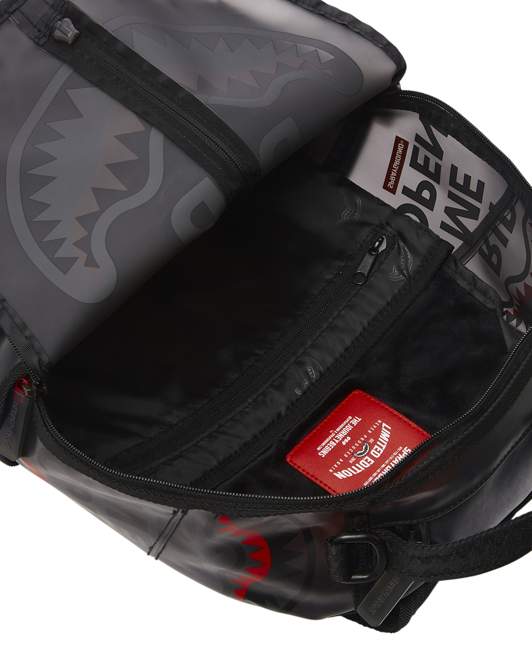 ExteriorDimensions: 18' x 6' x 11.5' • Front zipper pocket • Side pockets • Zippered Stash pocket • Separate velour sunglass compartment • Ergonomic mesh back padding • Adjustable Straps for custom sizing • Silver zippers with metal hardware • Metal 'Sprayground Authentic' badge • Slide through back sleeve connects to carry-on luggage to free your hands