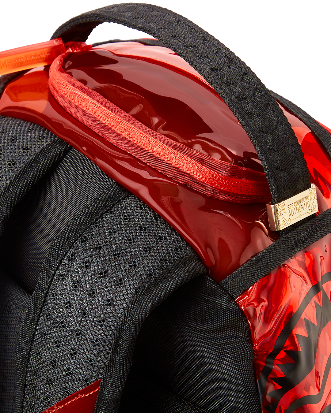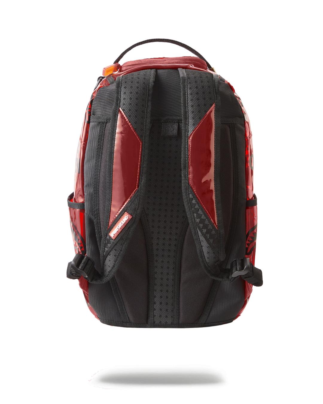 Dimensions: 18' x 6' x 11.5' • Front zipper pocket • Side pockets • Zippered Stash pocket • Separate velour sunglass compartment • Ergonomic mesh back padding • Adjustable Straps for custom sizing • Gold zippers with metal hardware • Metal 'Sprayground Authentic' badge • Slide through back sleeve connects to carry-on luggage to free your hands