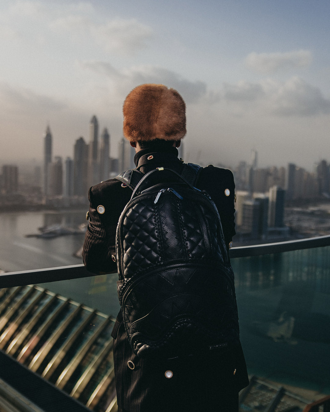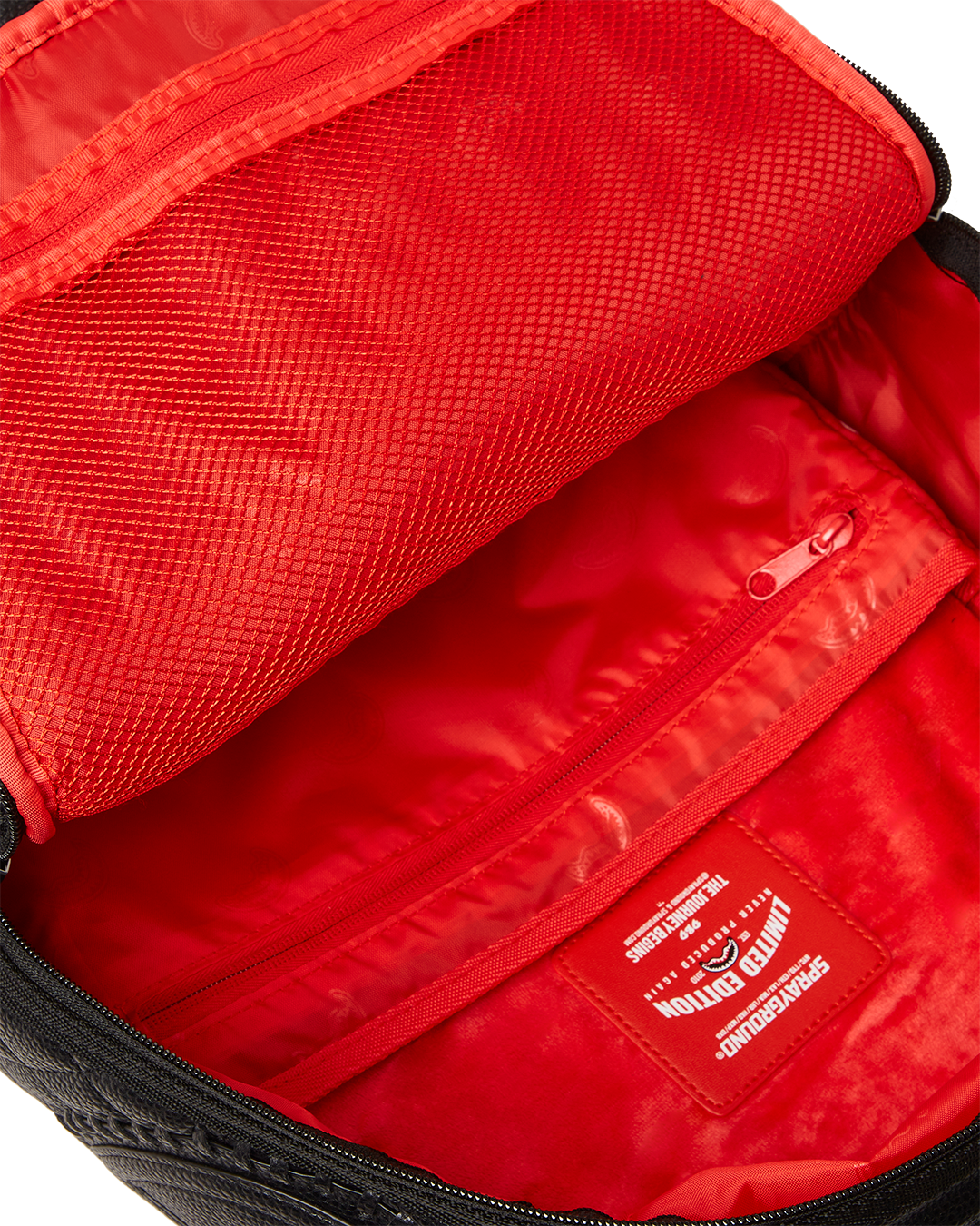 Dimensions: 18' x 6' x 11.5' • Front zipper pocket • Side pockets • Zippered Stash pocket • Separate velour sunglass compartment • Ergonomic mesh back padding • Adjustable Straps for custom sizing • Gold zippers with metal hardware • Metal 'Sprayground Authentic' badge • Slide through back sleeve connects to carry-on luggage to free your hands