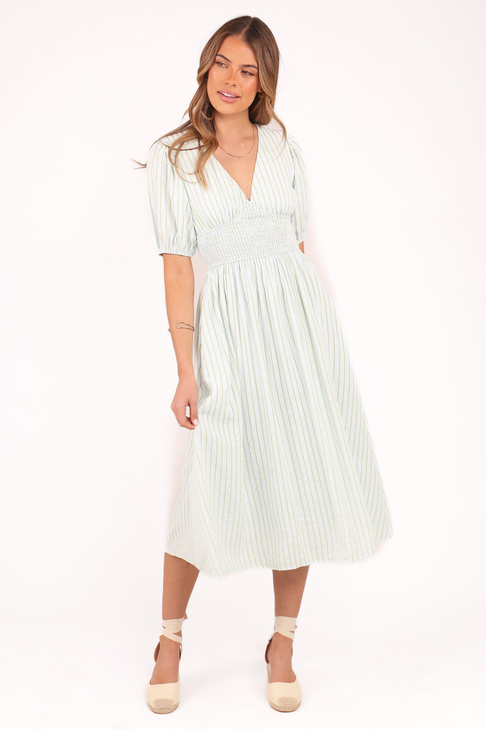 DETAILS Step into timeless elegance with our midi length dress, designed to effortlessly elevate your wardrobe. The short sleeves with elasticised cuffs bring a hint of romance while ensuring a comfortable fit, making it perfect for those warm, sunlit days or breezy evenings.