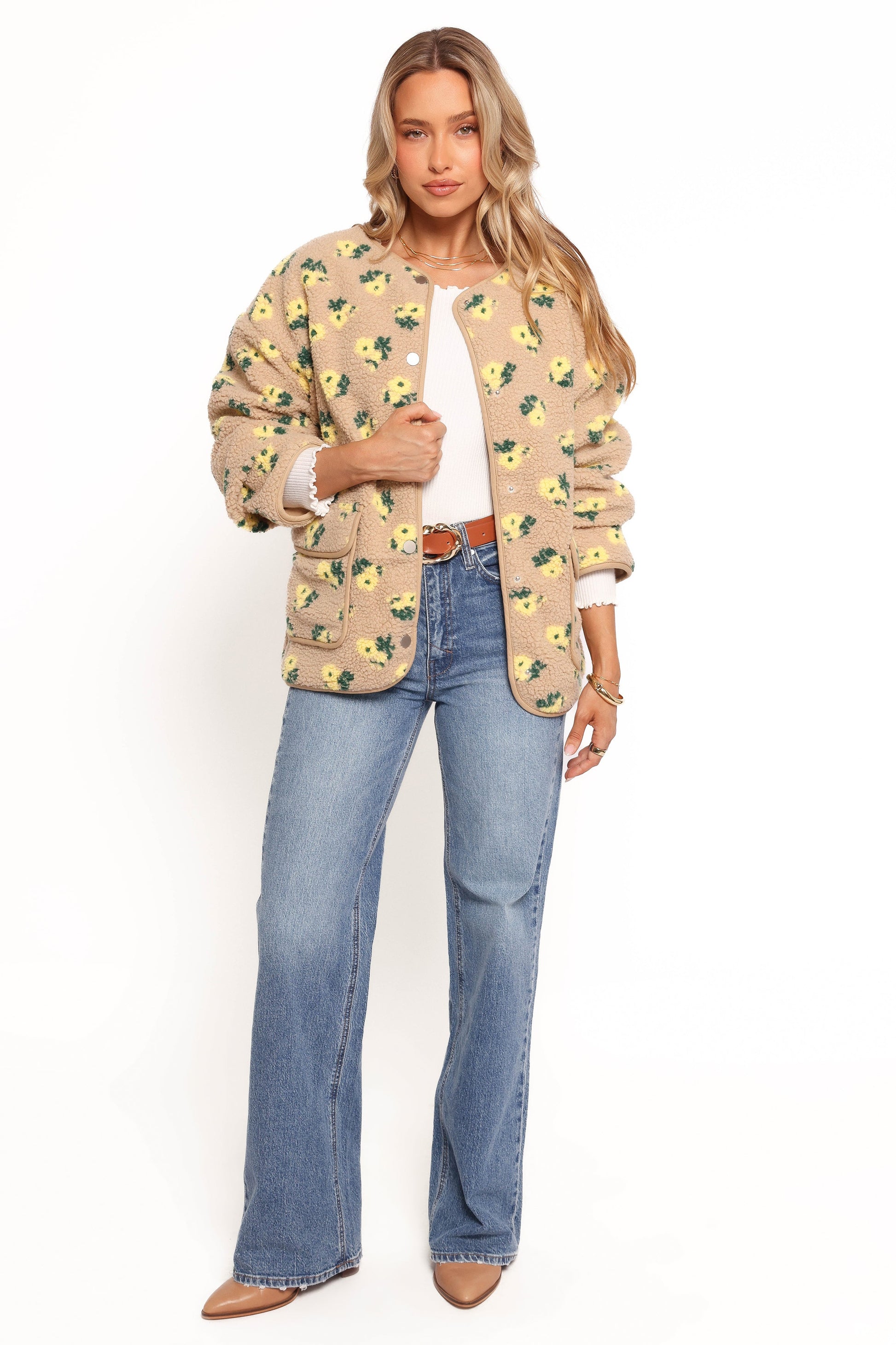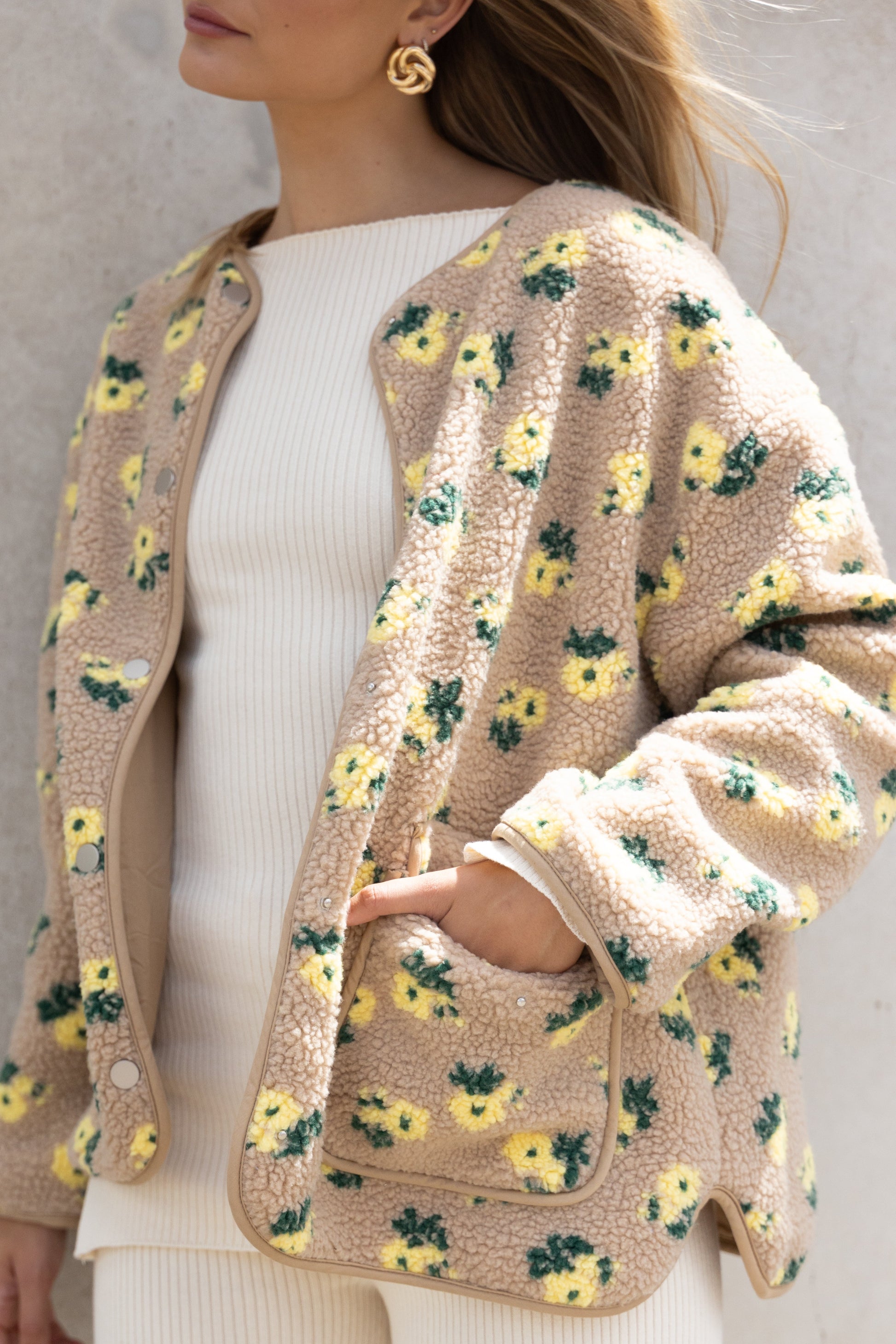 | DETAILS This jacket is crafted from plush teddy material that feels like a warm hug on chilly days, effortlessly blending comfort with fashion. Adorned with a delicate yellow floral print, it brings a touch of sunshine to your wardrobe, perfect for those looking to make a statement.
