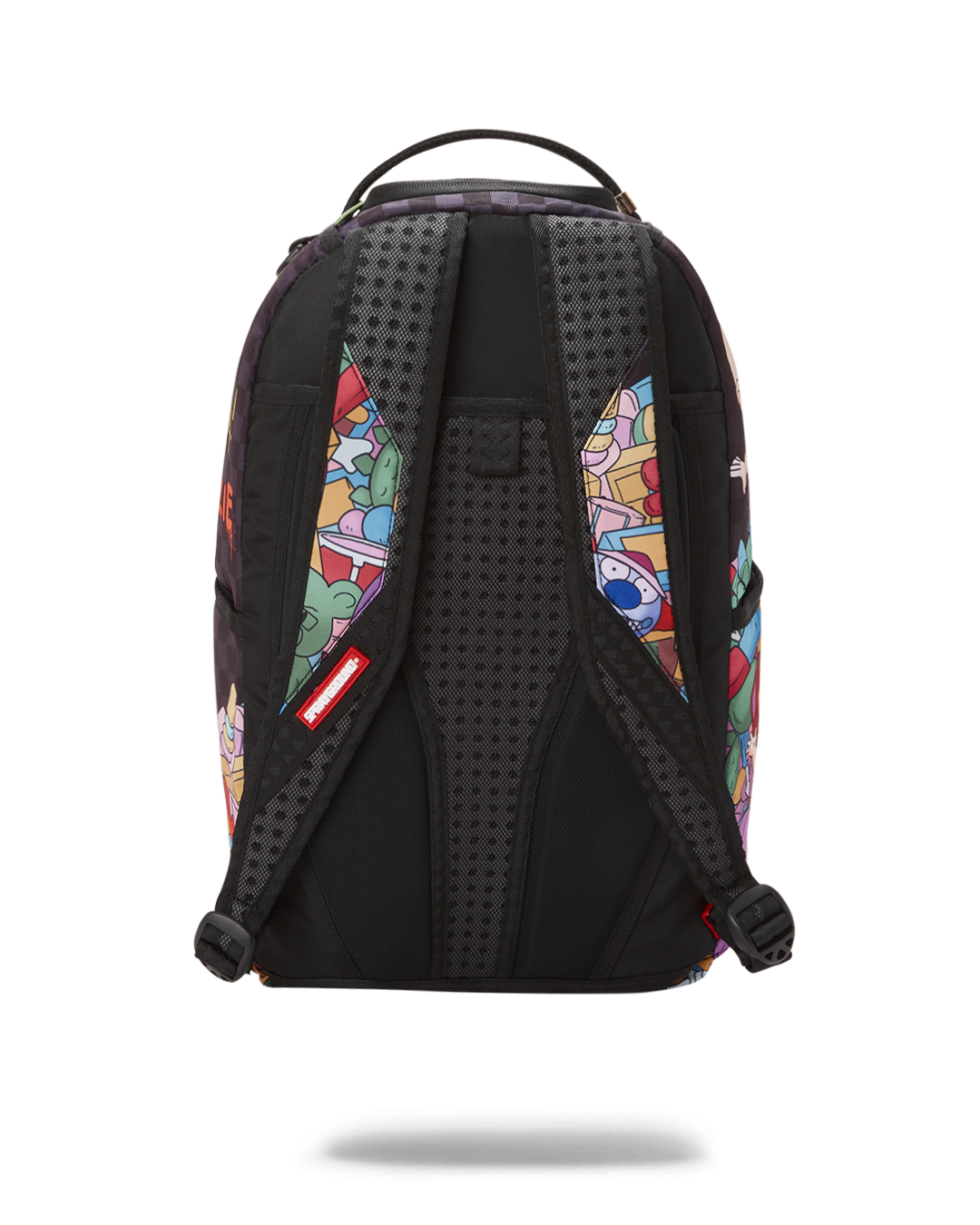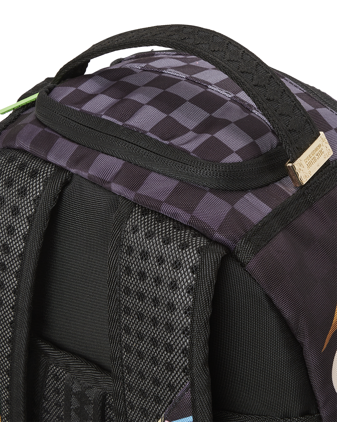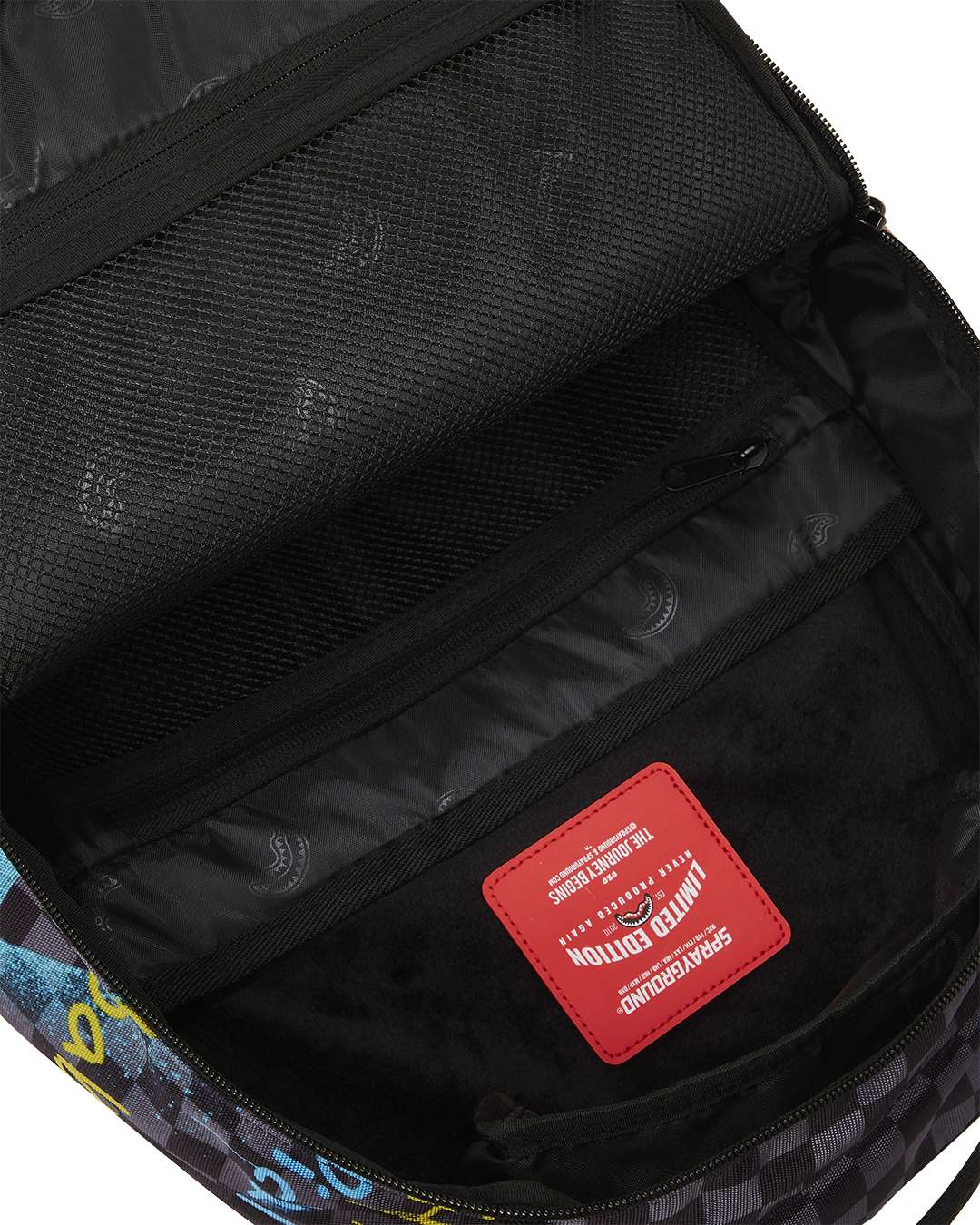 ExteriorDimensions: 18' x 6' x 11.5' • Front zipper pocket • Side pockets • Zippered Stash pocket • Separate velour sunglass compartment • Ergonomic mesh back padding • Adjustable Straps for custom sizing • Green zippers with metal hardware • Metal 'Sprayground Authentic' badge • Slide through back sleeve connects to carry on luggage to free your hands