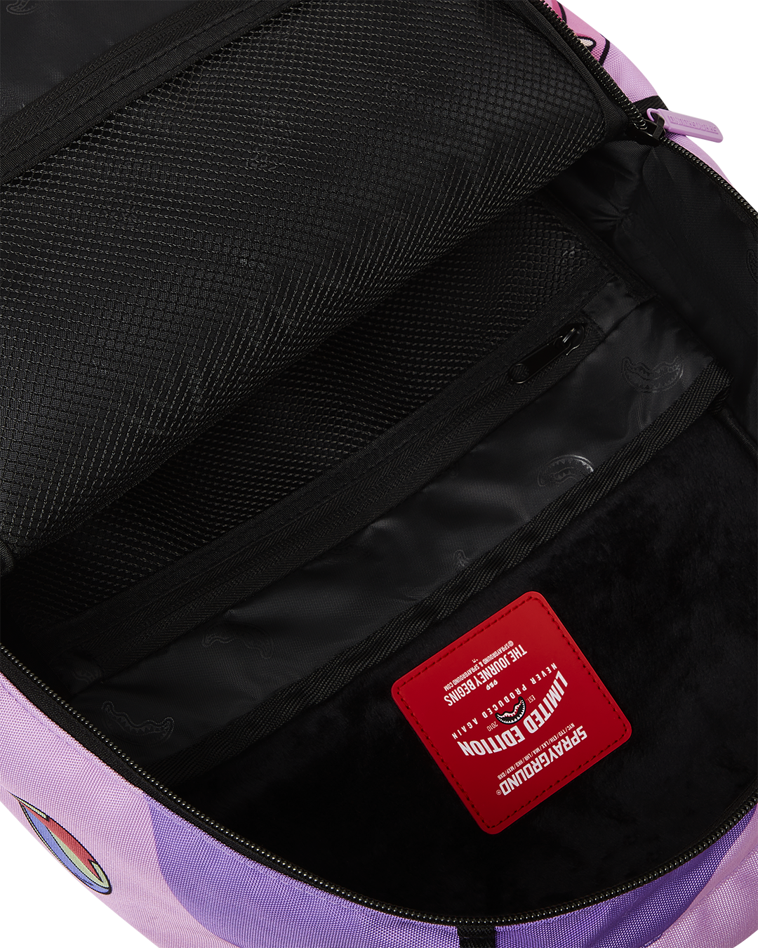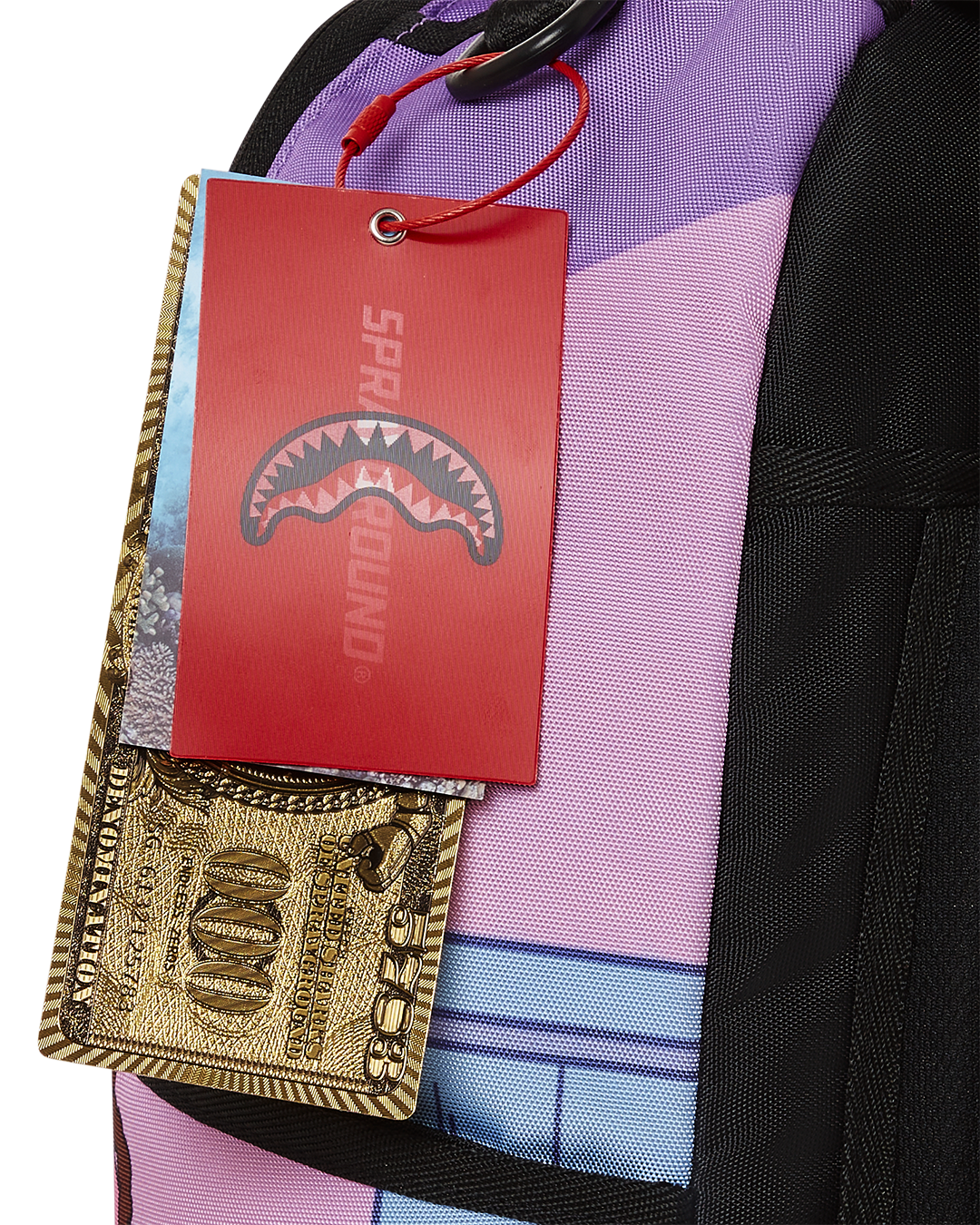 Dimensions: 18' x 6' x 11.5' • Front zipper pocket • Side pockets • Zippered Stash pocket • Separate velour sunglass compartment • Ergonomic mesh back padding • Adjustable Straps for custom sizing • Gold zippers with metal hardware • Metal 'Sprayground Authentic' badge • Slide through back sleeve connects to carry-on luggage to free your hands