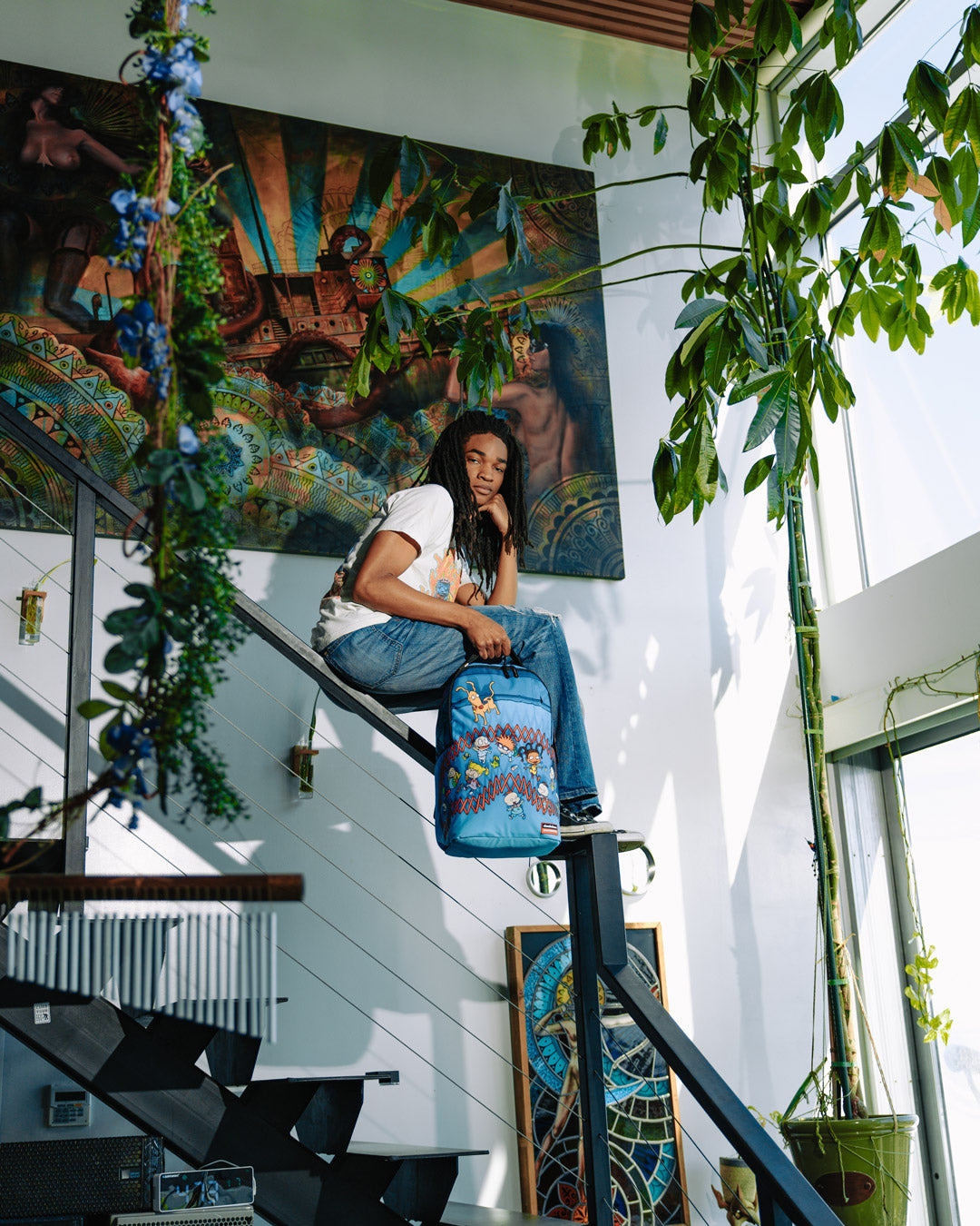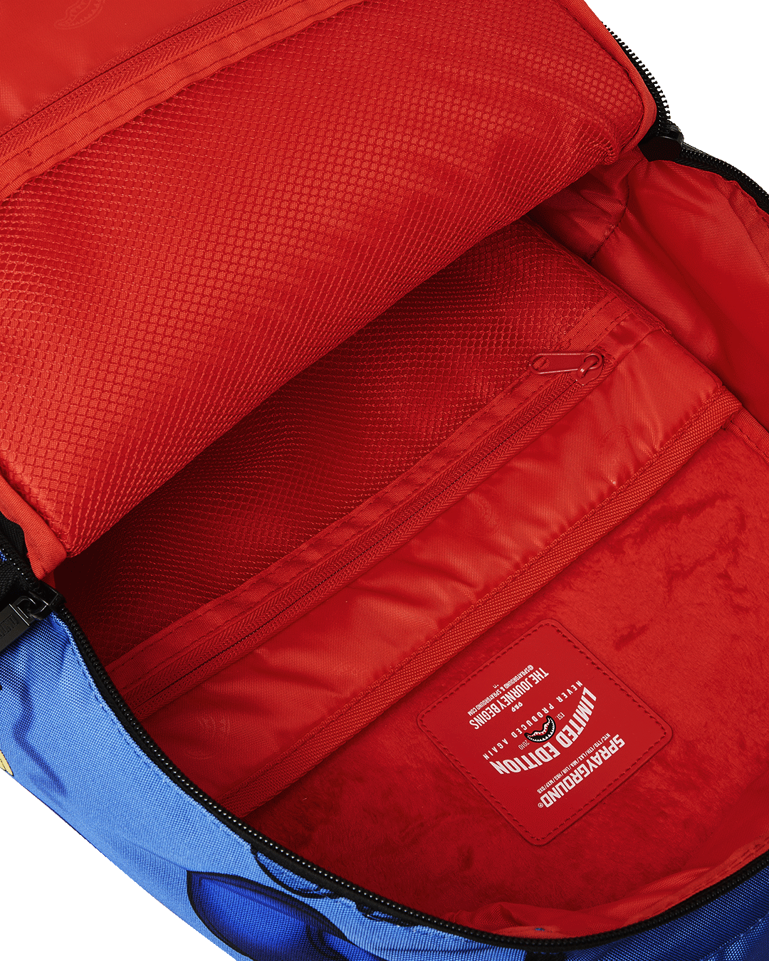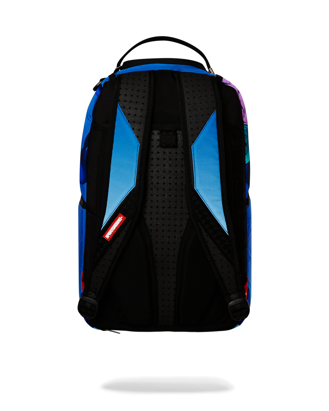 Dimensions: 18' x 6' x 11.5' • Front zipper pocket • Side pockets • Zippered Stash pocket • Separate velour sunglass compartment • Ergonomic mesh back padding • Adjustable Straps for custom sizing • Gold zippers with metal hardware • Metal 'Sprayground Authentic' badge • Slide through back sleeve connects to carry-on luggage to free your hands