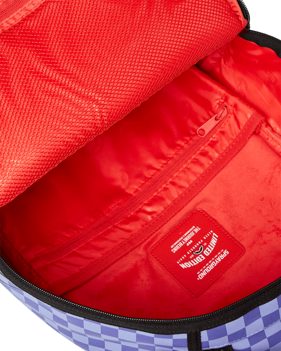 Dimensions: 18' x 6' x 11.5' • Front zipper pocket • Side pockets • Zippered Stash pocket • Separate velour sunglass compartment • Ergonomic mesh back padding • Adjustable Straps for custom sizing • Gold zippers with metal hardware • Metal 'Sprayground Authentic' badge • Slide through back sleeve connects to carry-on luggage to free your hands