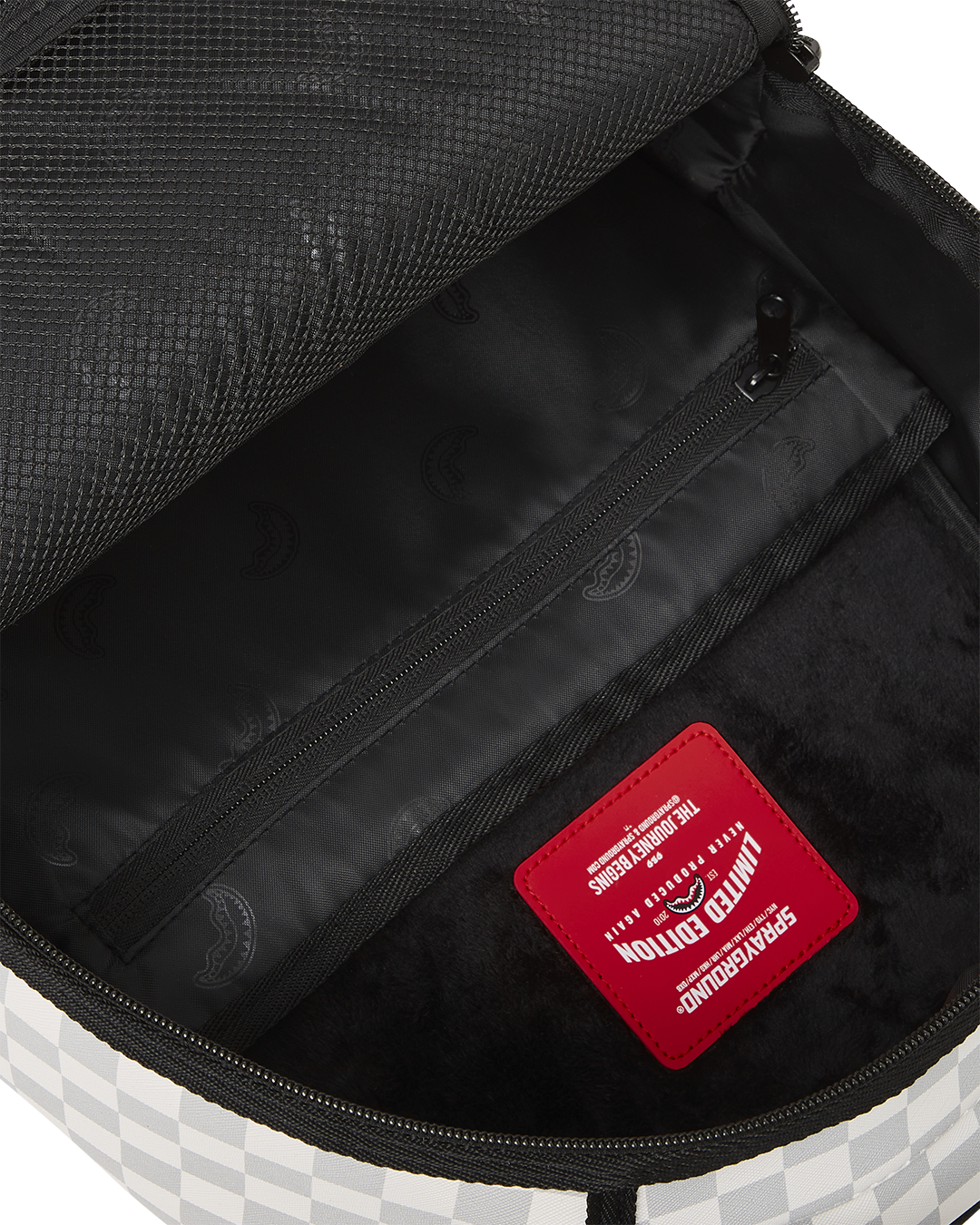 Dimensions: 18' x 6' x 11.5' • Front zipper pocket • Side pockets • Zippered Stash pocket • Separate velour sunglass compartment • Ergonomic mesh back padding • Adjustable Straps for custom sizing • Gold zippers with metal hardware • Metal 'Sprayground Authentic' badge • Slide through back sleeve connects to carry-on luggage to free your hands