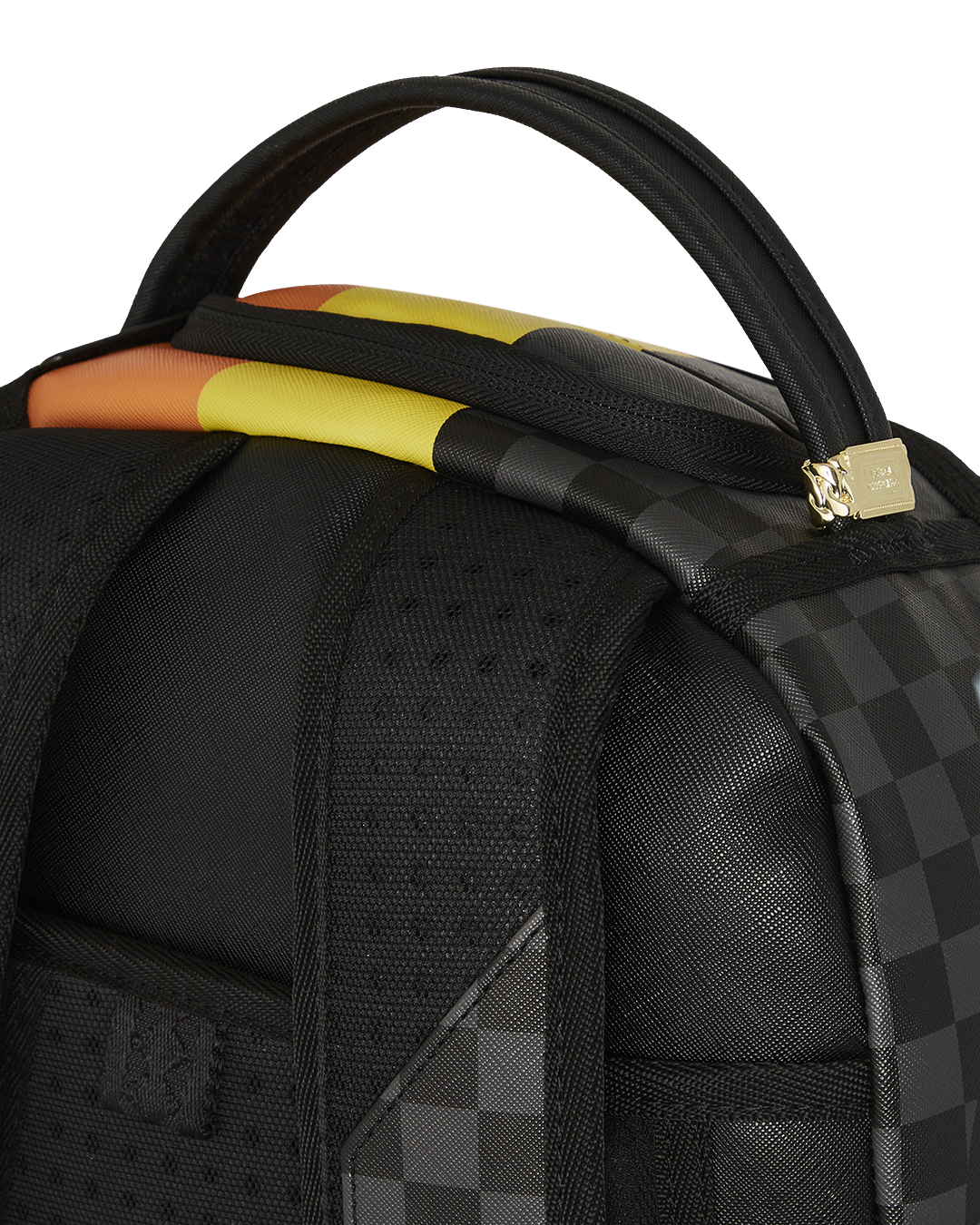 Dimensions: 18' x 6' x 11.5' • Front zipper pocket • Side pockets • Zippered Stash pocket • Separate velour sunglass compartment • Ergonomic mesh back padding • Adjustable Straps for custom sizing • Gold zippers with metal hardware • Metal 'Sprayground Authentic' badge • Slide through back sleeve connects to carry-on luggage to free your hands