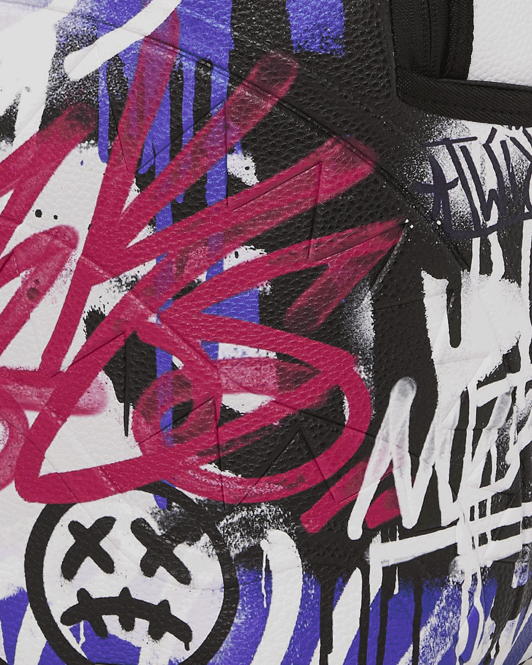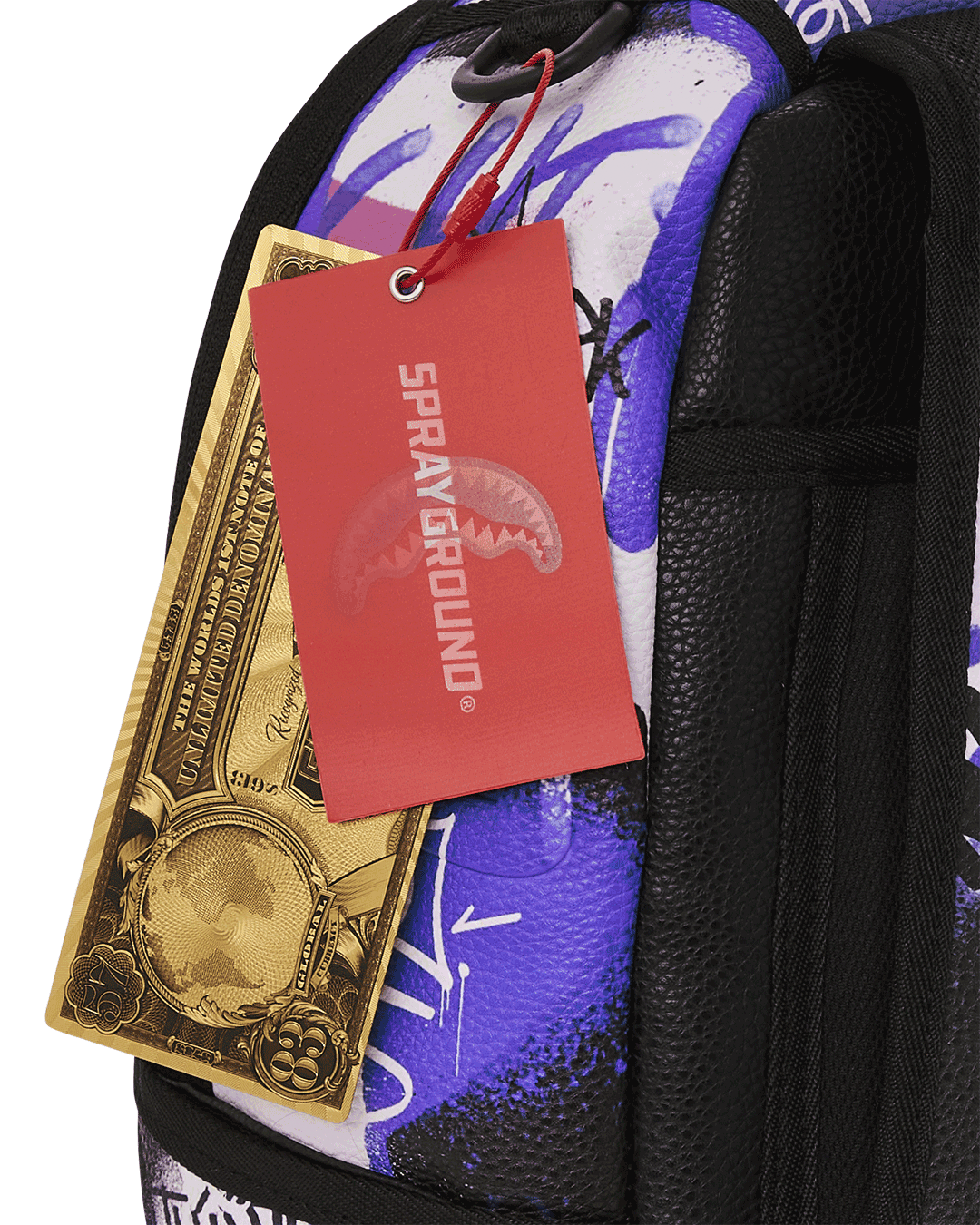 Dimensions: 18' x 6' x 11.5' • Front zipper pocket • Side pockets • Zippered Stash pocket • Separate velour sunglass compartment • Ergonomic mesh back padding • Adjustable Straps for custom sizing • Gold zippers with metal hardware • Metal 'Sprayground Authentic' badge • Slide through back sleeve connects to carry-on luggage to free your hands
