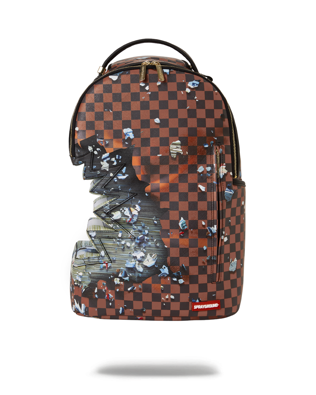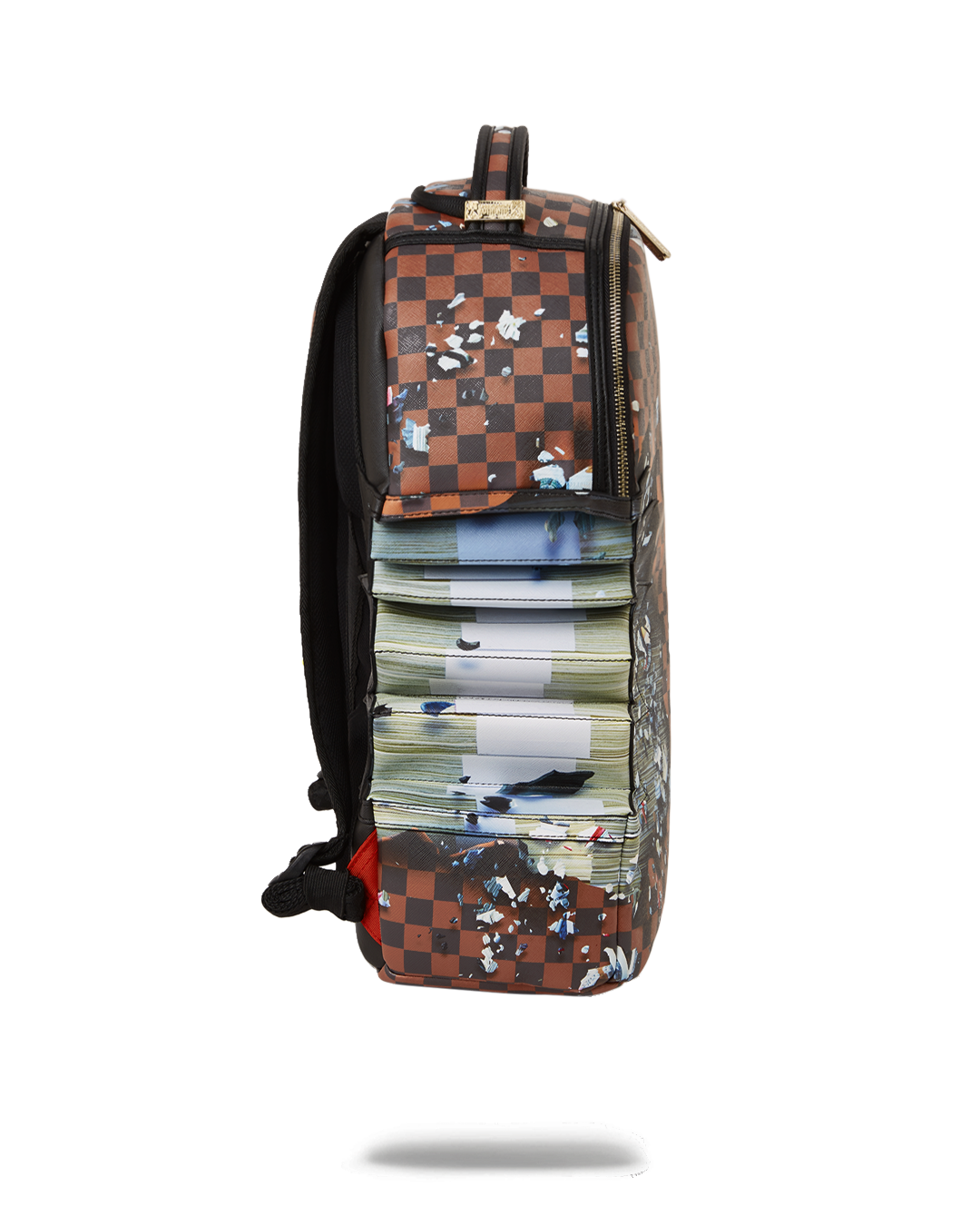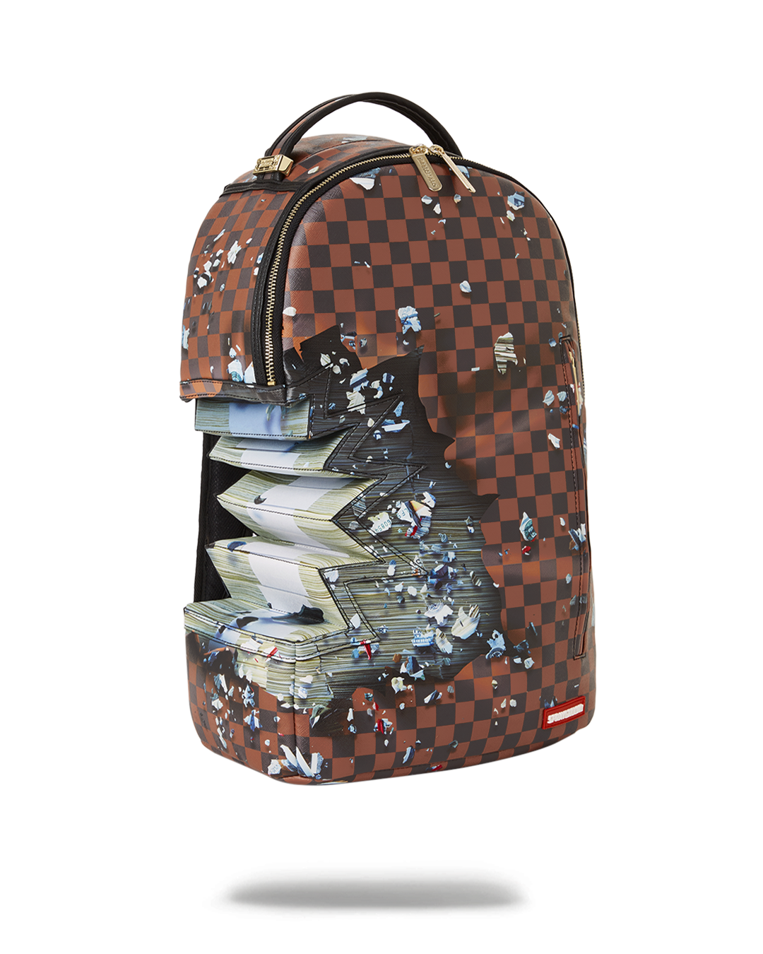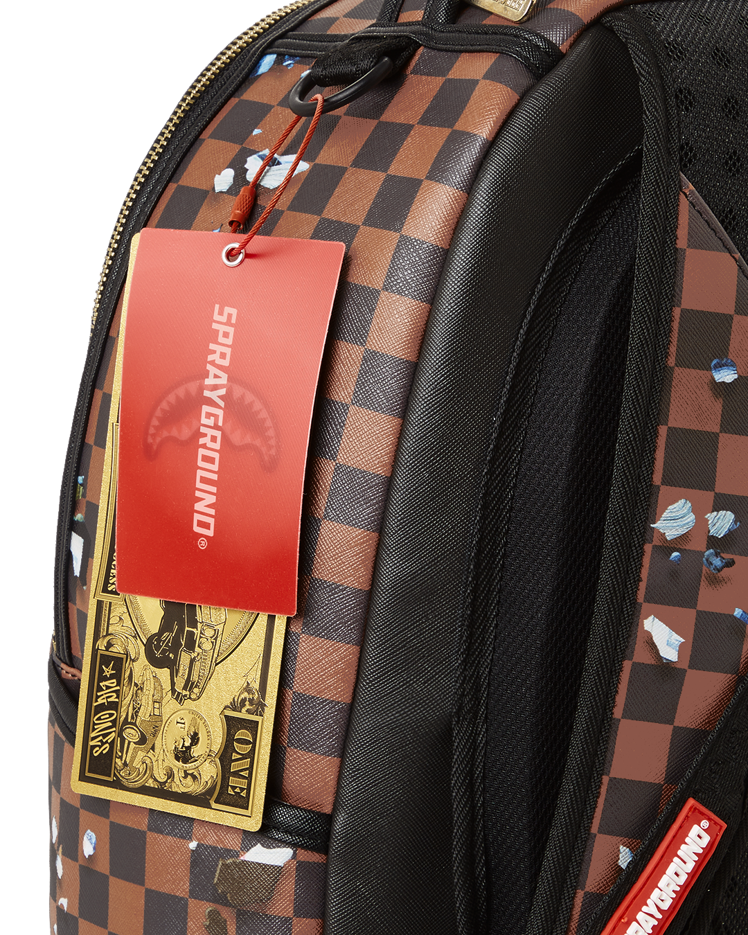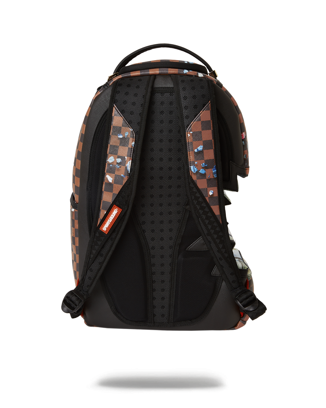 Dimensions: 18' x 6' x 11.5' • Front zipper pocket • Side pockets • Zippered Stash pocket • Separate velour sunglass compartment • Ergonomic mesh back padding • Adjustable Straps for custom sizing • Gold zippers with metal hardware • Metal 'Sprayground Authentic' badge • Slide through back sleeve connects to carry-on luggage to free your hands