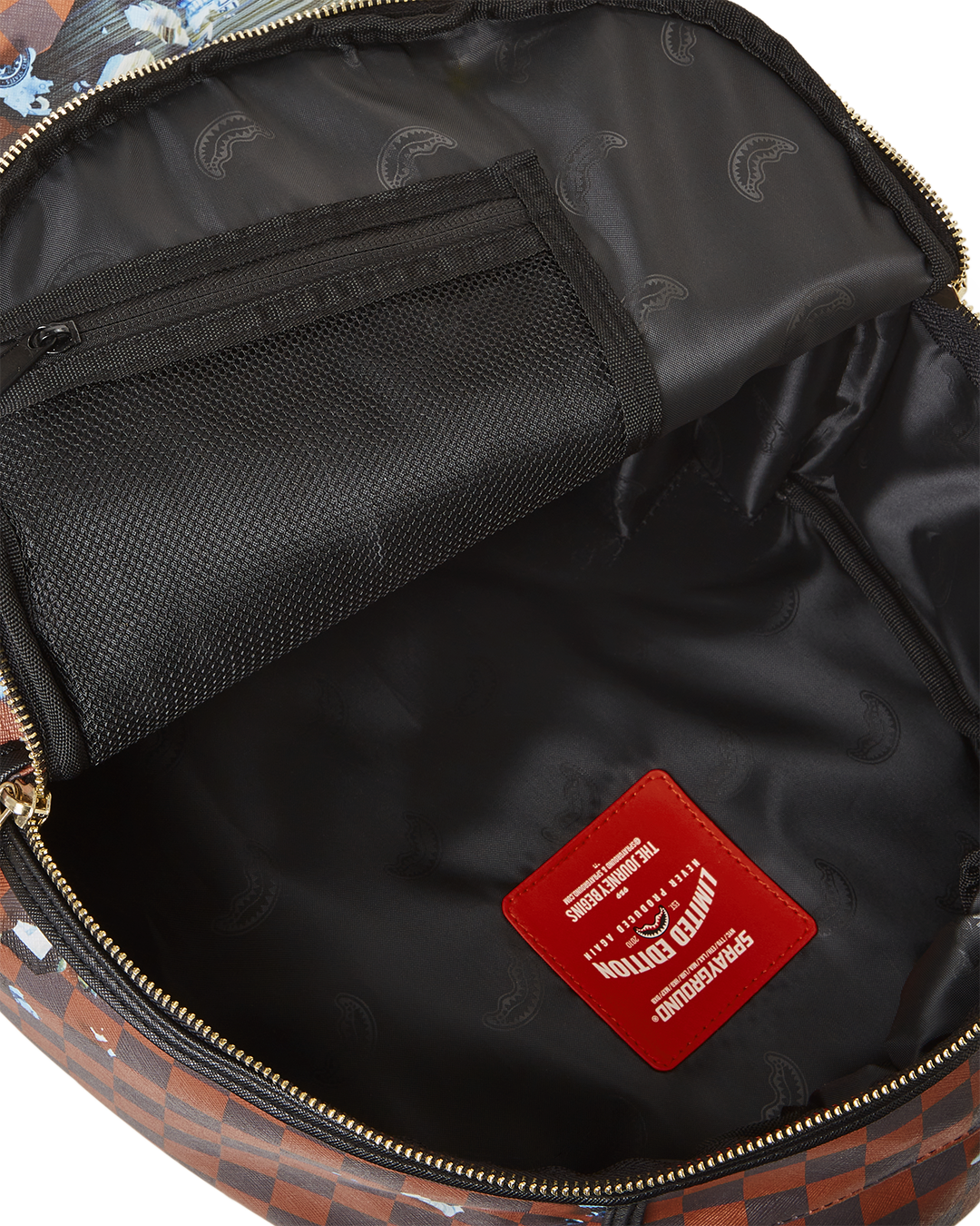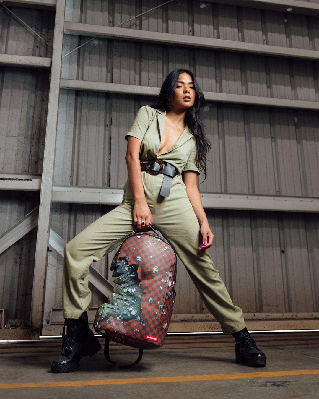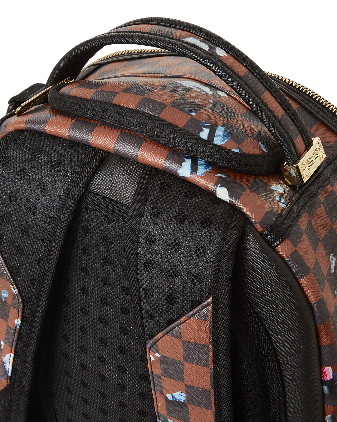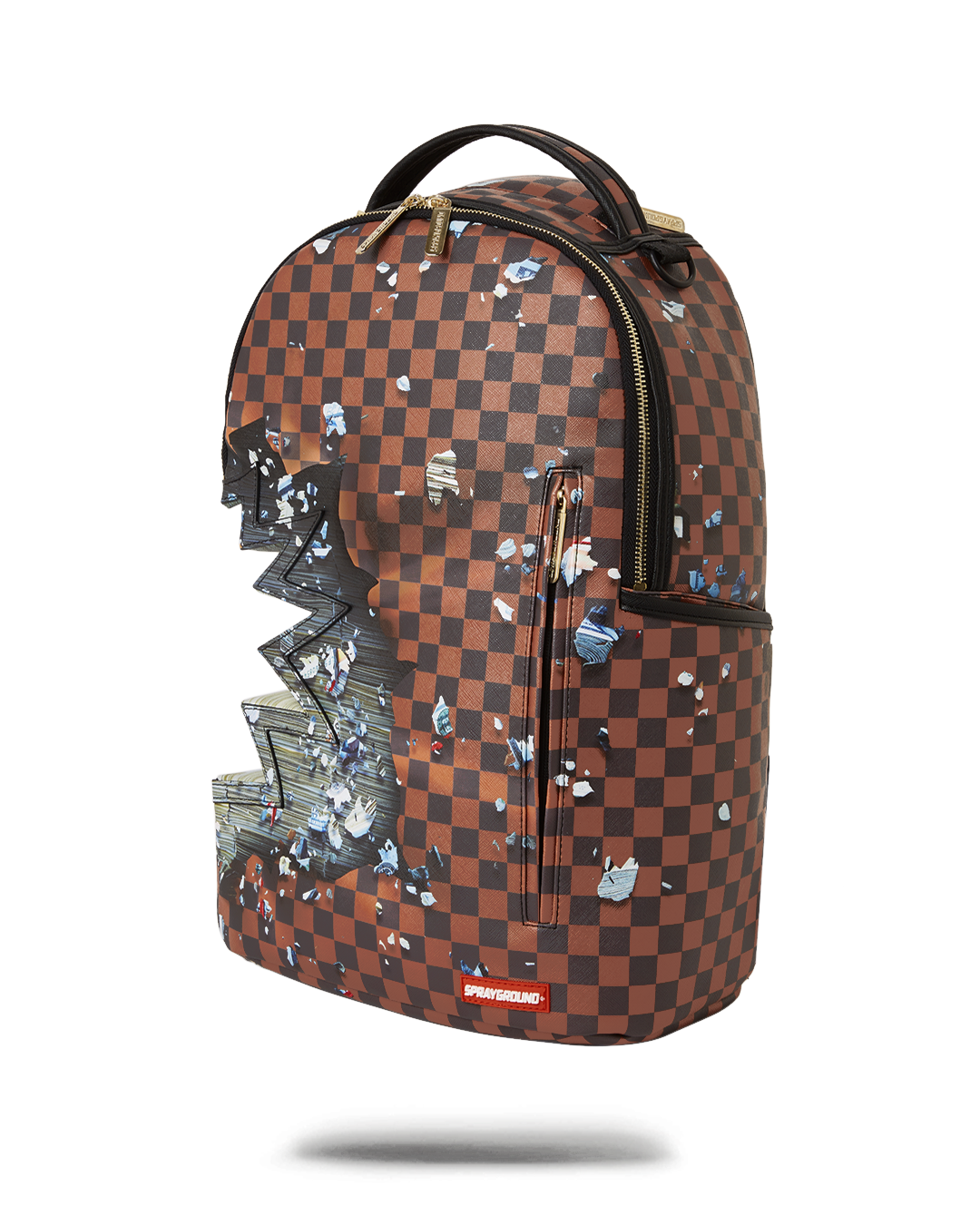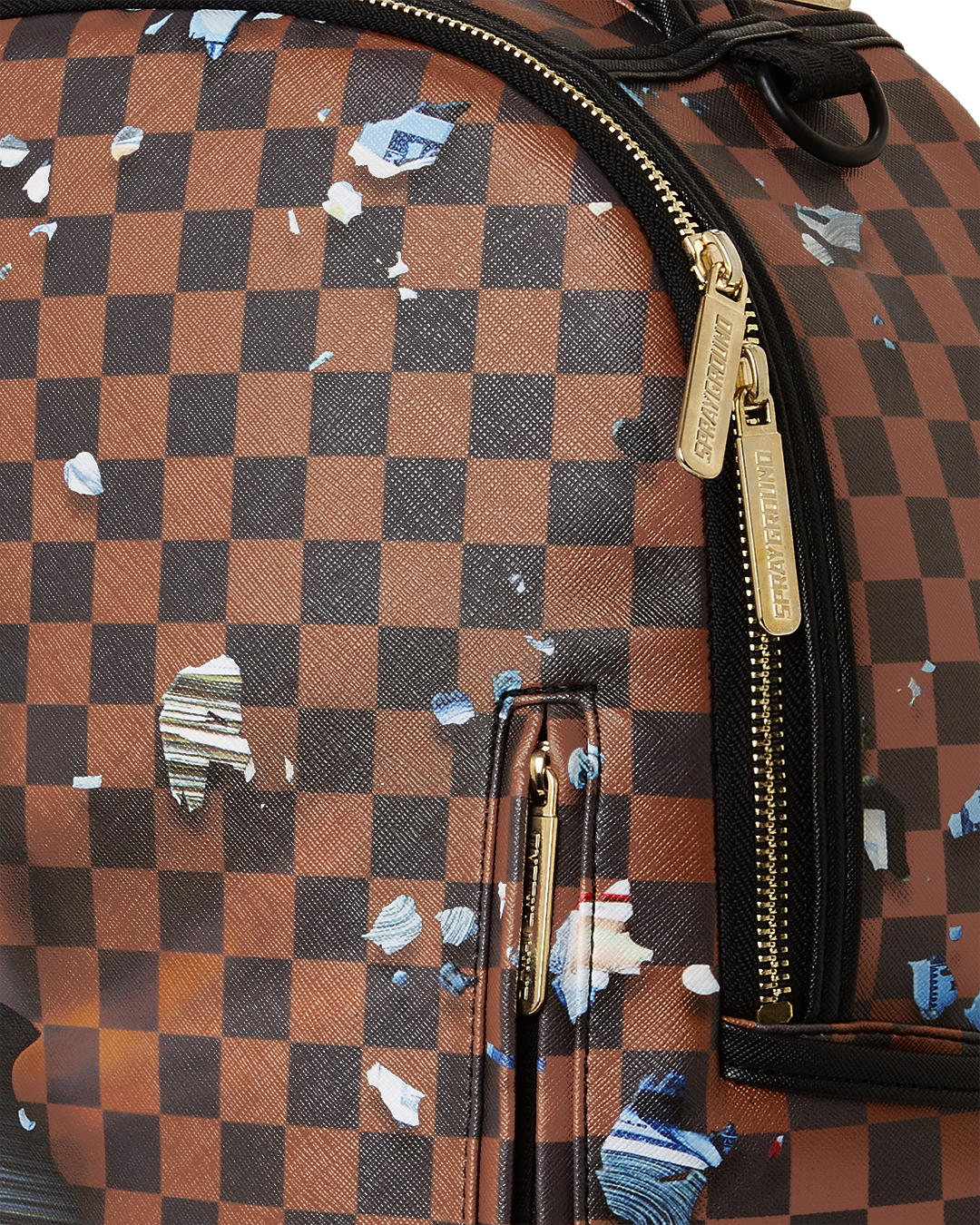 Dimensions: 18' x 6' x 11.5' • Front zipper pocket • Side pockets • Zippered Stash pocket • Separate velour sunglass compartment • Ergonomic mesh back padding • Adjustable Straps for custom sizing • Gold zippers with metal hardware • Metal 'Sprayground Authentic' badge • Slide through back sleeve connects to carry-on luggage to free your hands