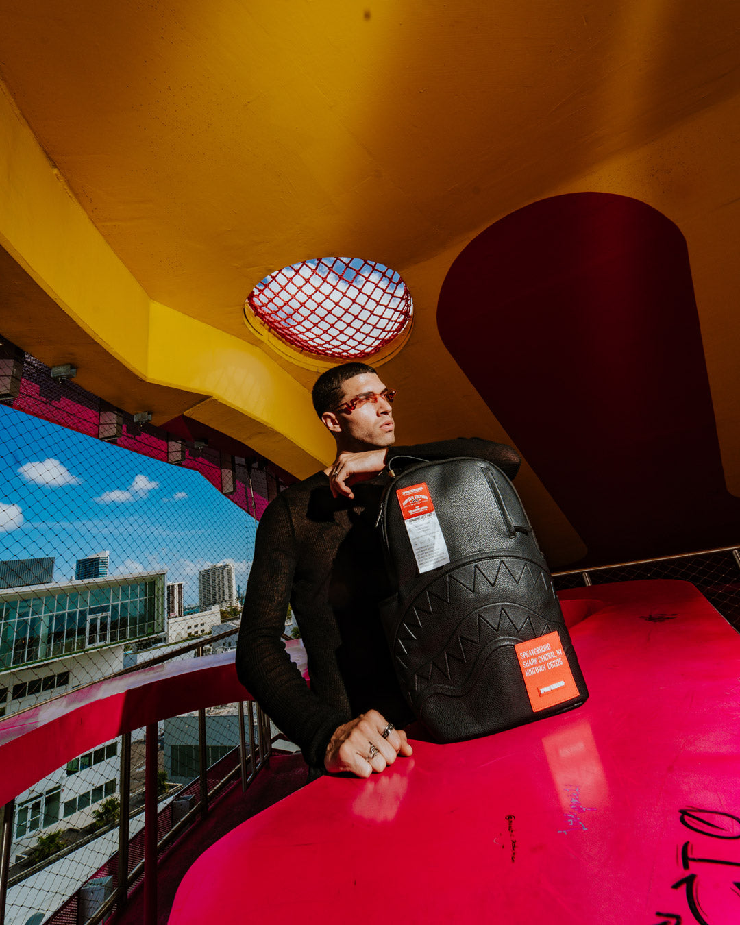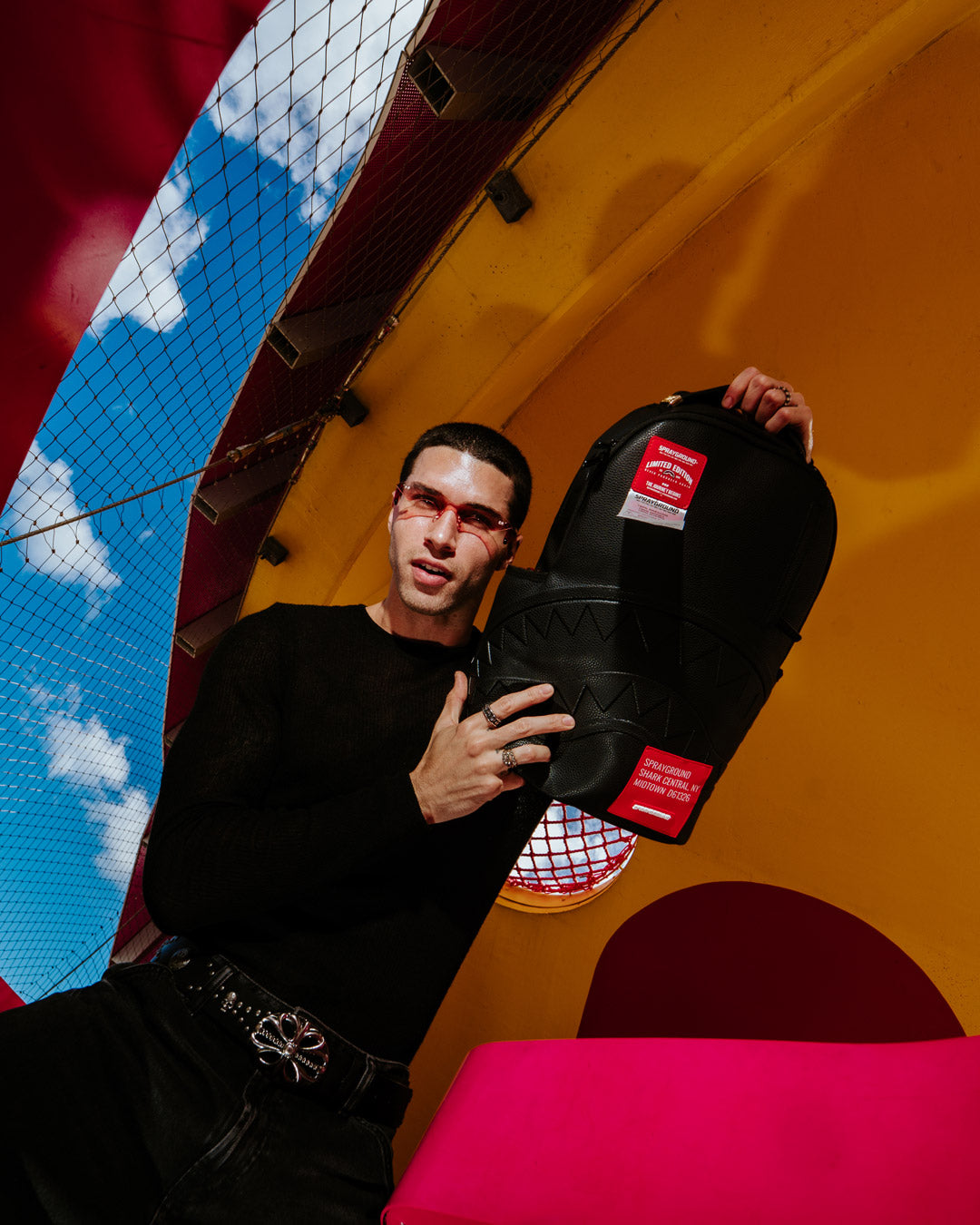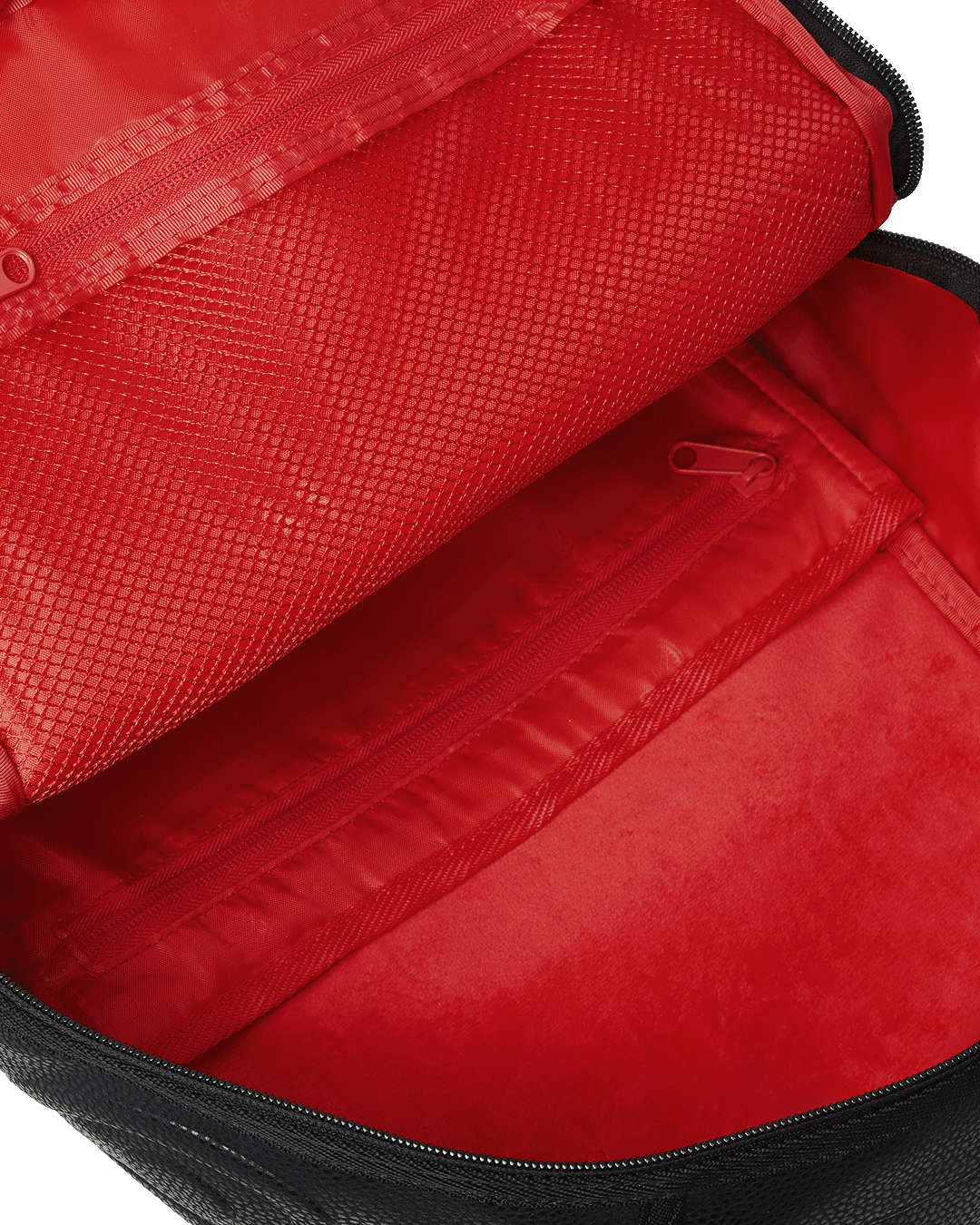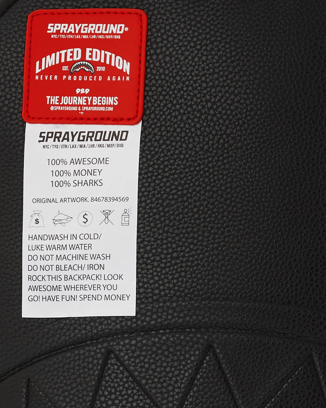 Dimensions: 18' x 6' x 11.5' • Front zipper pocket • Side pockets • Zippered Stash pocket • Separate velour sunglass compartment • Ergonomic mesh back padding • Adjustable Straps for custom sizing • Gold zippers with metal hardware • Metal 'Sprayground Authentic' badge • Slide through back sleeve connects to carry-on luggage to free your hands