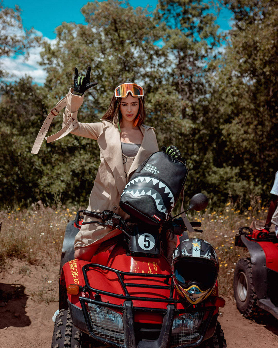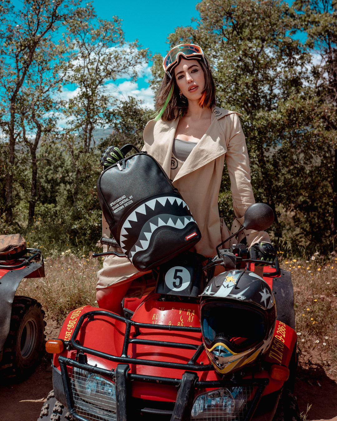 Dimensions: 18' x 6' x 11.5' • Front zipper pocket • Side pockets • Zippered Stash pocket • Separate velour sunglass compartment • Ergonomic mesh back padding • Adjustable Straps for custom sizing • Gold zippers with metal hardware • Metal 'Sprayground Authentic' badge • Slide through back sleeve connects to carry-on luggage to free your hands