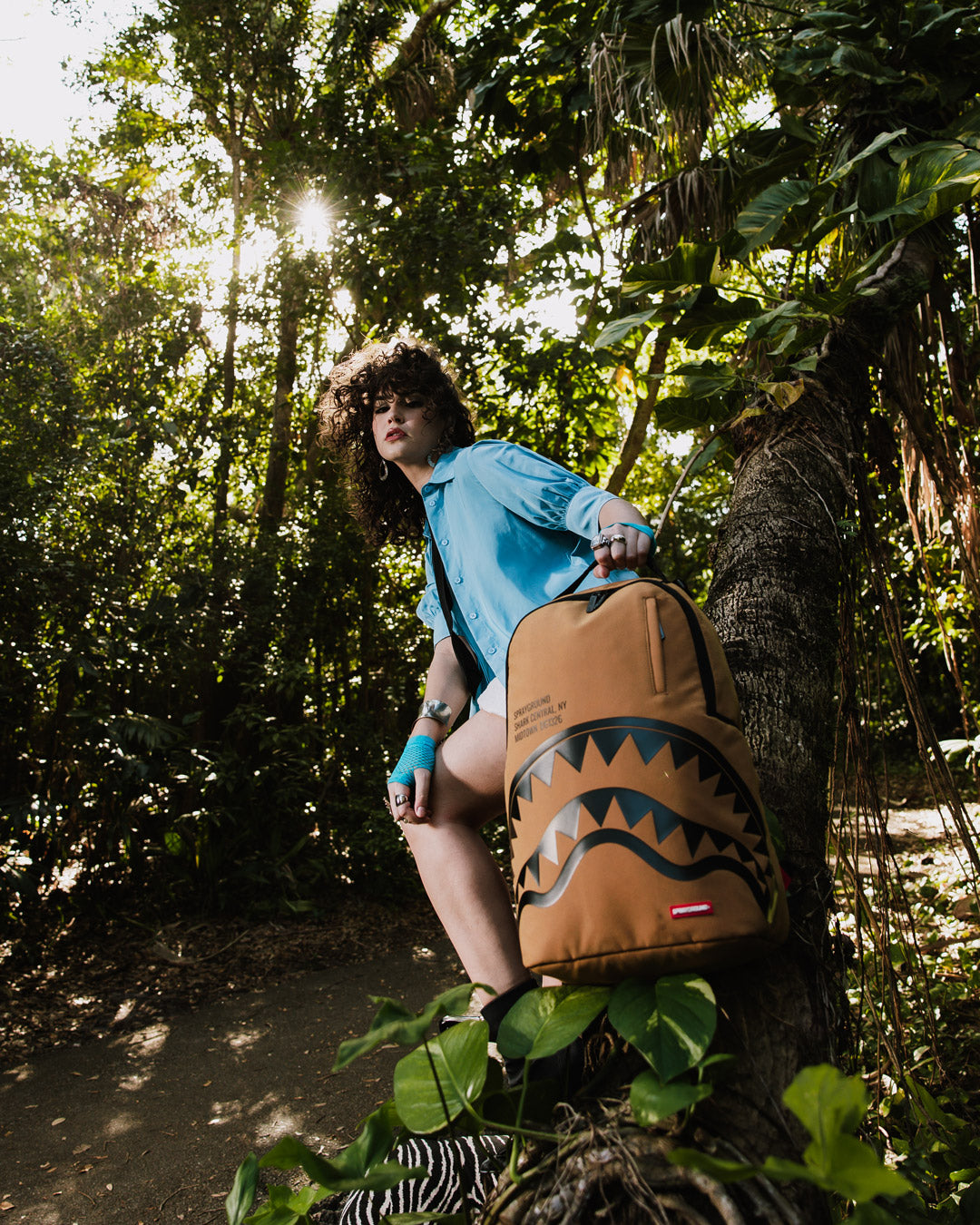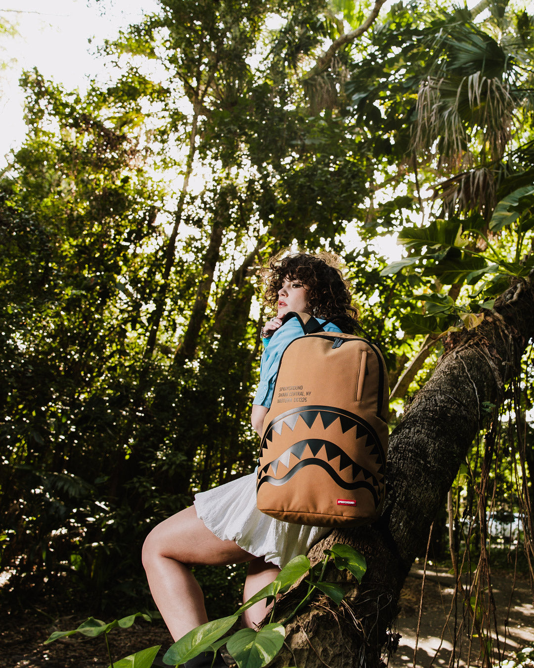 Dimensions: 18' x 6' x 11.5' • Front zipper pocket • Side pockets • Zippered Stash pocket • Separate velour sunglass compartment • Ergonomic mesh back padding • Adjustable Straps for custom sizing • Gold zippers with metal hardware • Metal 'Sprayground Authentic' badge • Slide through back sleeve connects to carry-on luggage to free your hands