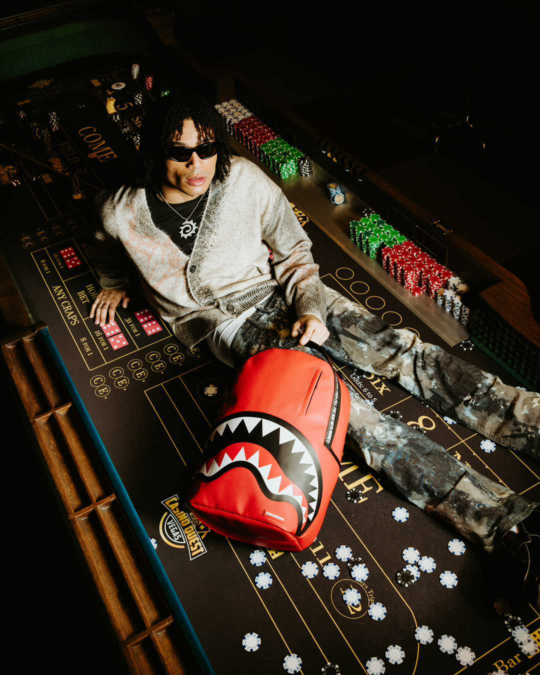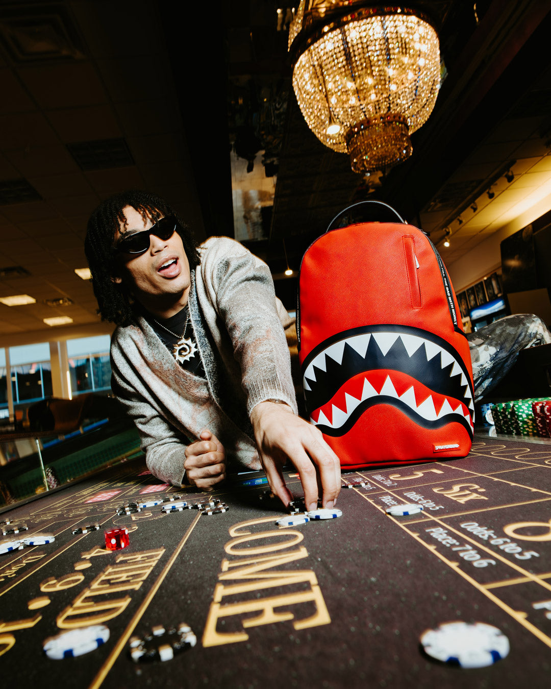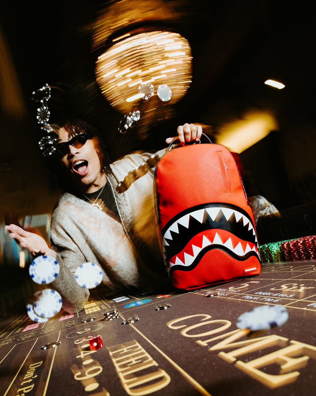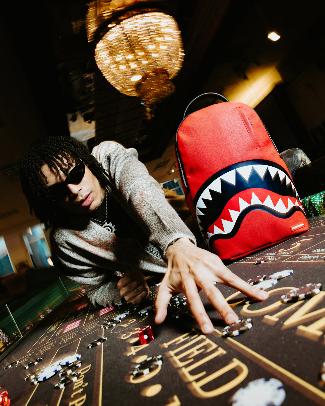 Dimensions: 18' x 6' x 11.5' • Front zipper pocket • Side pockets • Zippered Stash pocket • Separate velour sunglass compartment • Ergonomic mesh back padding • Adjustable Straps for custom sizing • Gold zippers with metal hardware • Metal 'Sprayground Authentic' badge • Slide through back sleeve connects to carry-on luggage to free your hands