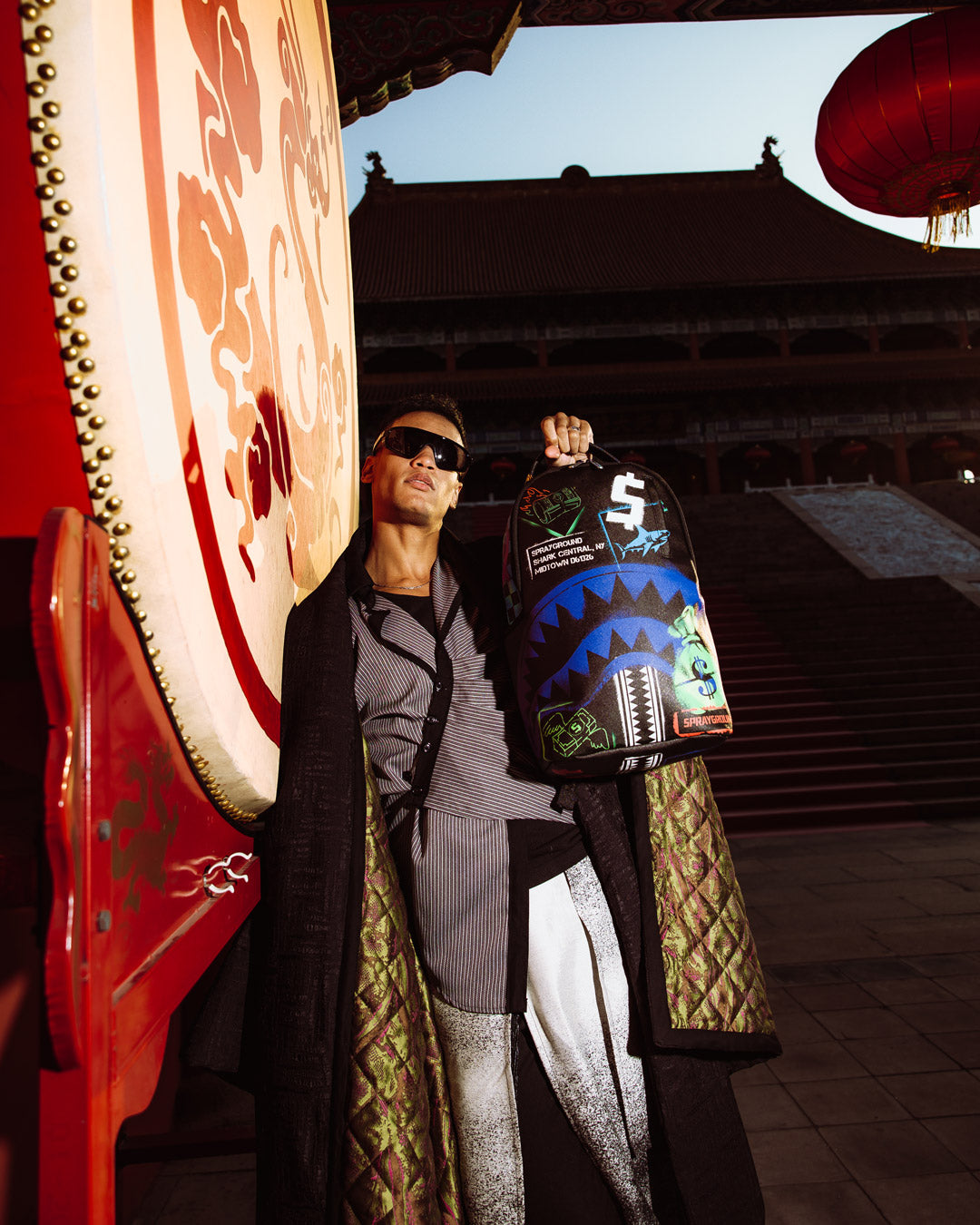 Dimensions: 18' x 6' x 11.5' • Front zipper pocket • Side pockets • Zippered Stash pocket • Separate velour sunglass compartment • Ergonomic mesh back padding • Adjustable Straps for custom sizing • Gold zippers with metal hardware • Metal 'Sprayground Authentic' badge • Slide through back sleeve connects to carry-on luggage to free your hands