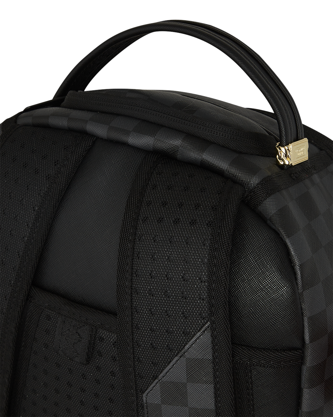 Dimensions: 18' x 8' x 25' • Front zipper pocket • Side pockets • Zippered Stash pocket • Separate velour sunglass compartment • Ergonomic mesh back padding • Adjustable Straps for custom sizing • Gold zippers with metal hardware • Metal 'Sprayground Authentic' badge • Slide through back sleeve connects to carry-on luggage to free your hands