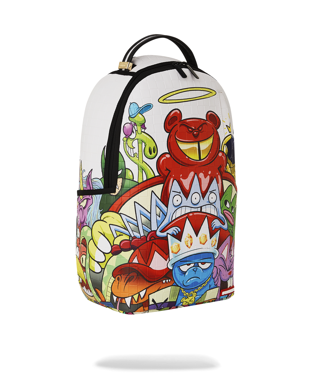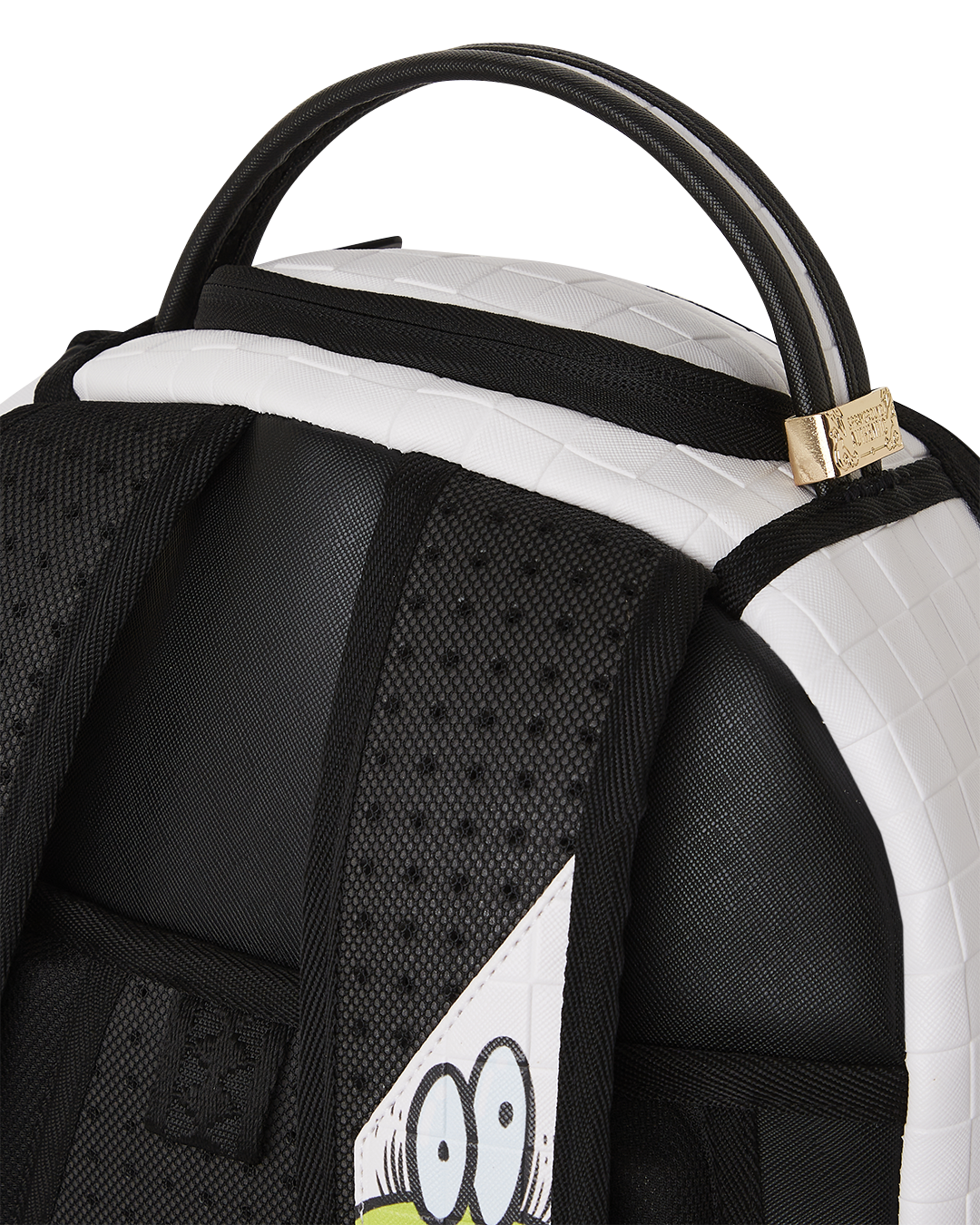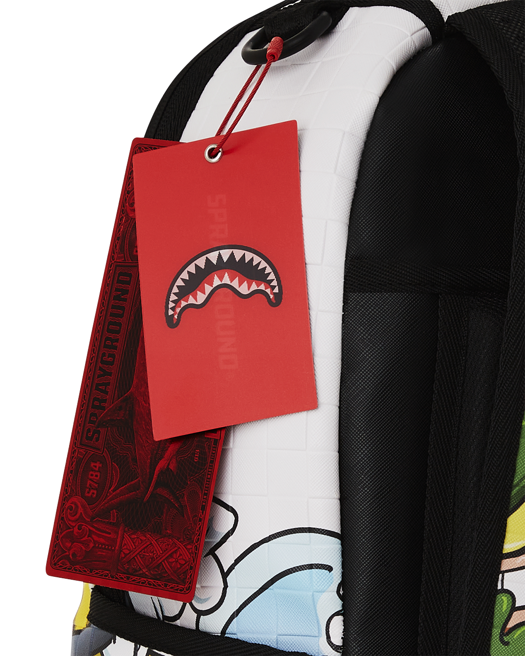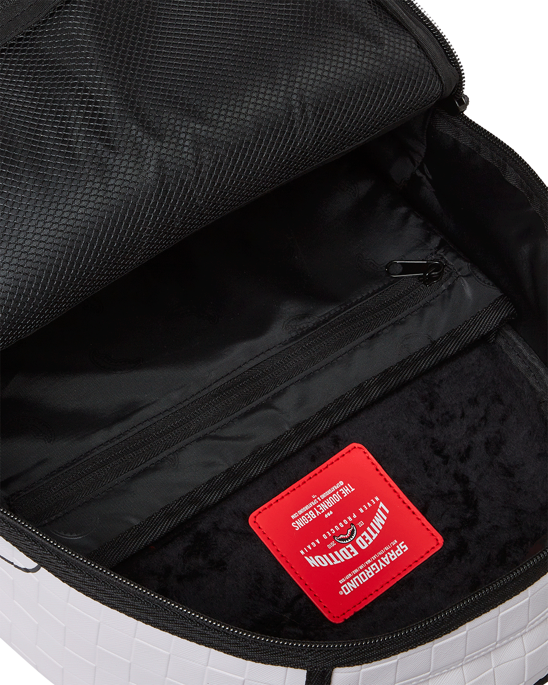 Dimensions: 18' x 6' x 11.5' • Front zipper pocket • Side pockets • Zippered Stash pocket • Separate velour sunglass compartment • Ergonomic mesh back padding • Adjustable Straps for custom sizing • Gold zippers with metal hardware • Metal 'Sprayground Authentic' badge • Slide through back sleeve connects to carry-on luggage to free your hands