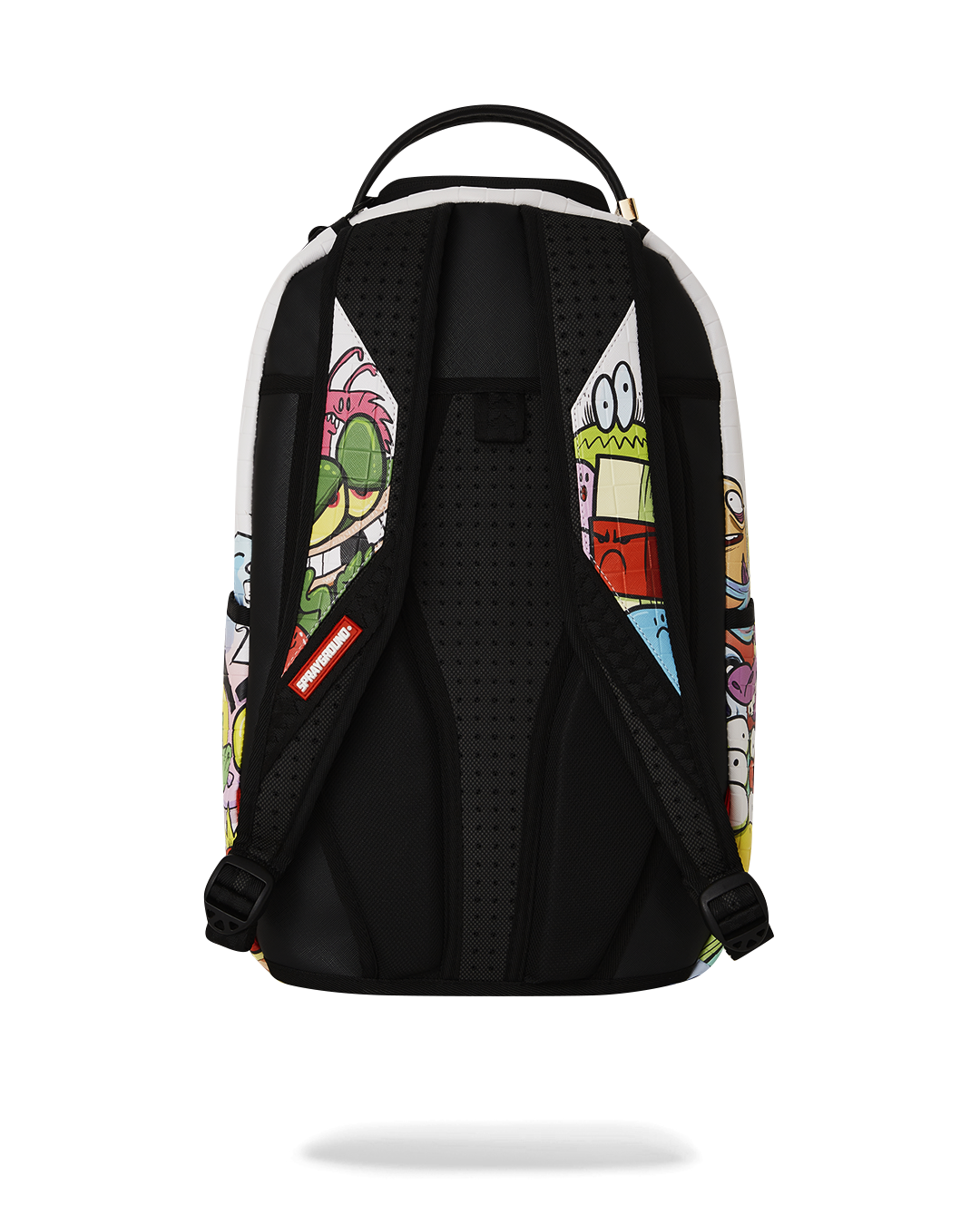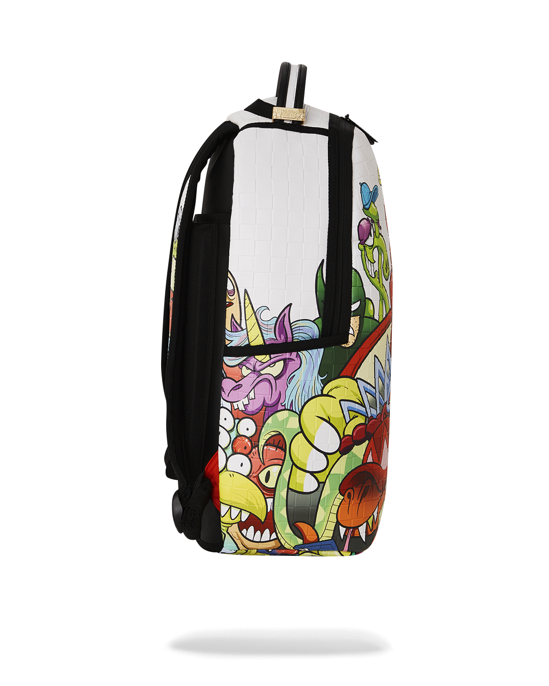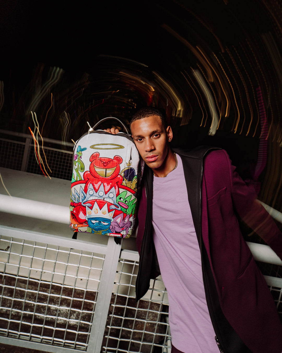 Dimensions: 18' x 6' x 11.5' • Front zipper pocket • Side pockets • Zippered Stash pocket • Separate velour sunglass compartment • Ergonomic mesh back padding • Adjustable Straps for custom sizing • Gold zippers with metal hardware • Metal 'Sprayground Authentic' badge • Slide through back sleeve connects to carry-on luggage to free your hands