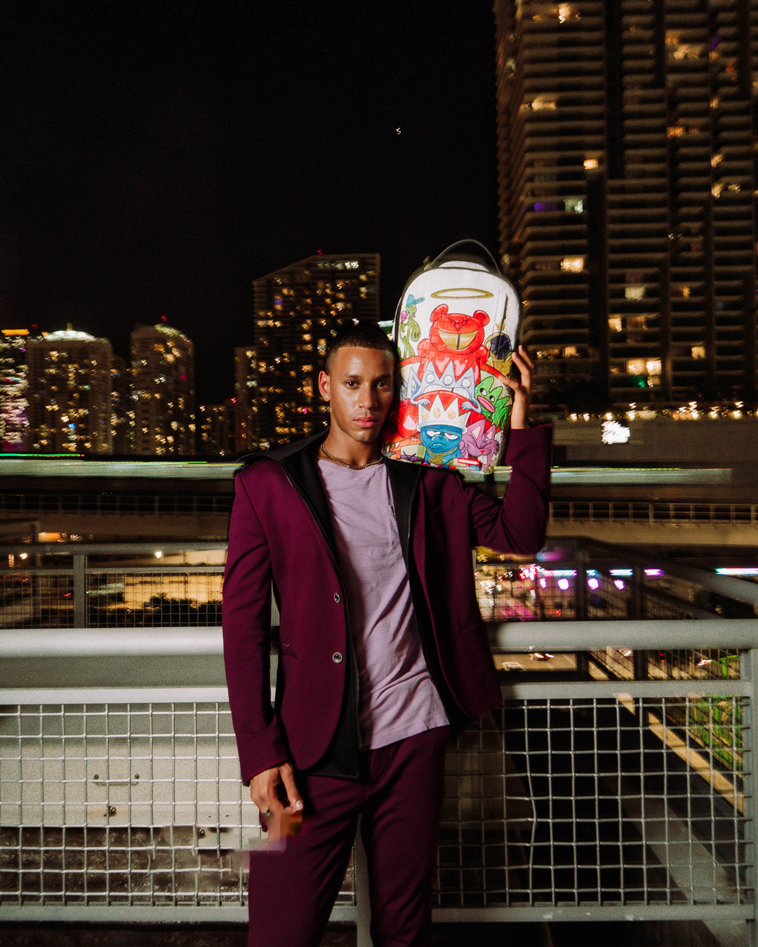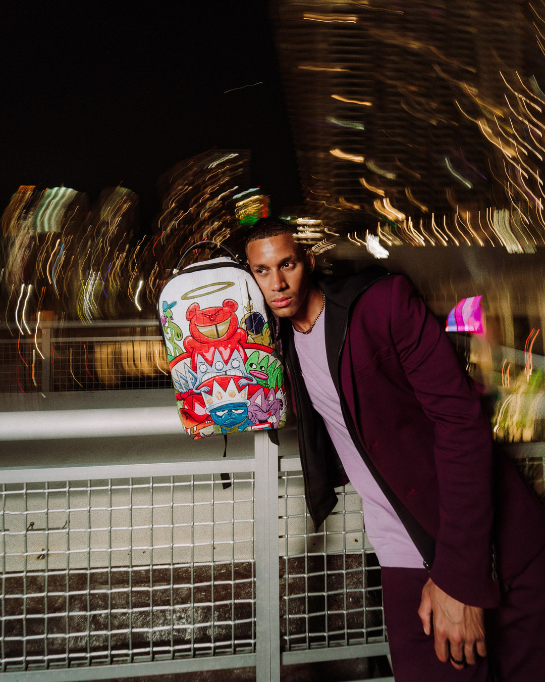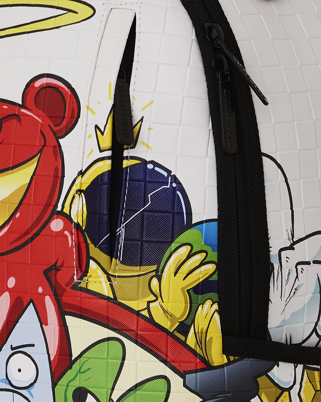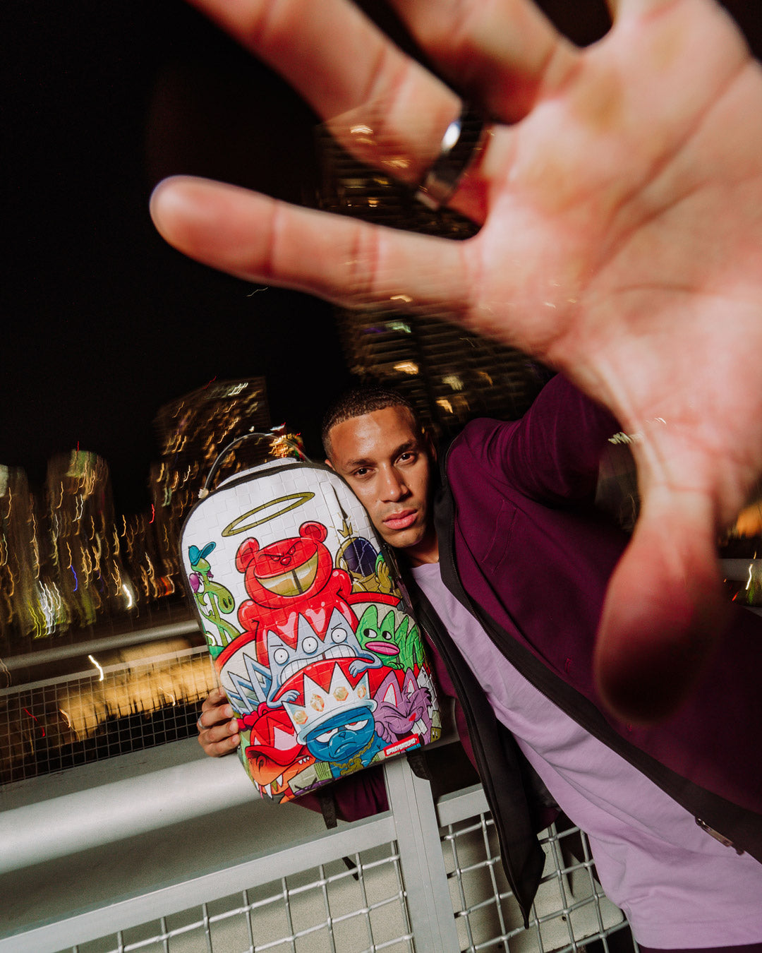 Dimensions: 18' x 6' x 11.5' • Front zipper pocket • Side pockets • Zippered Stash pocket • Separate velour sunglass compartment • Ergonomic mesh back padding • Adjustable Straps for custom sizing • Gold zippers with metal hardware • Metal 'Sprayground Authentic' badge • Slide through back sleeve connects to carry-on luggage to free your hands