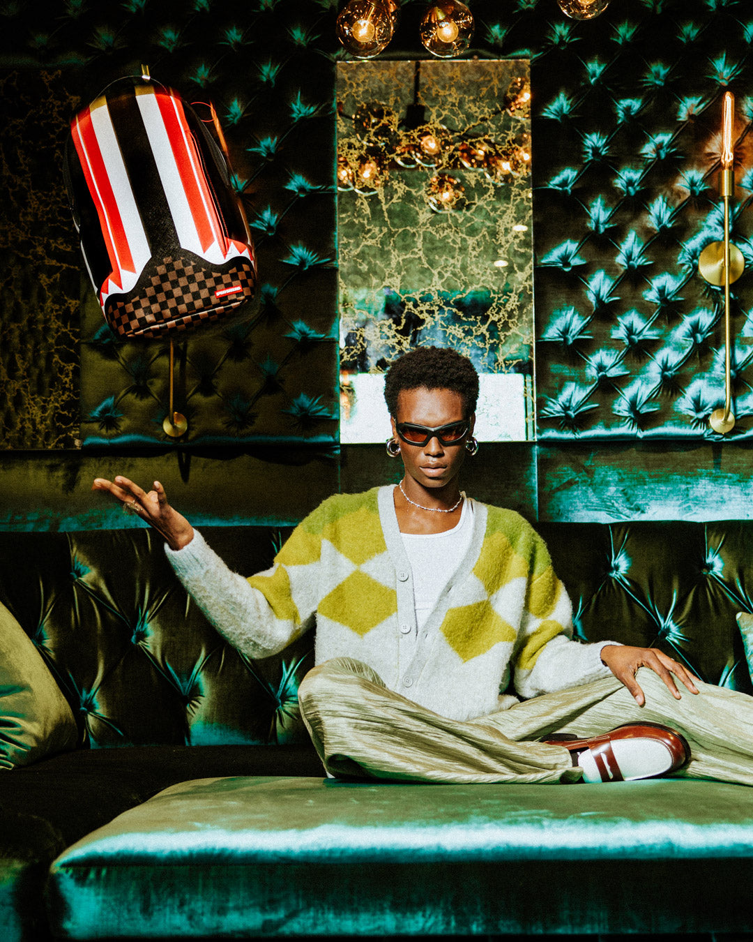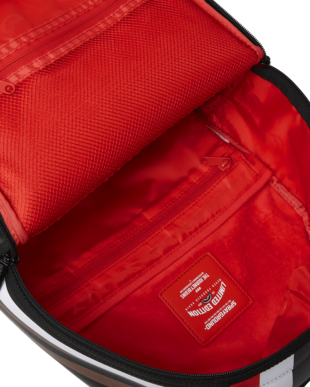 Dimensions: 18' x 6' x 11.5' • Front zipper pocket • Side pockets • Zippered Stash pocket • Separate velour sunglass compartment • Ergonomic mesh back padding • Adjustable Straps for custom sizing • Gold zippers with metal hardware • Metal 'Sprayground Authentic' badge • Slide through back sleeve connects to carry-on luggage to free your hands