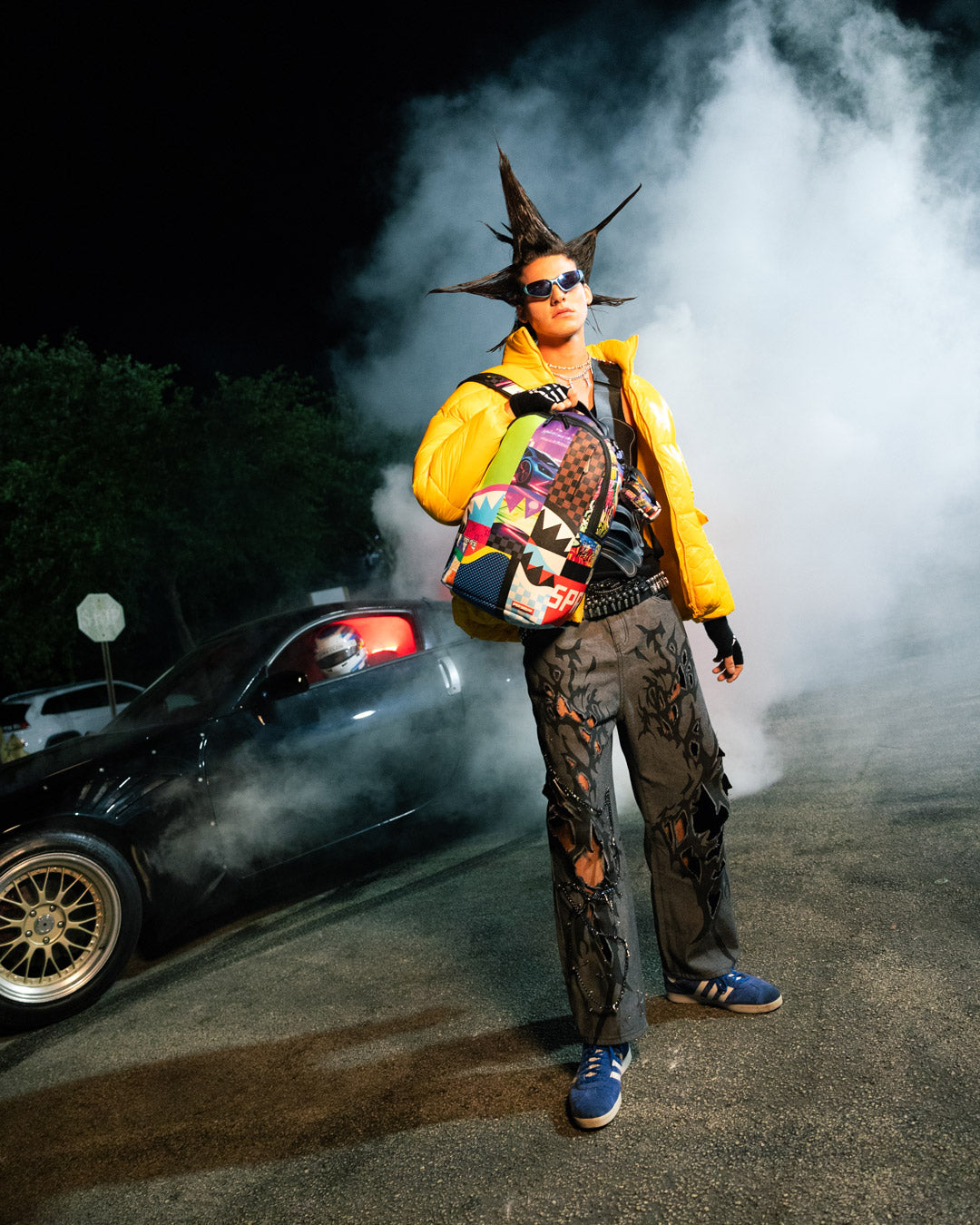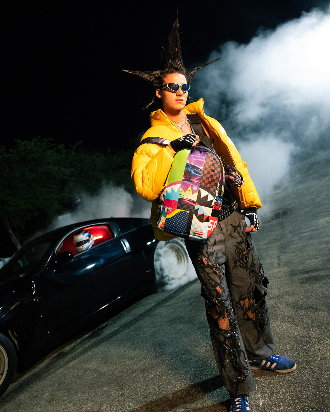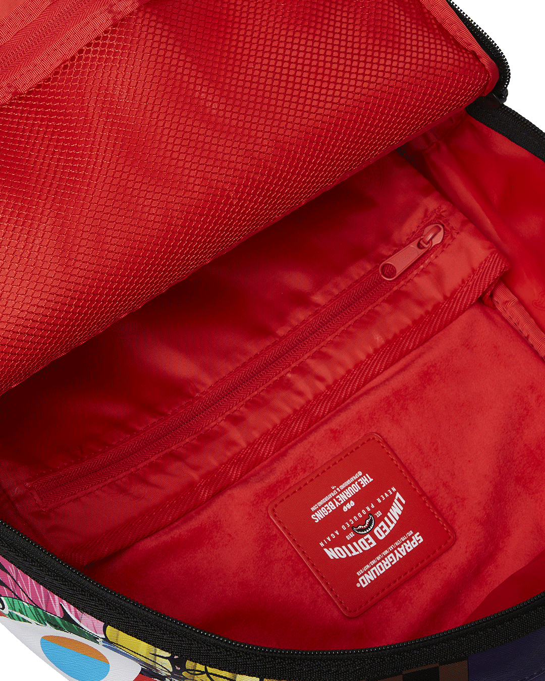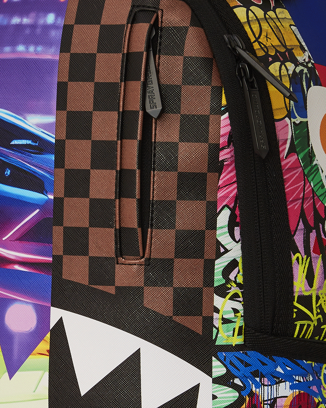 Dimensions: 18' x 6' x 11.5' • Front zipper pocket • Side pockets • Zippered Stash pocket • Separate velour sunglass compartment • Ergonomic mesh back padding • Adjustable Straps for custom sizing • Gold zippers with metal hardware • Metal 'Sprayground Authentic' badge • Slide through back sleeve connects to carry-on luggage to free your hands