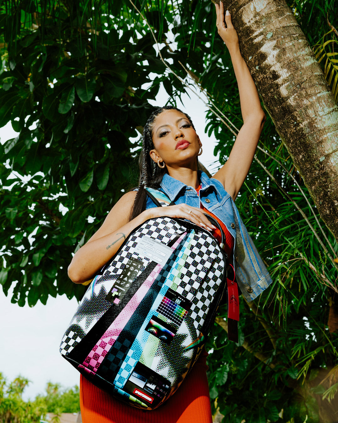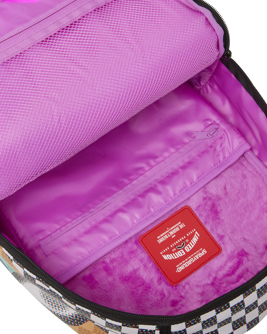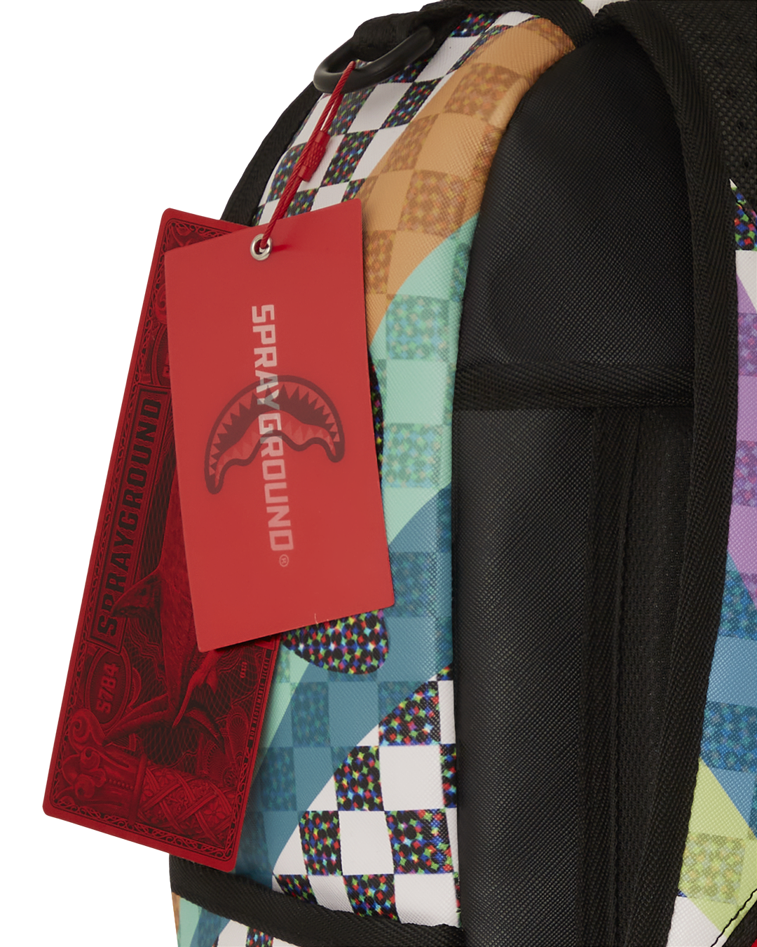 Dimensions: 18' x 6' x 11.5' • Front zipper pocket • Side pockets • Zippered Stash pocket • Separate velour sunglass compartment • Ergonomic mesh back padding • Adjustable Straps for custom sizing • Gold zippers with metal hardware • Metal 'Sprayground Authentic' badge • Slide through back sleeve connects to carry-on luggage to free your hands
