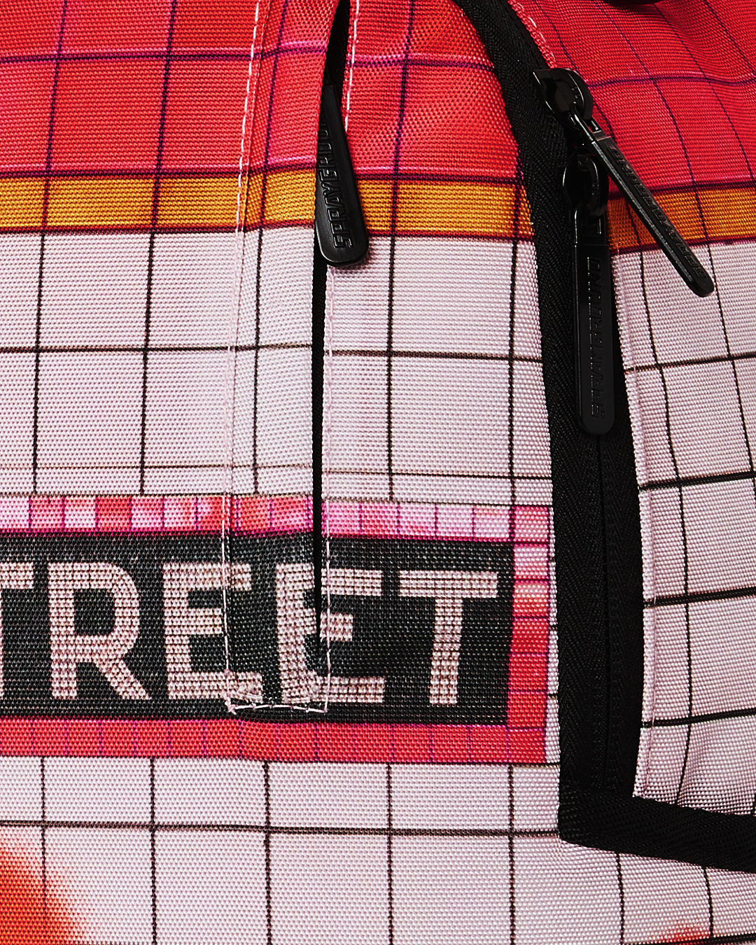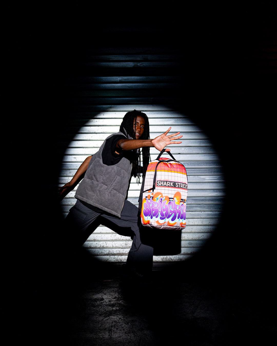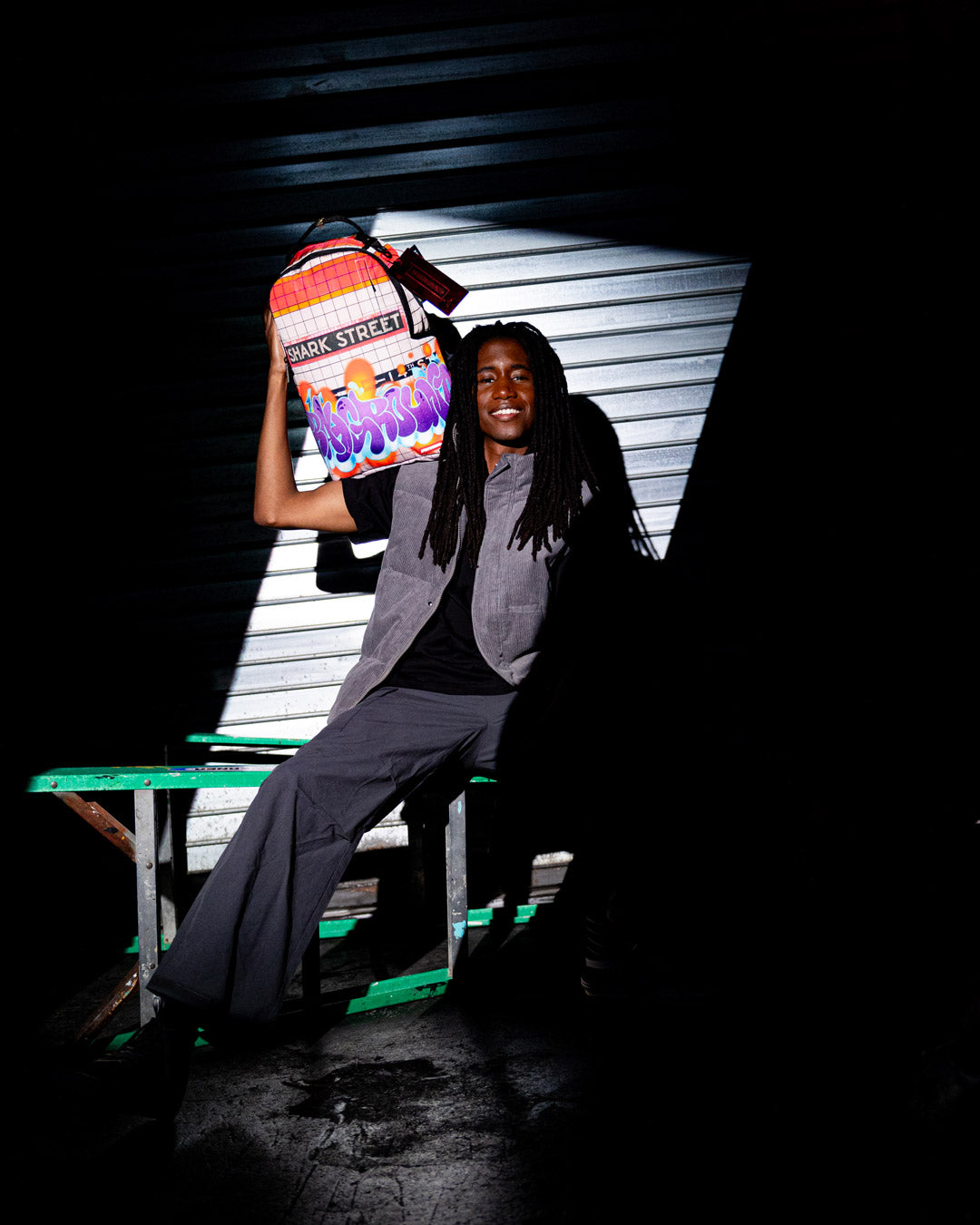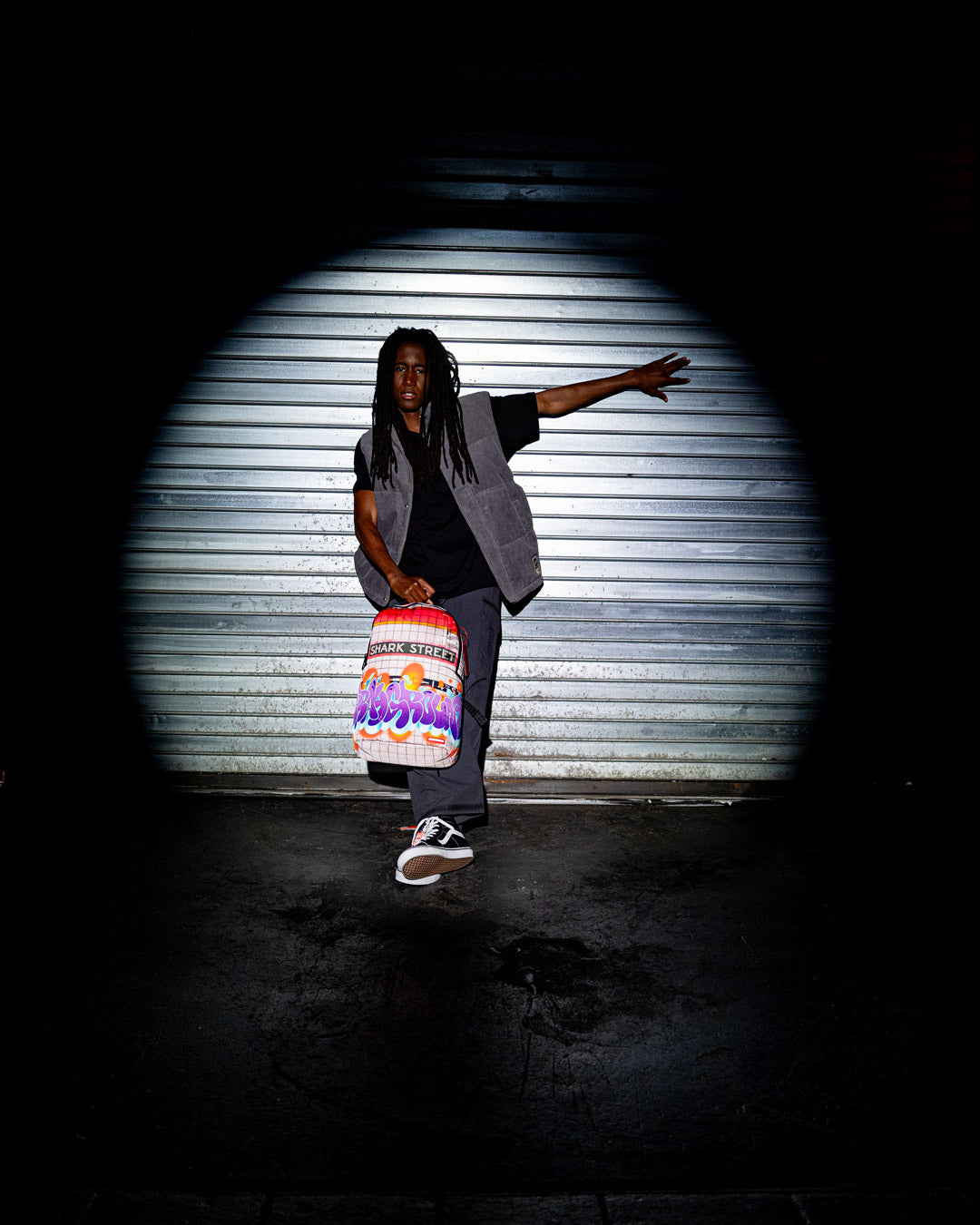Dimensions: 18' x 6' x 11.5' • Front zipper pocket • Side pockets • Zippered Stash pocket • Separate velour sunglass compartment • Ergonomic mesh back padding • Adjustable Straps for custom sizing • Gold zippers with metal hardware • Metal 'Sprayground Authentic' badge • Slide through back sleeve connects to carry-on luggage to free your hands