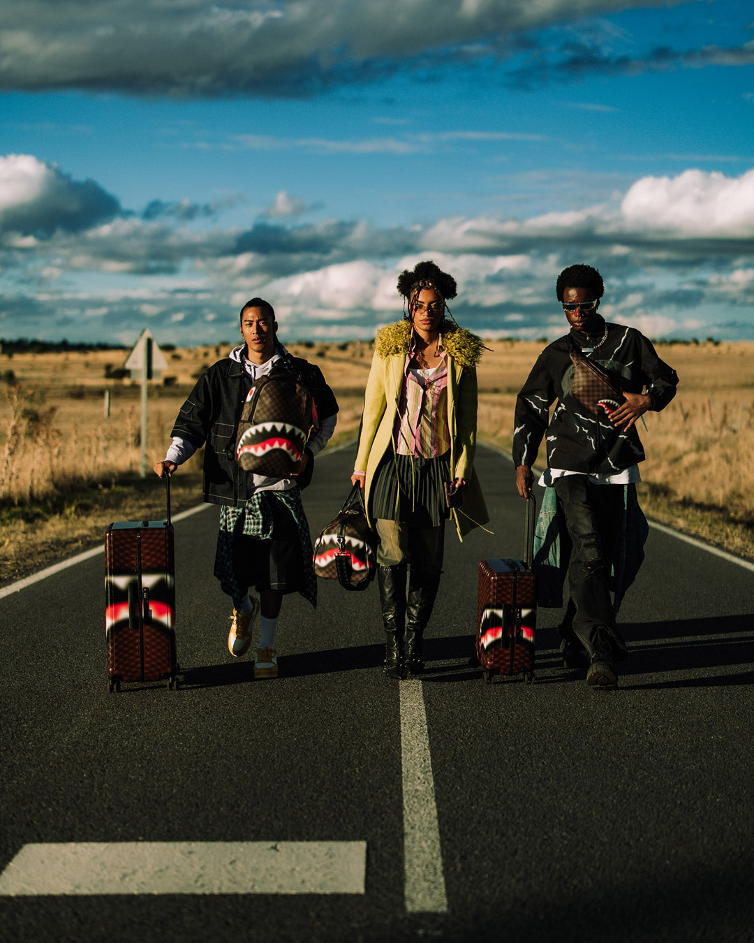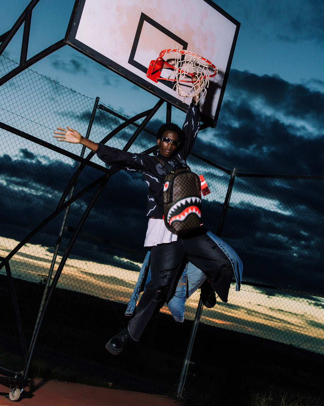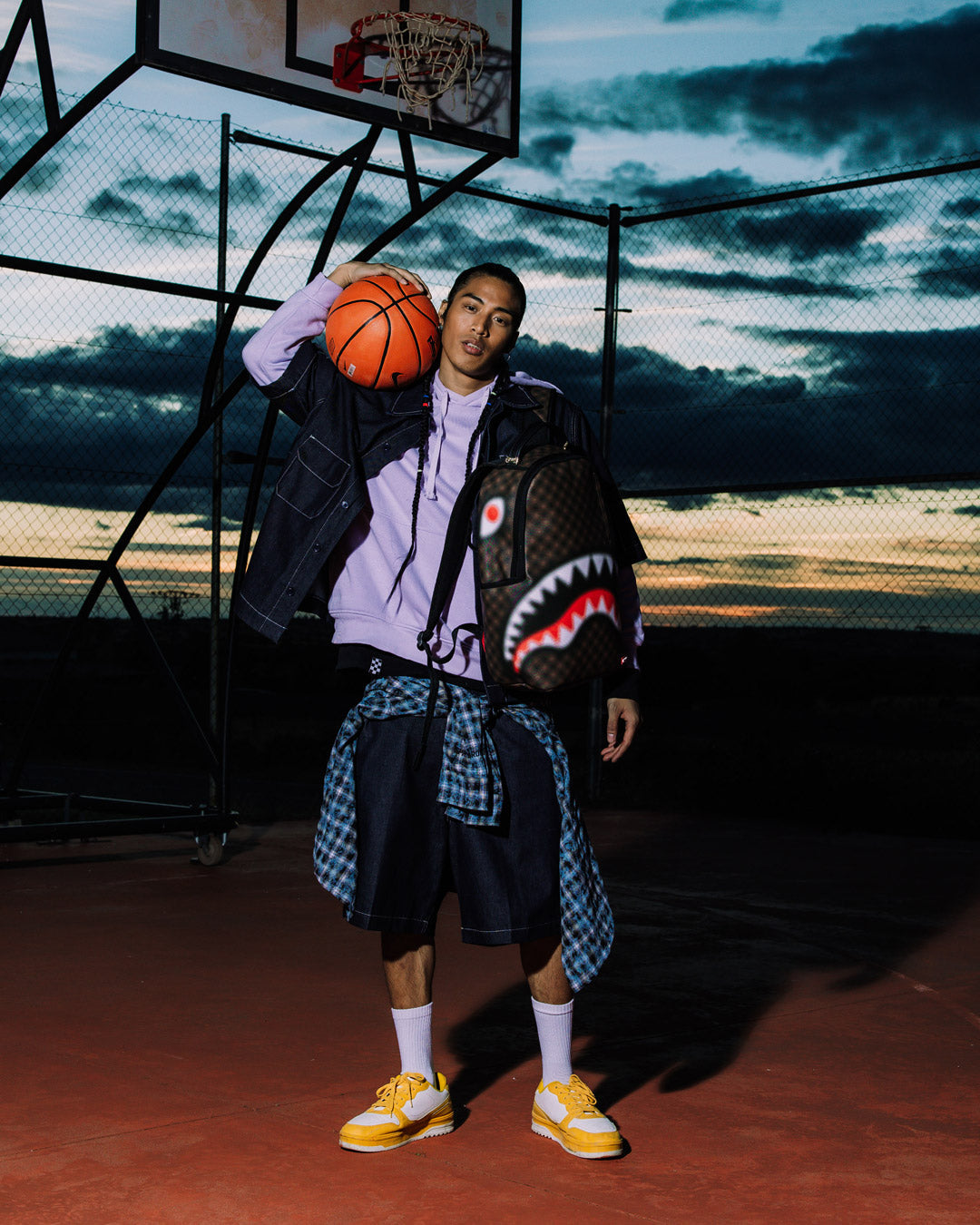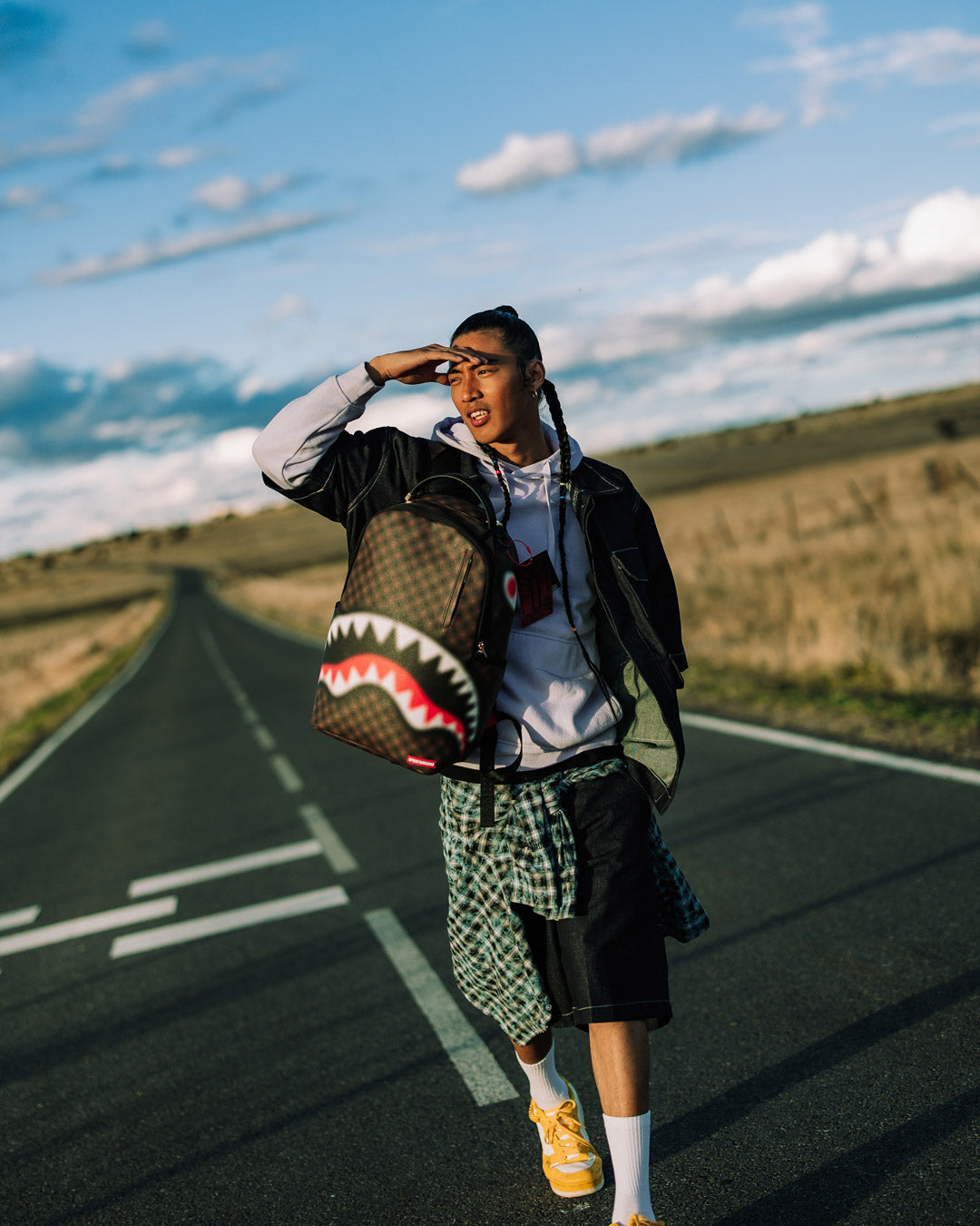 Dimensions: 18' x 6' x 11.5' • Front zipper pocket • Side pockets • Zippered Stash pocket • Separate velour sunglass compartment • Ergonomic mesh back padding • Adjustable Straps for custom sizing • Gold zippers with metal hardware • Metal 'Sprayground Authentic' badge • Slide through back sleeve connects to carry-on luggage to free your hands