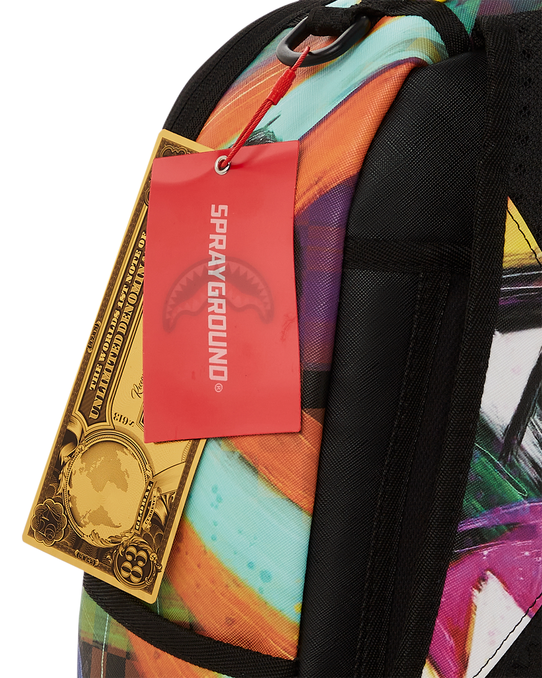 Dimensions: 18' x 6' x 11.5' • Front zipper pocket • Side pockets • Zippered Stash pocket • Separate velour sunglass compartment • Ergonomic mesh back padding • Adjustable Straps for custom sizing • Gold zippers with metal hardware • Metal 'Sprayground Authentic' badge • Slide through back sleeve connects to carry-on luggage to free your hands