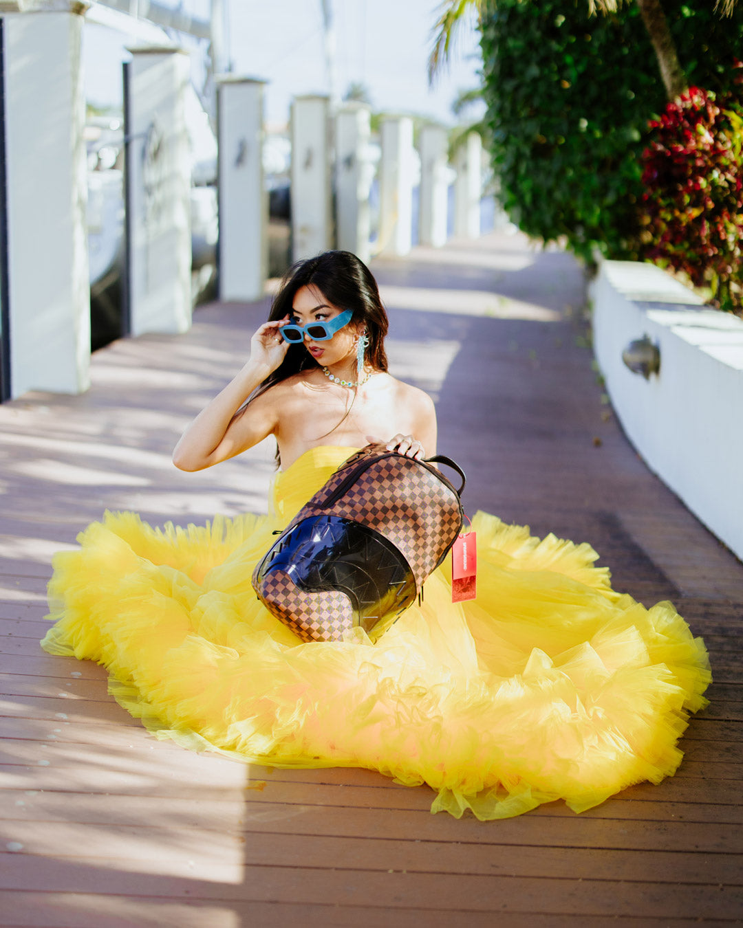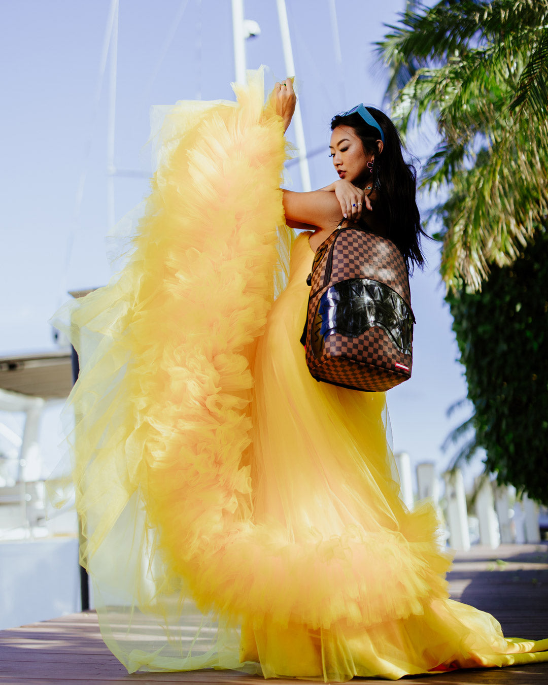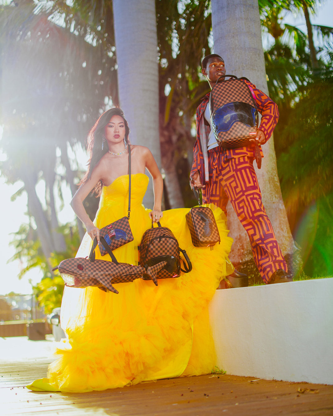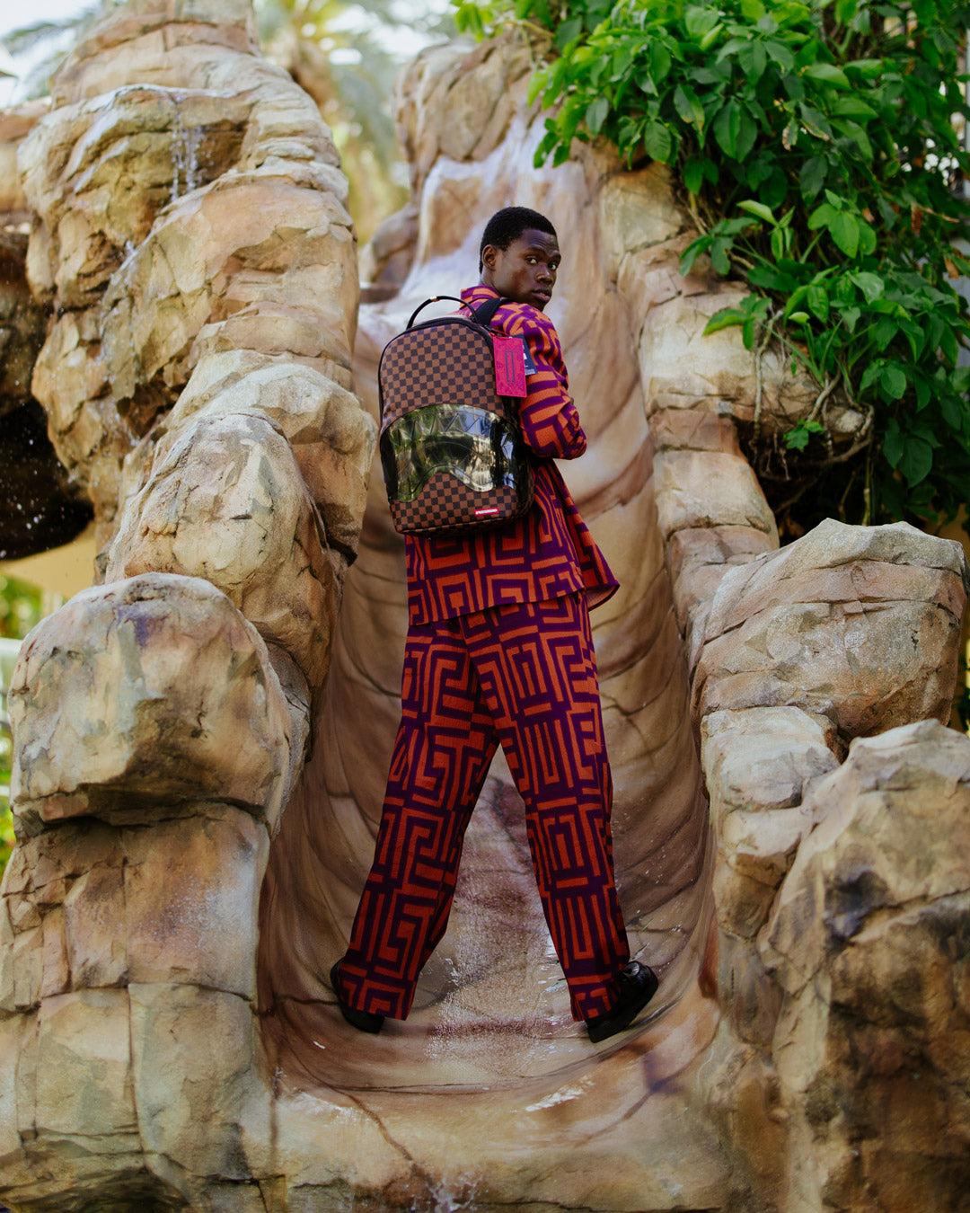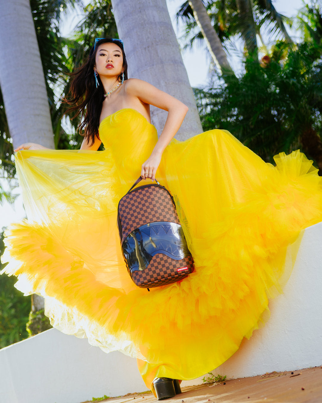 Dimensions: 18' x 6' x 11.5' • Front zipper pocket • Side pockets • Zippered Stash pocket • Separate velour sunglass compartment • Ergonomic mesh back padding • Adjustable Straps for custom sizing • Gold zippers with metal hardware • Metal 'Sprayground Authentic' badge • Slide through back sleeve connects to carry-on luggage to free your hands
